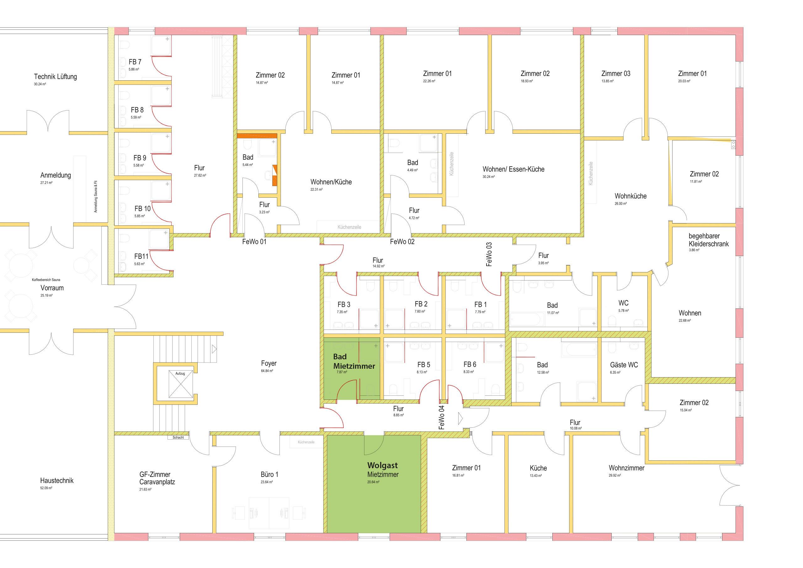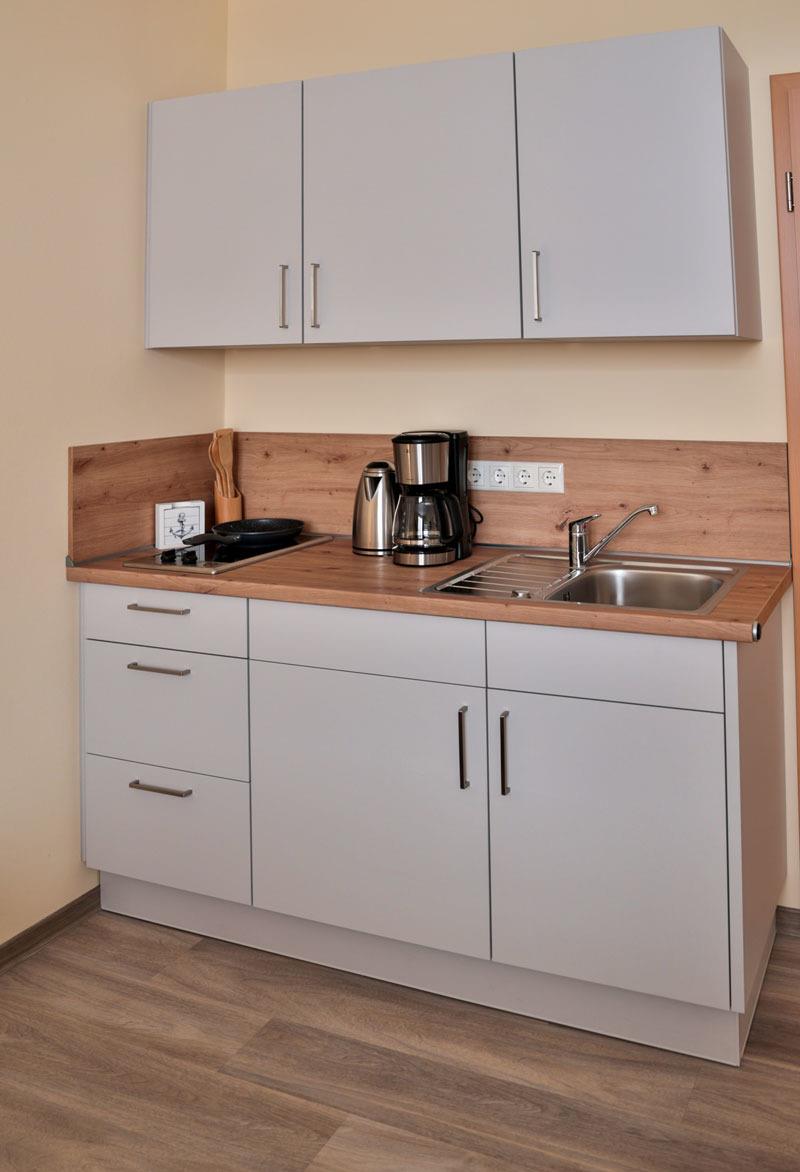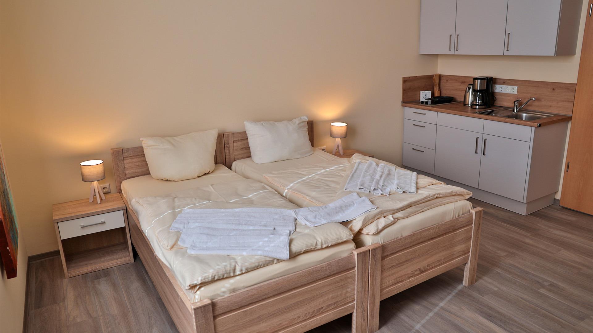 Unsere 20qm große Ferienwohnung "Wolgast" befindet sich in der 1. Etage und ist barrierefrei über einen Fahrstuhl zu erreichen. Das 1 Raum Appartment mit Küche, inkl. privates Familienbad verfügt über ein TV und eine Kochnische.