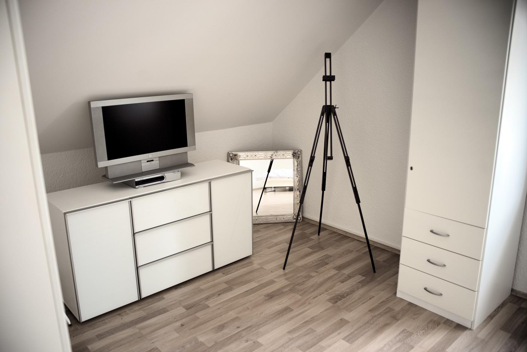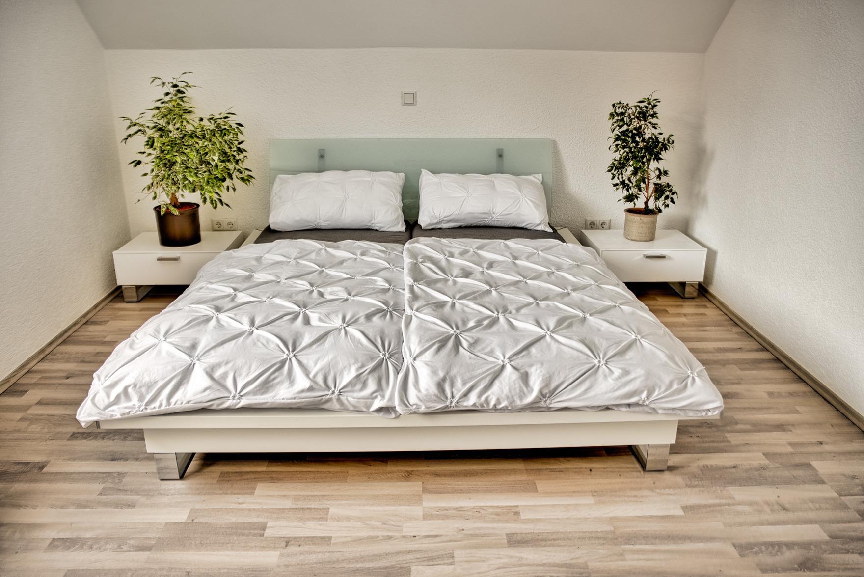 Das Schlafzimmer mit Doppelbett, Satelliten Flachbildschirm, Dimmbare Lese-Nachttisch, LED Lampe versehen mit Harmonie Steuerung, sowie dimmbares Hauptlicht mit Harmonie Steuerung, mit getrennten Kleiderschränken, Schubladen und Stauraum