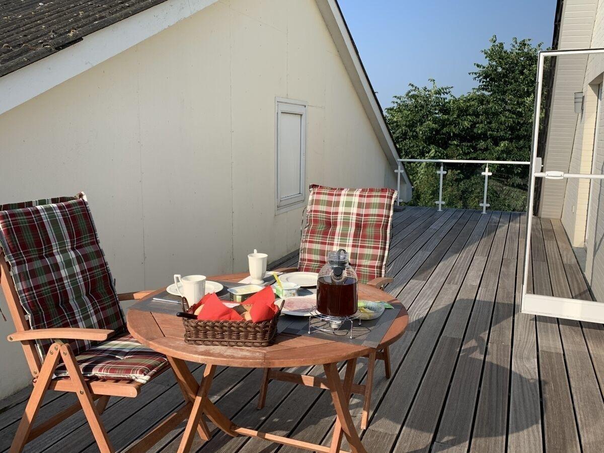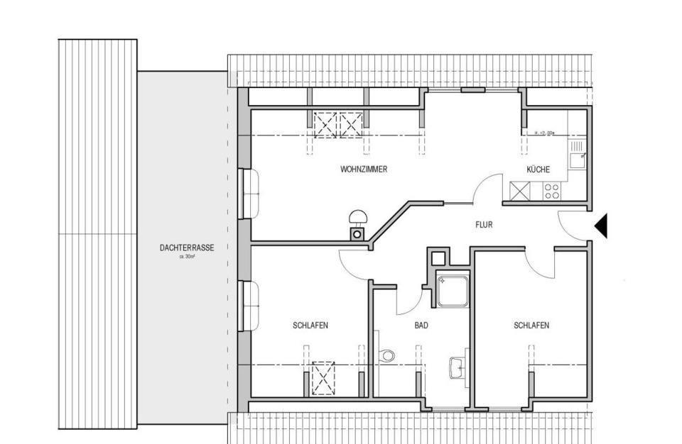 Das Objekt verfügt über 1 Wohn-/Esszimmer, 1 offene Küche, 2 Schlafräume, 1 Duschbad und 1 Dachterrasse mit herrlichem Blick auf die umliegenden Felder.