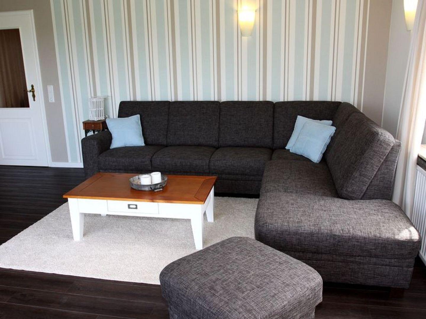 Die hellen, freundlichen Räume schaffen sofort eine angenehme Atmosphäre. Das Appartement verfügt über drei geschmackvoll eingerichtete Schlafzimmer, jedes mit ausreichend Stauraum und behaglicher Ausstattung, sodass Sie sich vom ersten Moment an wie zu Hause fühlen können. Das großzügige Wohnzimmer ist der perfekte Ort zum Entspannen und geselligen Beisammensein. Es ist mit einem bequemen Sofa ausgestattet, die zu gemütlichen Abenden einladen. Für Ihre Unterhaltung ist ein TV vorhanden, sodass Sie nach einem ereignisreichen Tag in der Region entspannen und Ihre Lieblingssendungen verfolgen können.