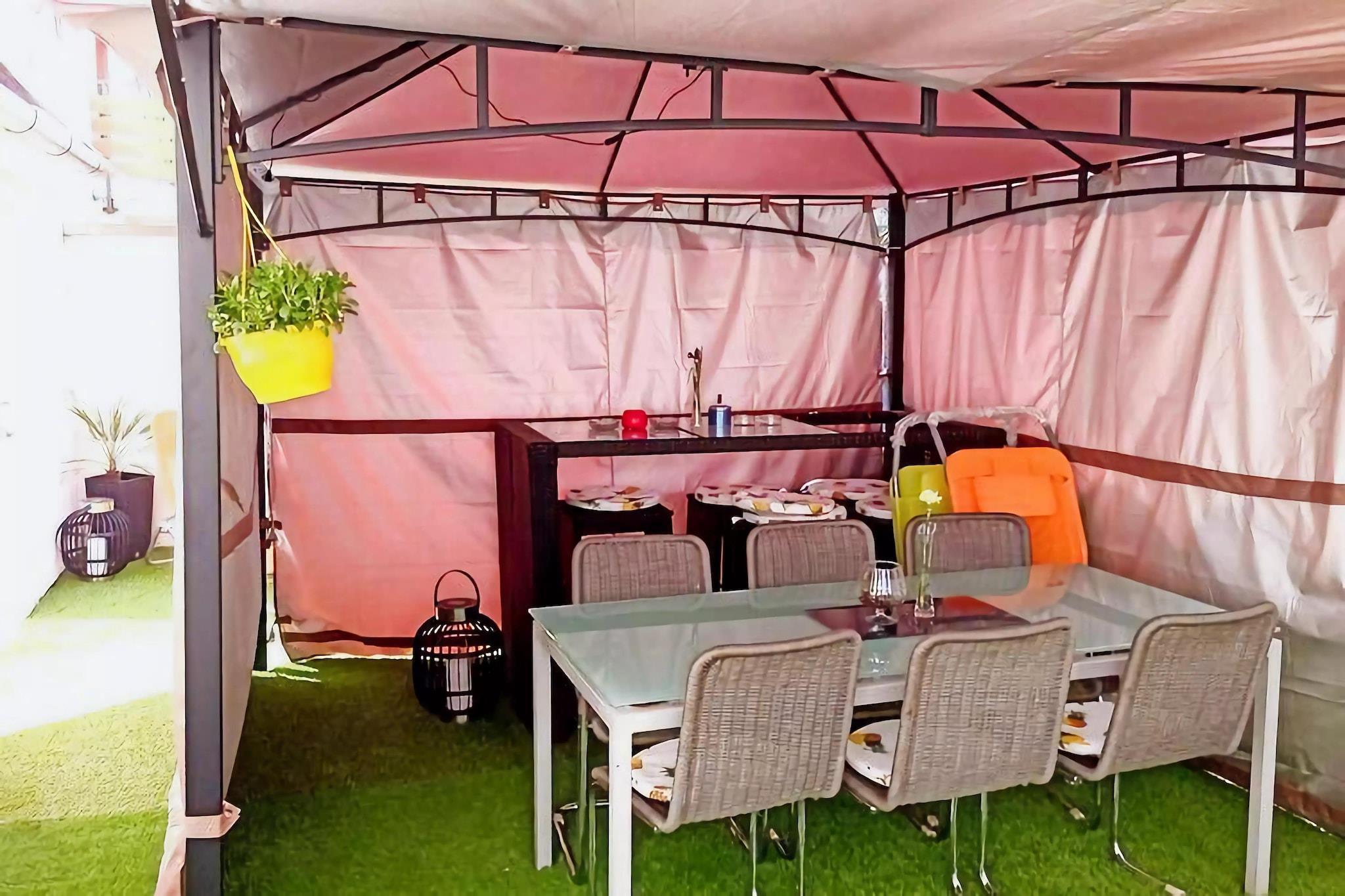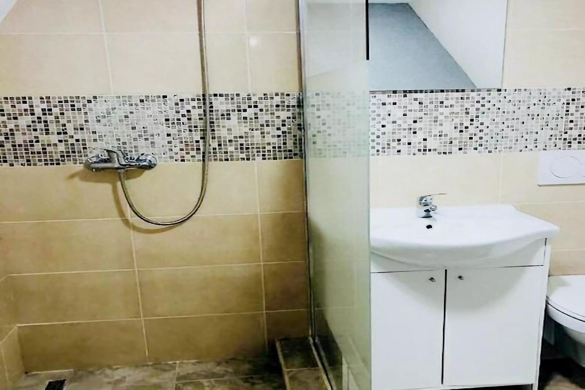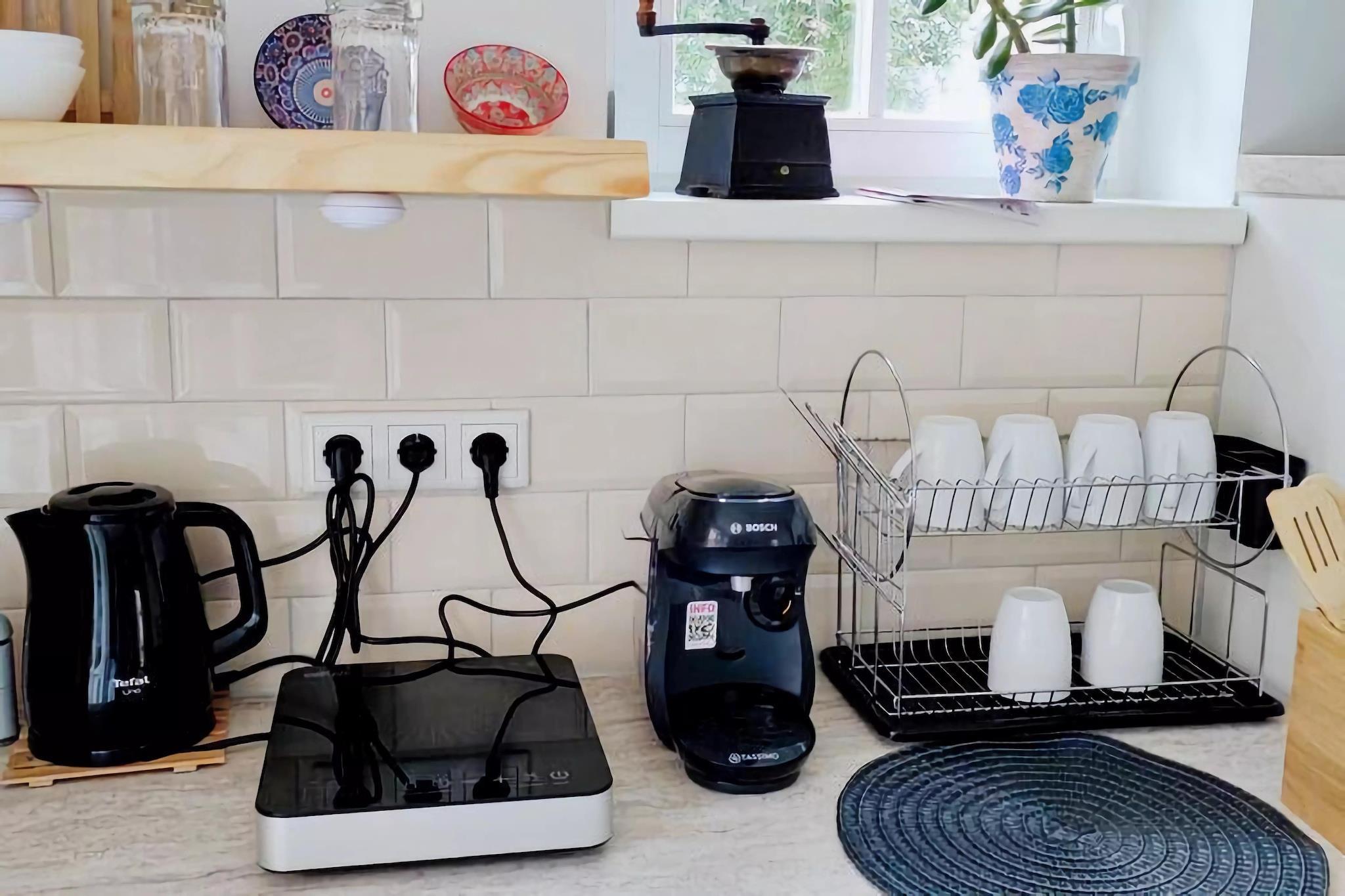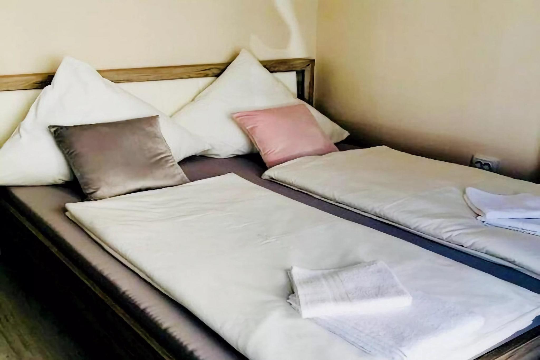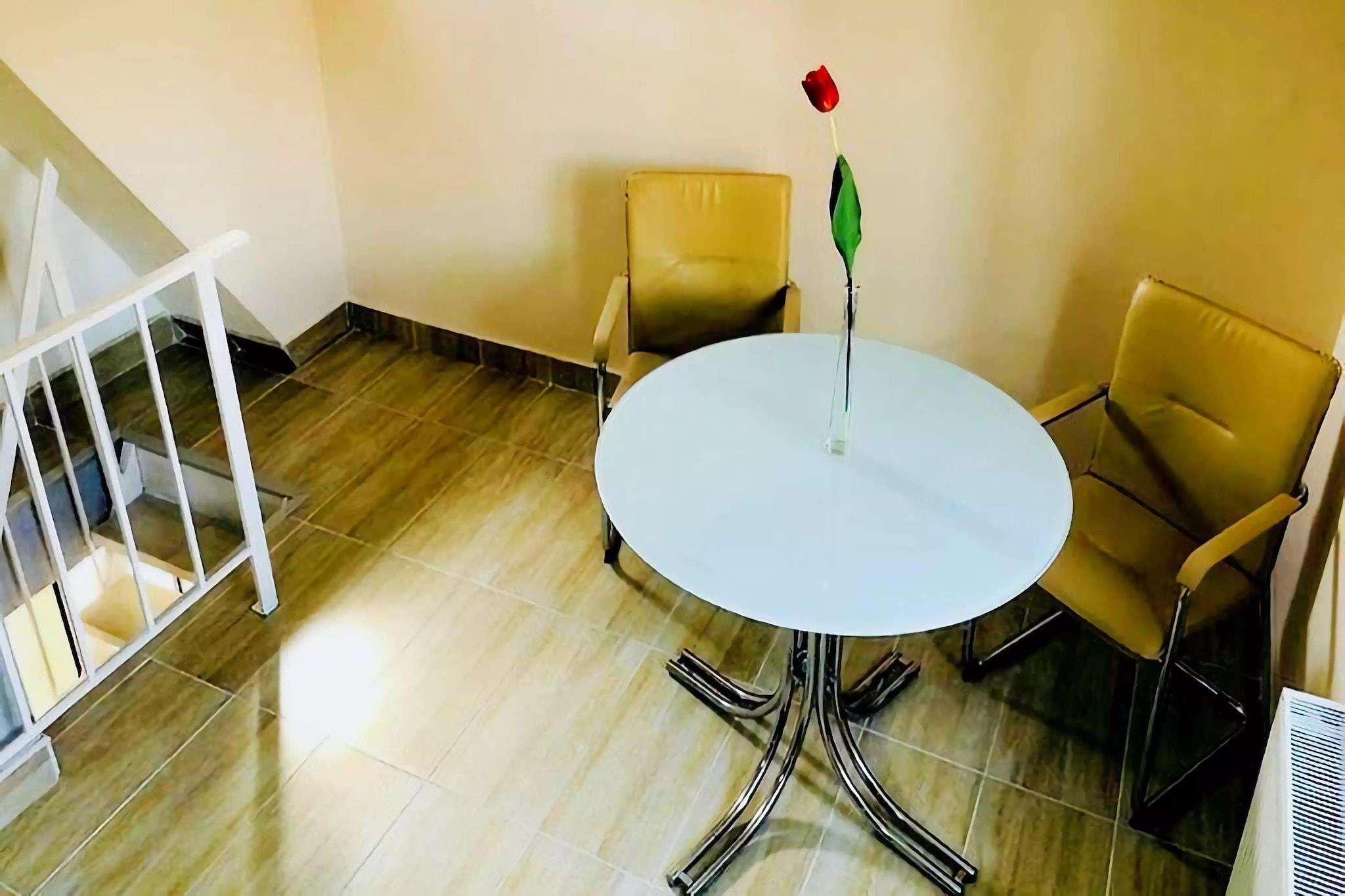 Stueetage: (køkken-alrum(sofahjørne, elkedel, kaffemaskine, køleskab), soveværelse(dobbeltseng), soveværelse(dobbeltseng eller 2 enkeltsenge Senge), badeværelse(bruser, håndvask, toilet)) På 1. etage: (fællesrum(spisebord, elkedel, komfur, kaffemaskine, ovn, køleskab), balkon eller terrasse) terrasse, parkering