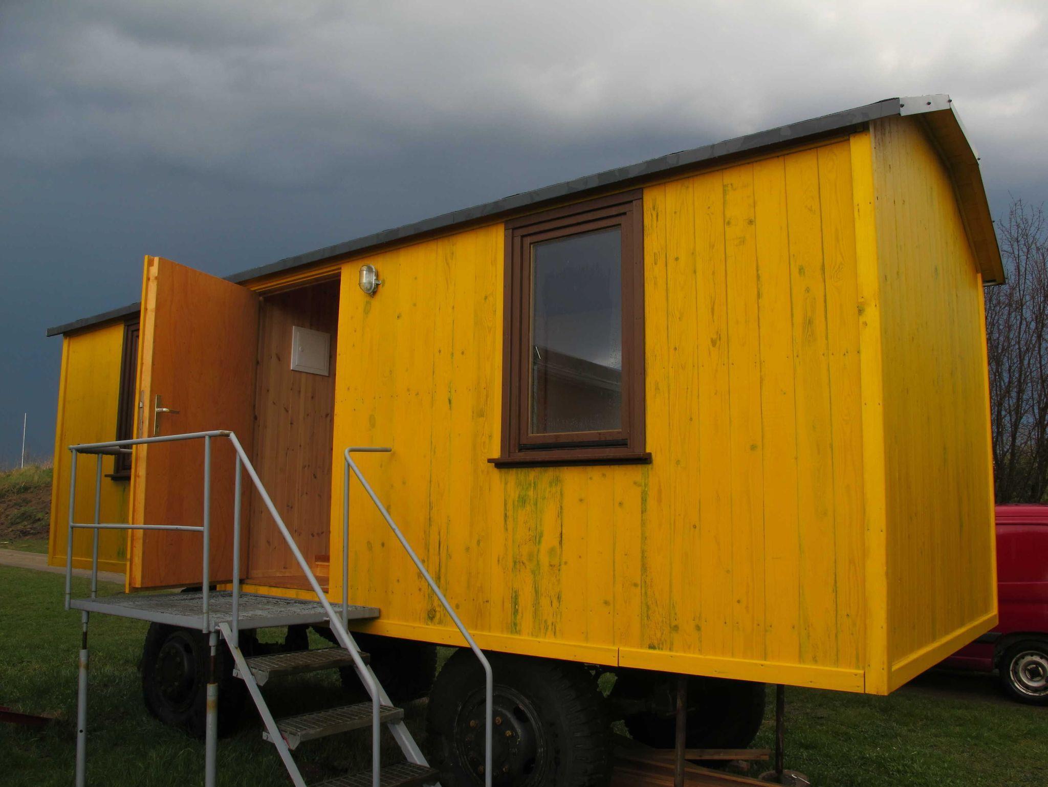 Unser Wohnwagen 2 (gelb) bietet zwei getrennte Räume, wobei der rechte Raum als Einzelzimmer gemietet werden kann. Der Wohnwagen ist einfach ausgestattet und mit einem Radiator beheizbar.