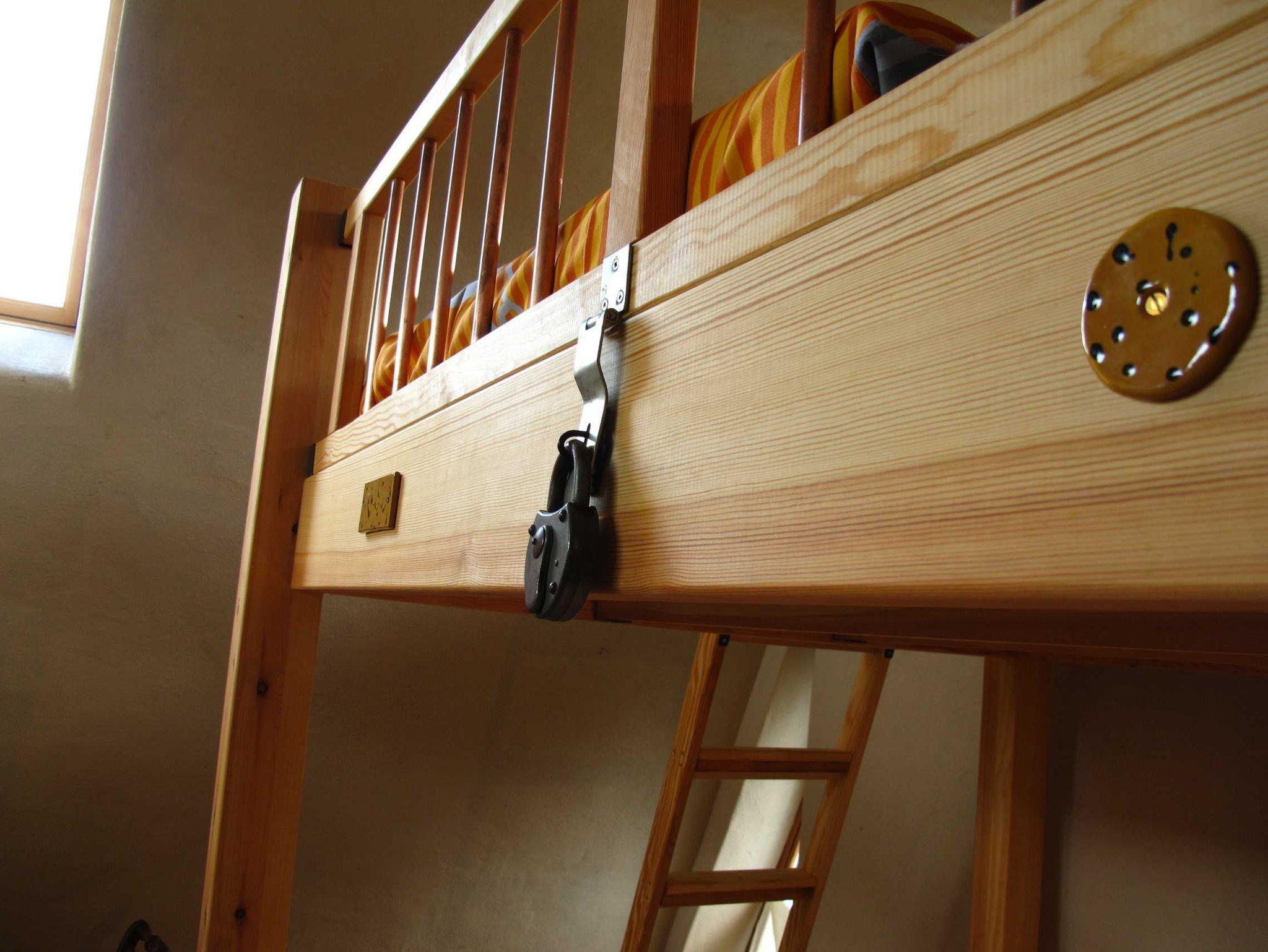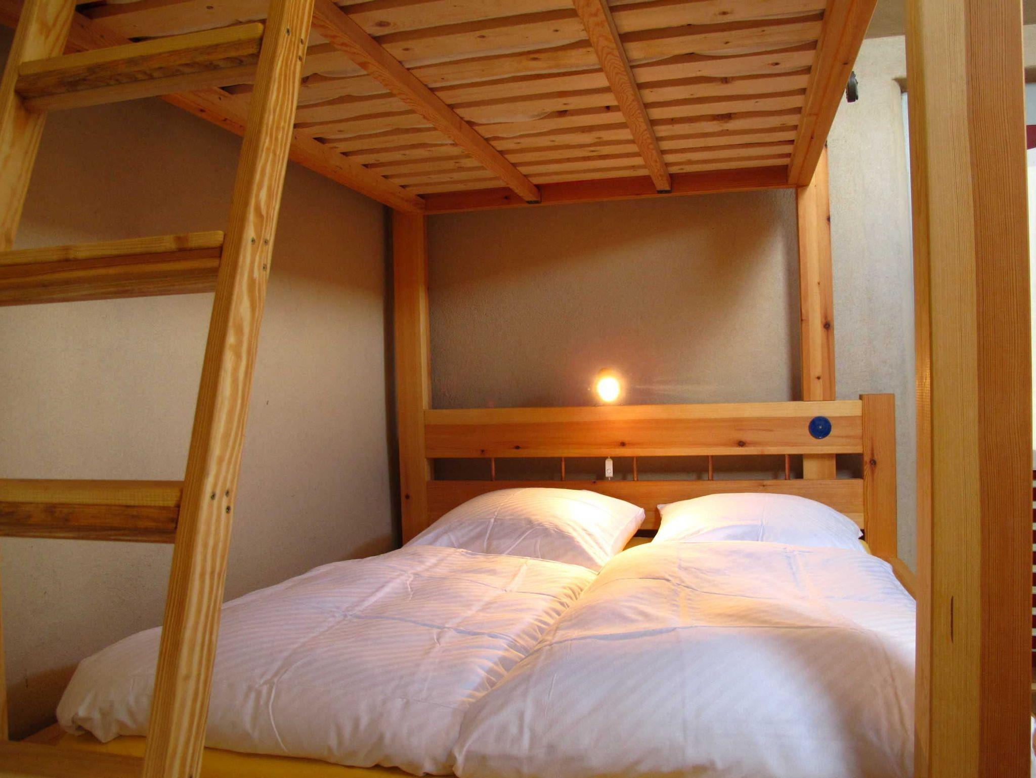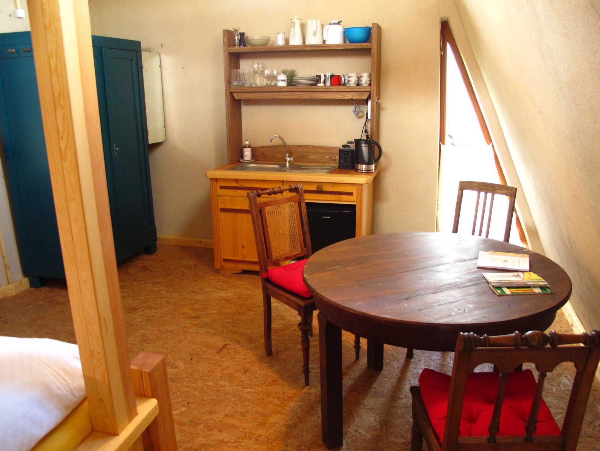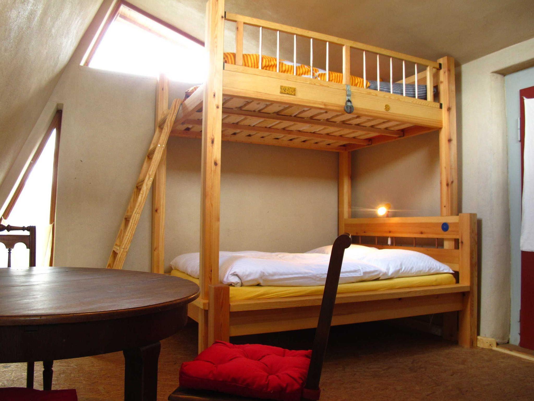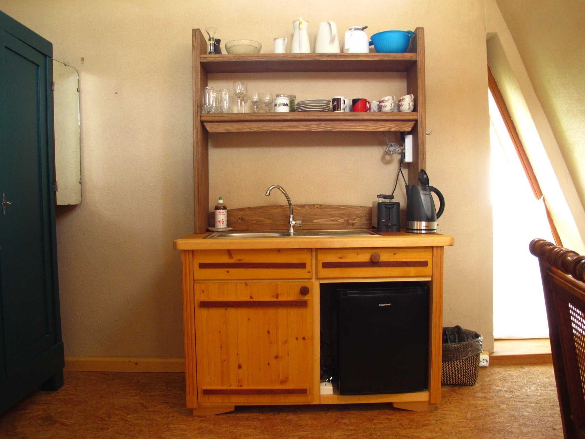 Eingerichtet ist das Zimmer mit einem 2-Etagen-Bett (Liegefläche 160 x 200cm + 140 x 200 cm), einem ausziehbaren Tisch, Stühlen und einem Schrank. In der im Zimmer integrierten kleinen Küche können Sie sich als Selbstversorger Ihr individuelles Frühstück zubereiten. Dazu stehen Ihnen ein Kühlschrank, Wasserkocher, Toaster, Geschirr usw. zur Verfügung.