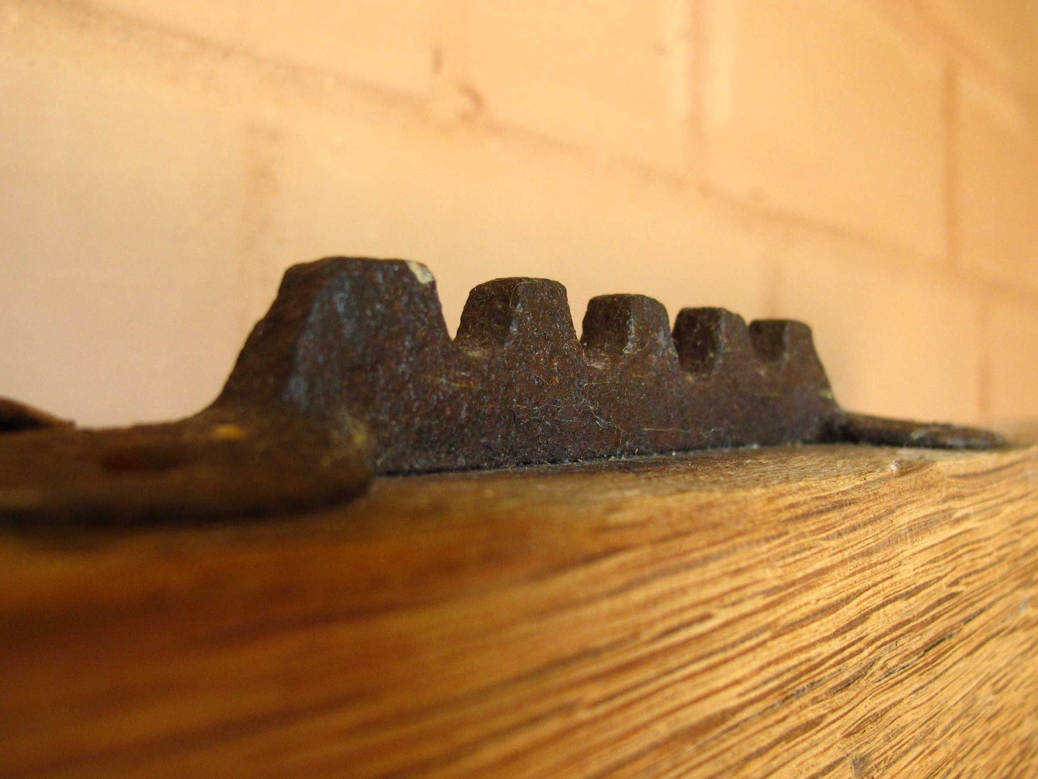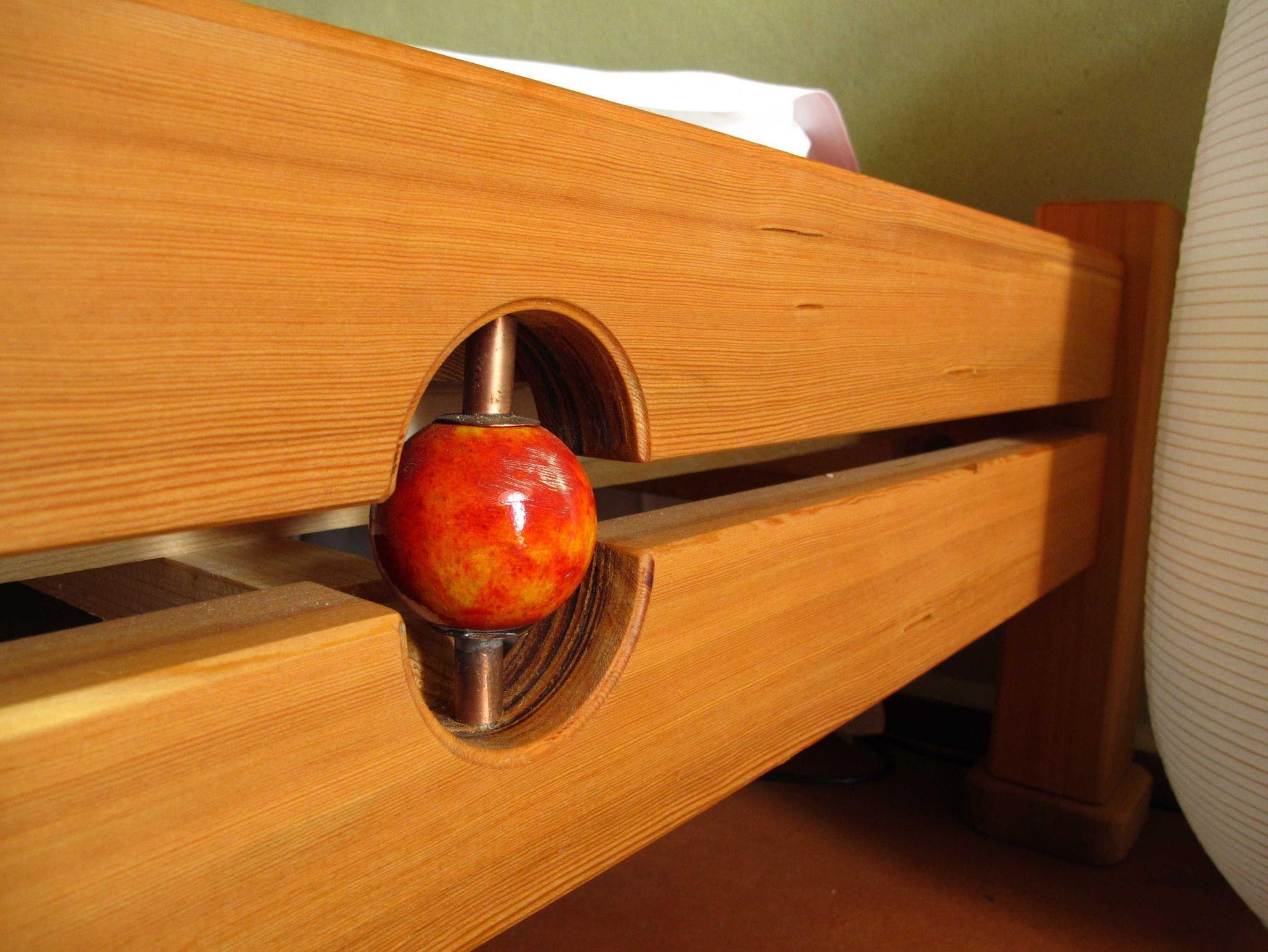 Das Doppelbett (160 x 200 cm) wurde von einem Holzgestalter aus Teilen uralter Webstühle, in Kombination mit Metall und Stein, von Hand gefertigt.