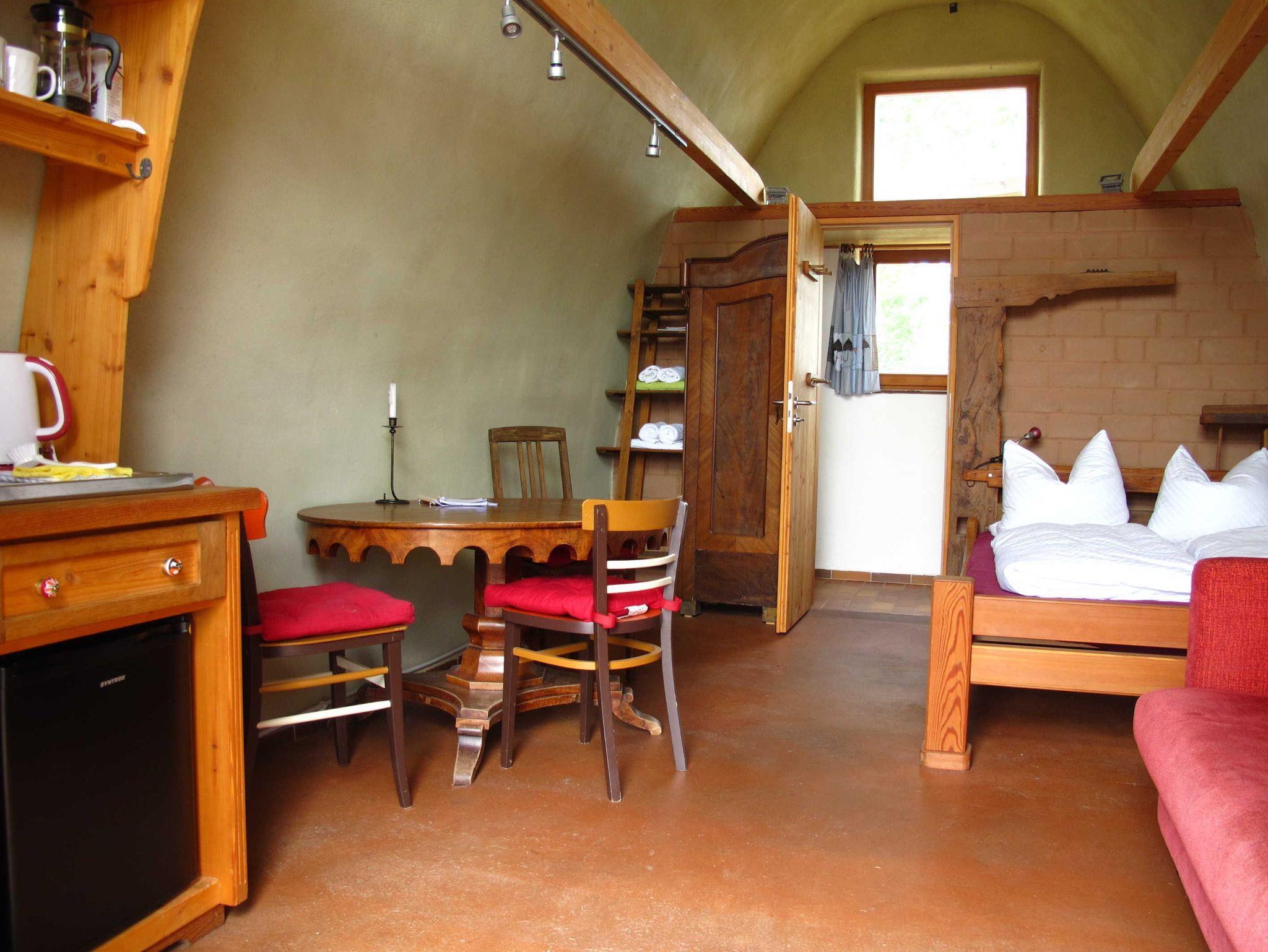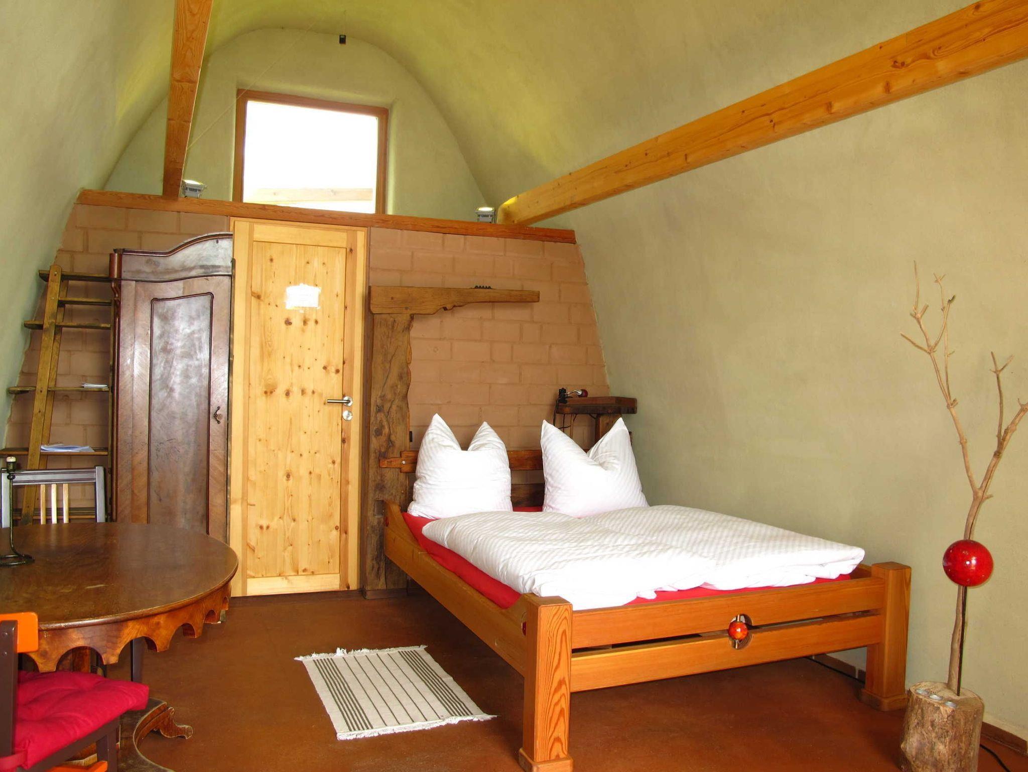 Das 17qm große Doppelzimmer ist eines von fünf Ferienzimmern in unserem aus Strohballen und Lehm gebauten Gästehaus. Es gibt dem Besucher ein besonderes Wohngefühl durch die gewölbeähnliche Raumgestaltung. Es hat einen separaten Zugang von außen und ist mit einem eigenen Bad (Dusche und WC) ausgestattet.