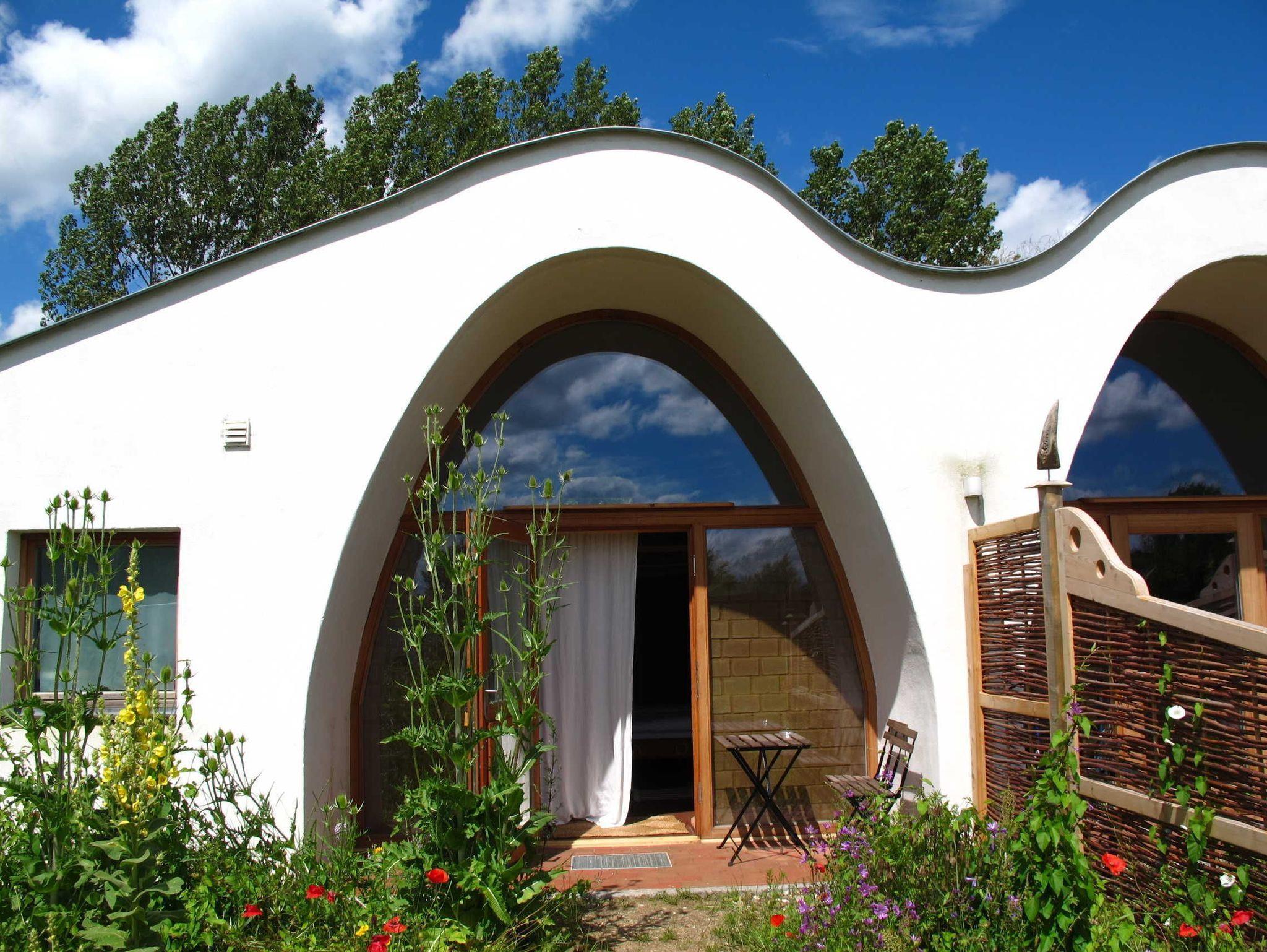 Die Tonnen, wie die einzigartigen, geschwungenen Ferienunterkünfte auf dem Wangeliner Gartengelände intern genannt werden, wurden von einem engagierten Team um Professor Gernot Minke erbaut. Im Jahr 2015 fertiggestellt, sind diese Gästeunterkünfte ein außergewöhnliches Meisterwerk. Sie sind der erste selbsttragende Tonnengewölbebau aus Strohballen, der in Deutschland genehmigt wurde.