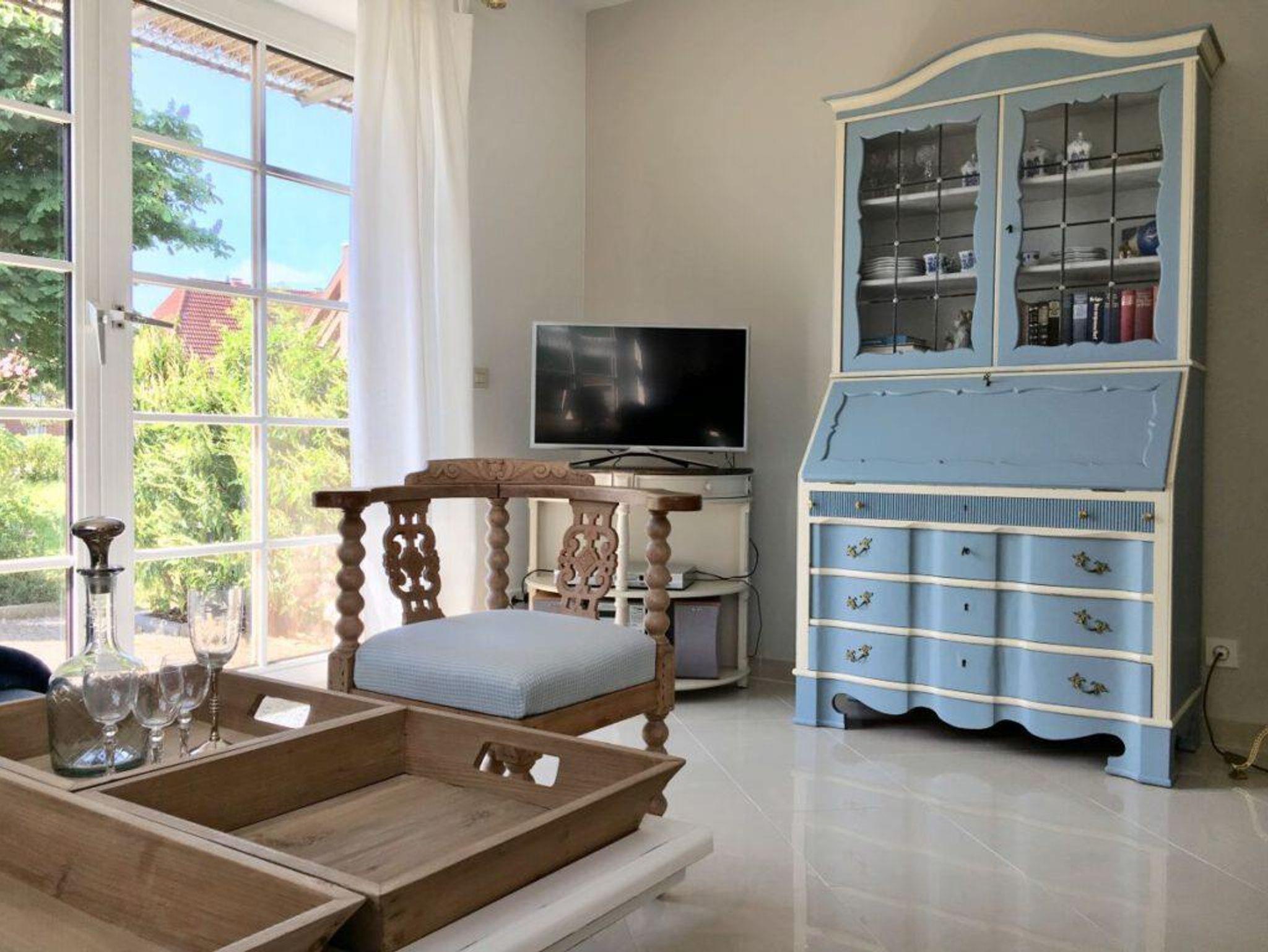 Heller freundlicher Wohnraum mit bequemer Polstercouch, SAT-TV, DVD- und CD- Player, MP3-Würfel Schreibsekretär, Kamin und Essbereich, Insektenschutztür.