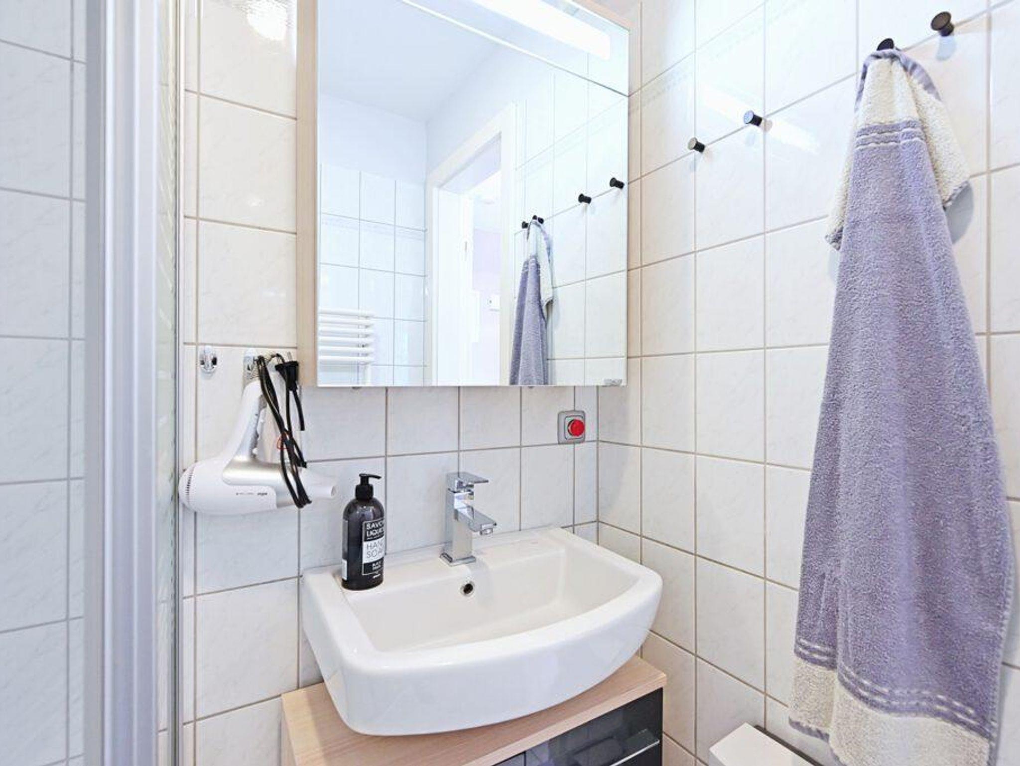 Duschbad mit ausreichenden Abstellmöglichkeiten.