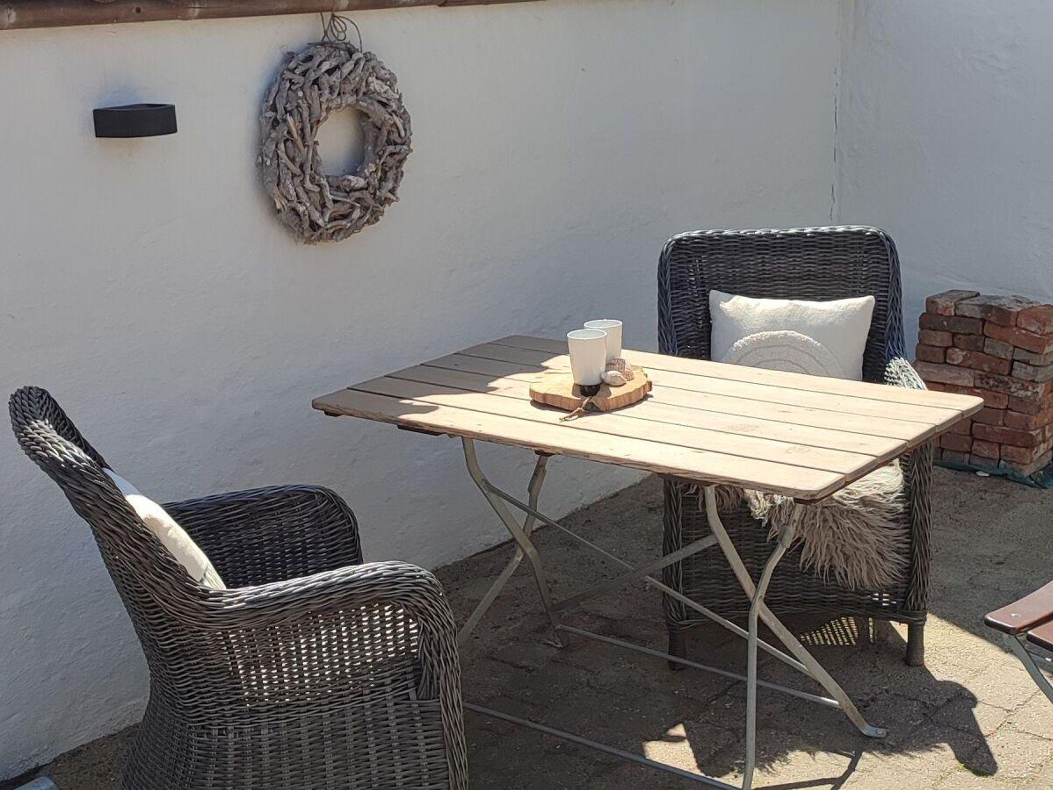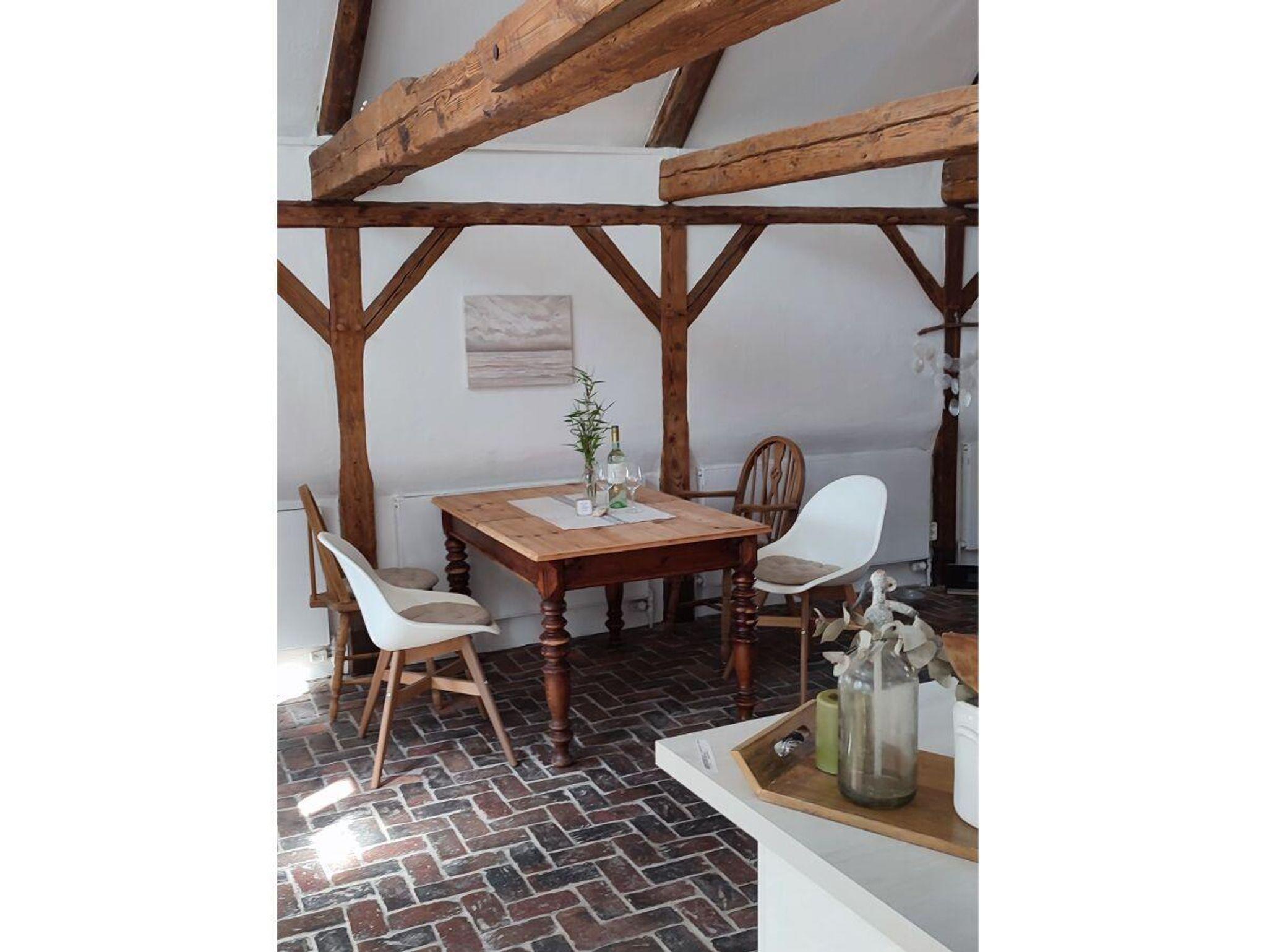 Die Küche ist in den Wohnbereich integriert und bietet viel Platz, um die historische Balkenlage zu bestaunen. Die gemütlichen Sitzecke lädt zum Verweilen ein und der windgeschützte Außenbereich mit mehreren Sitzmöglichkeiten bietet einen Blick auf die Gardinger Altstadt. Auf der Galerie befindet sich das Hier kann man wunderbar die Sonne genießen. Der Außenbereich ist eingezäunt und Hunde sind bei uns herzlich willkommen. Das Haus liegt im Zentrum von Garding in der Altstadt, gegenüber hinter der Apotheke befindet sich ein Parkplatz.