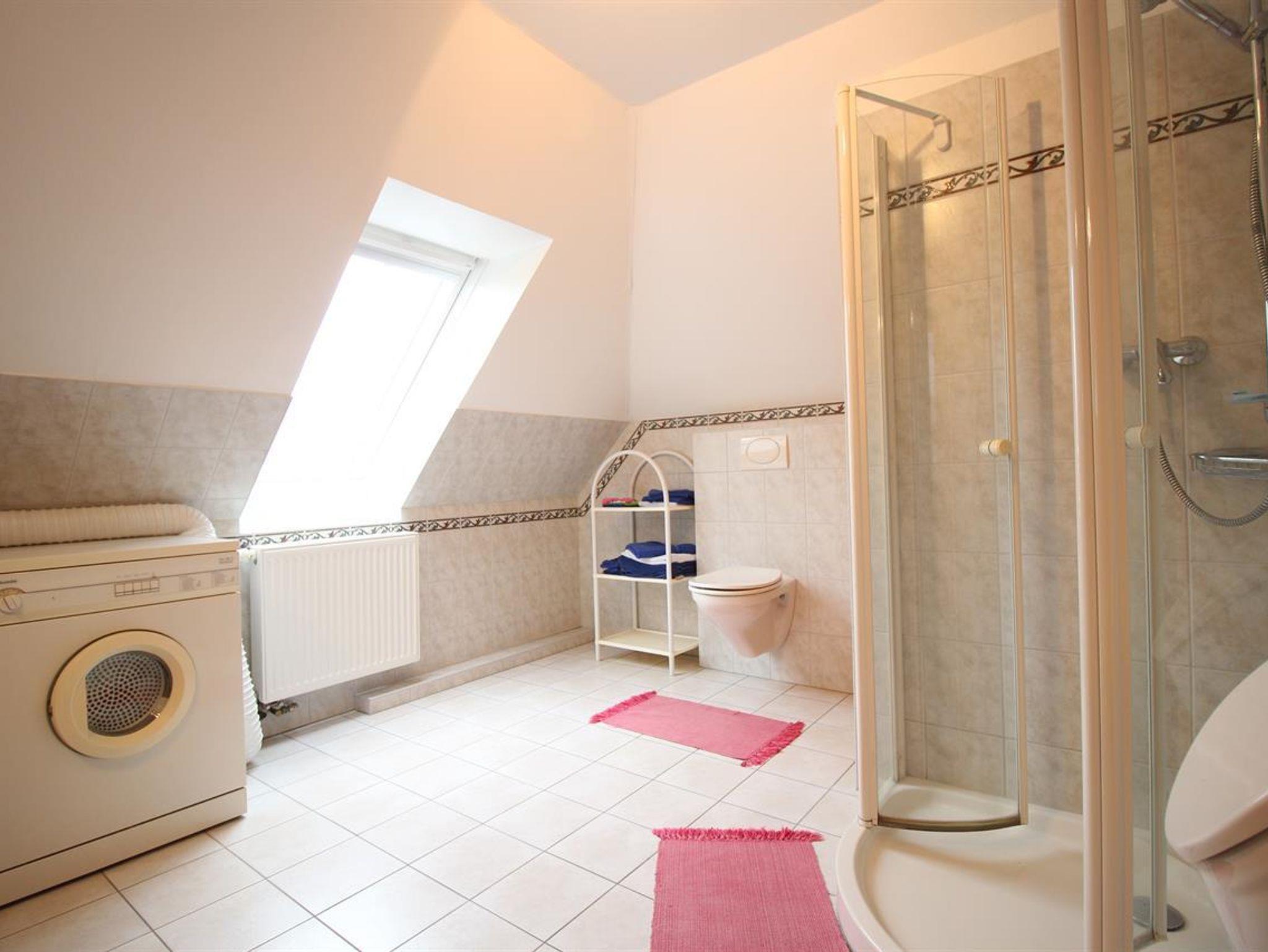 Im Duschbad sind eine Waschmaschine und ein Trockner vorhanden.