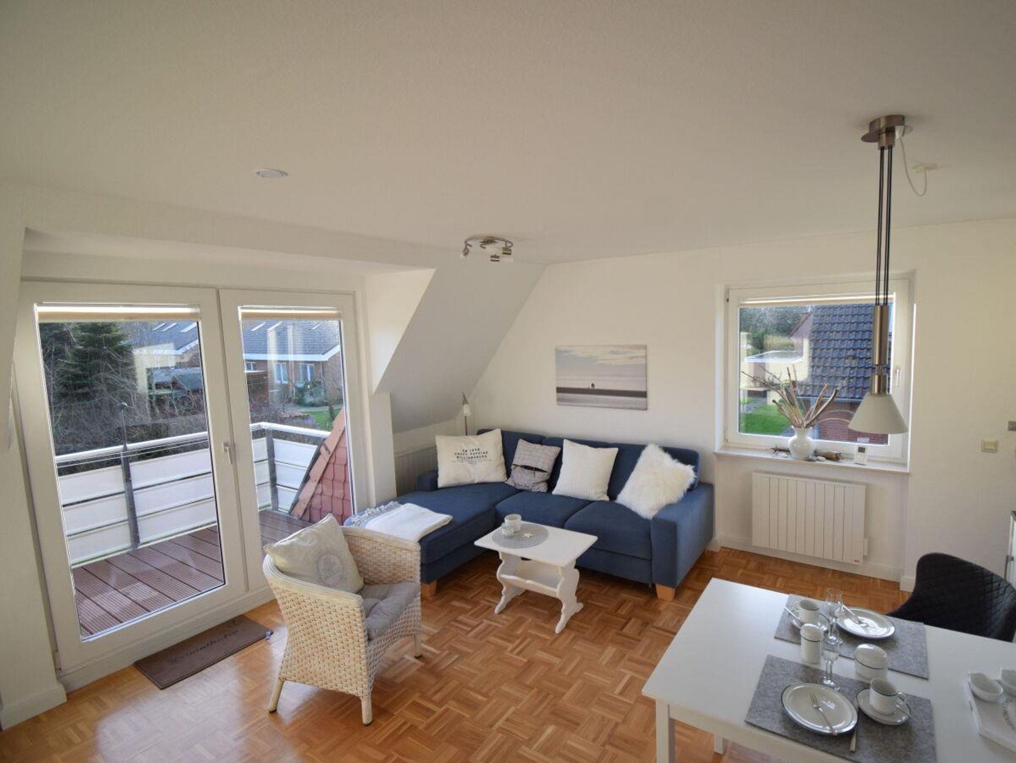 Das Schlafzimmer mit einem Doppelbett in der Größe 160x200 cm und der Wohnraum sind mit einem schönen Parkettboden ausgestattet. Das blaue Sofa im Wohnraum lädt ein zum gemütlichen Verweilen.