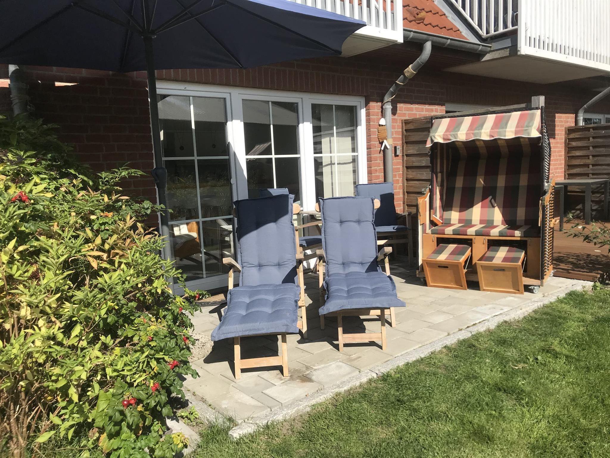 • Außenbereich (Privat) Terrasse, Strandkorb, 2 Liegen ( Deck-chairs ), Gartenstühle mit Tisch, Sonnenschirm, 2 Fahrräder stehen kostenfrei zur Verfügung