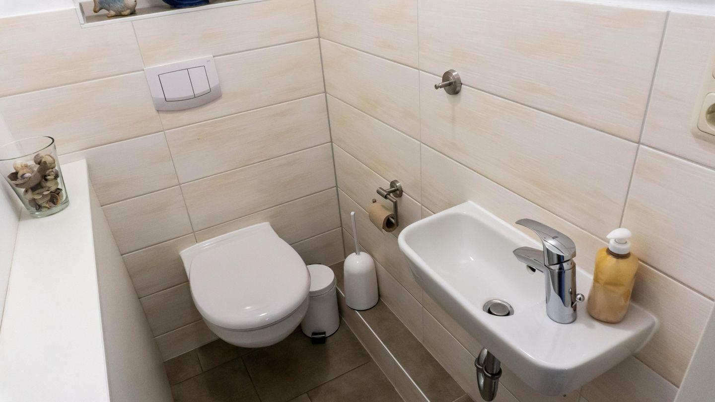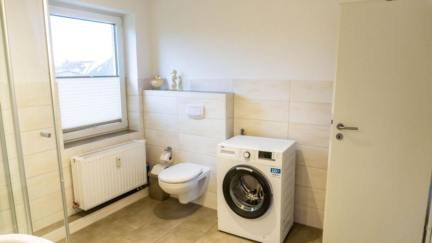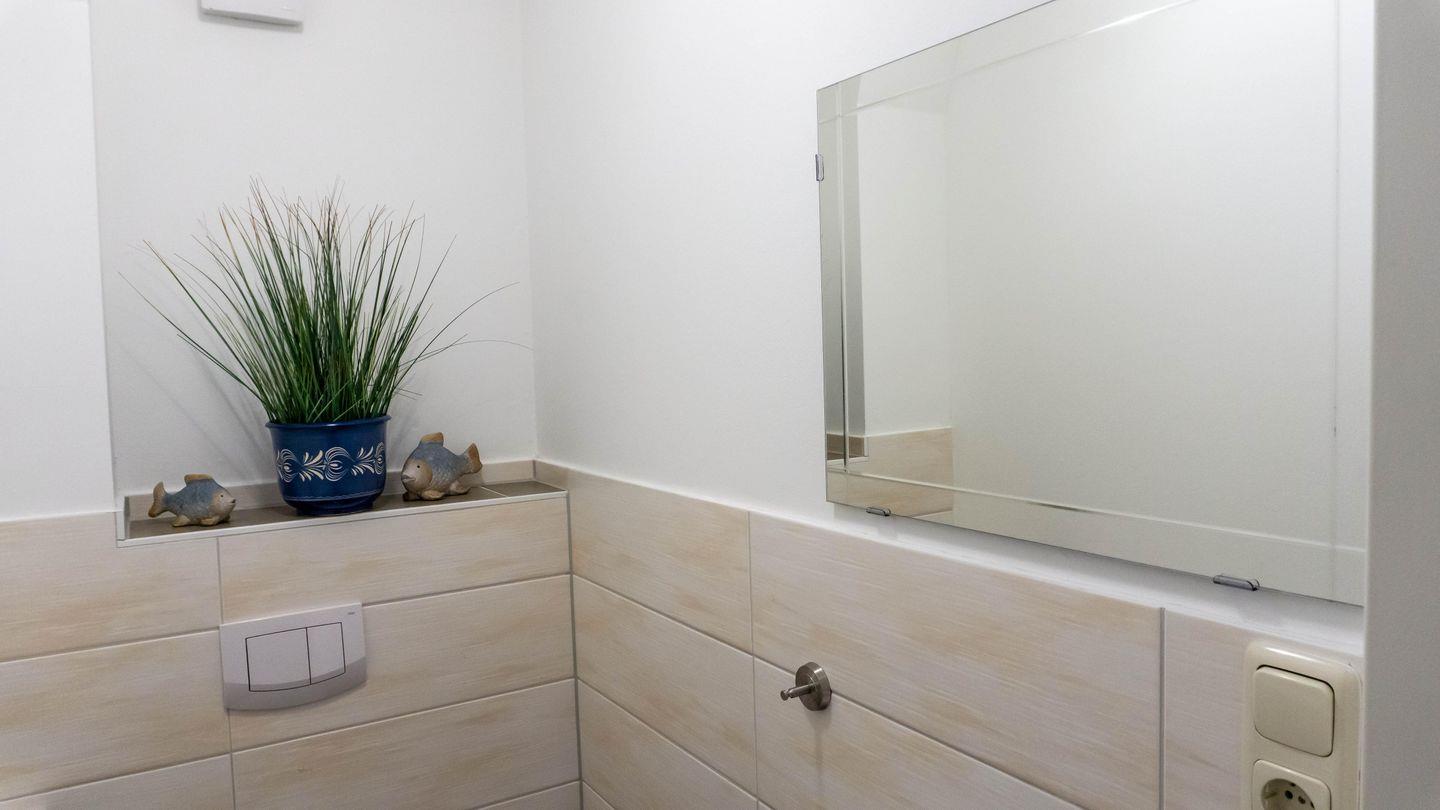 Das Appartement verfügt über einen Wohn-Essraum, 2 separate Schlafzimmer, eine offene Küche mit Geschirrspülmaschine, ein Duschbad mit Waschmaschine und ein zusätzliches Gäste-WC. Alle Räume sind gefliest oder mit Laminat ausgelegt.