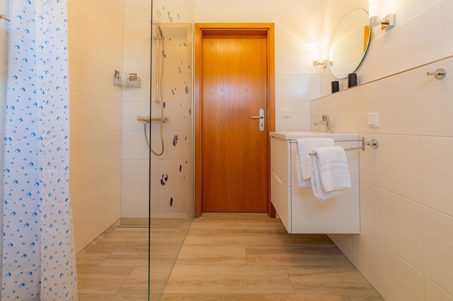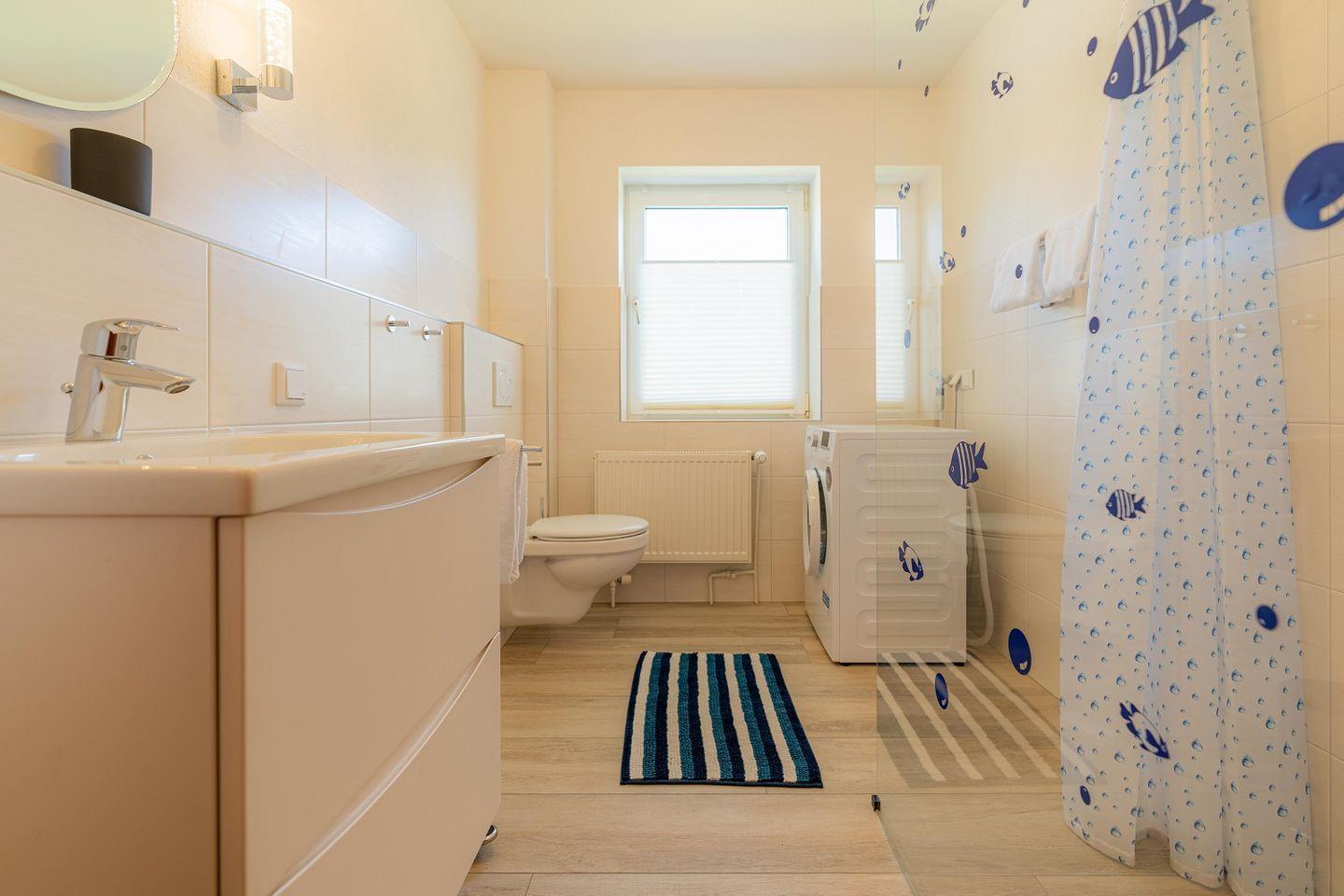 Duschbad mit ebenerdiger Dusche, Föhn und Waschmaschine