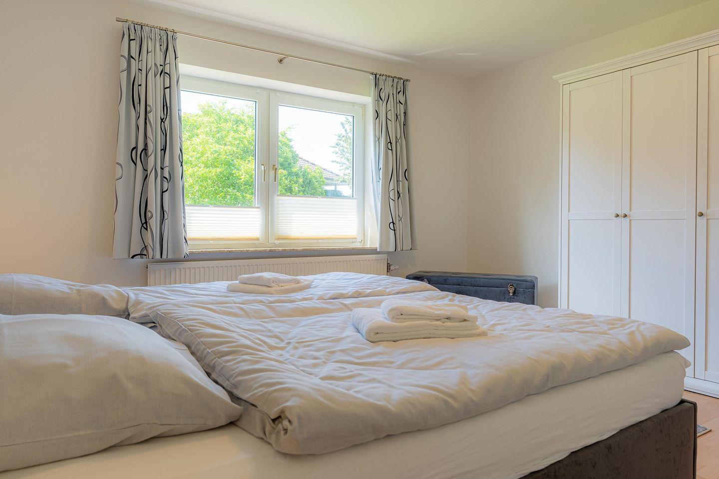 Schlafzimmer mit Doppelbett und Kleiderschrank,