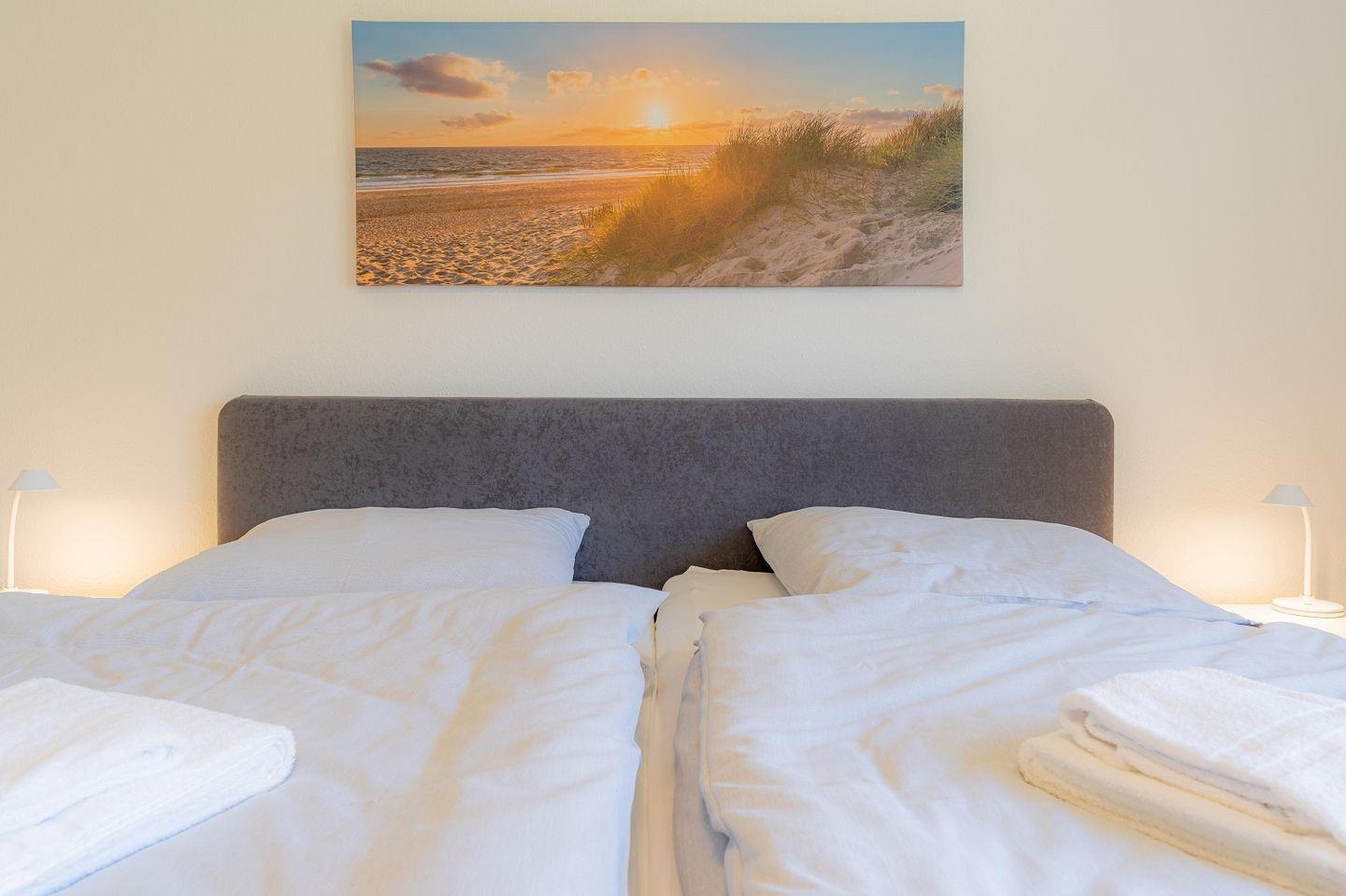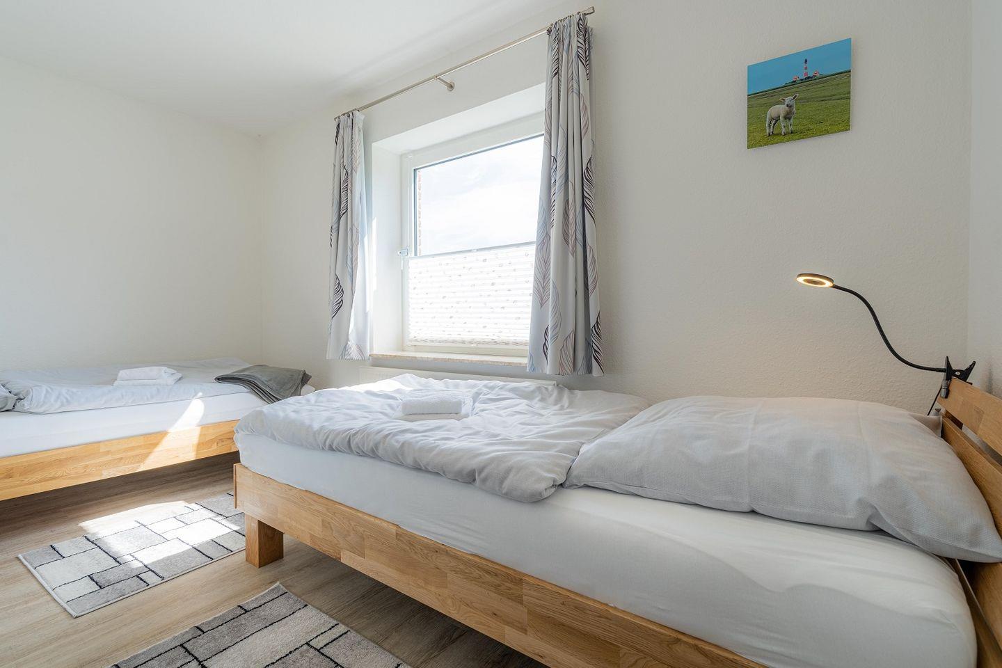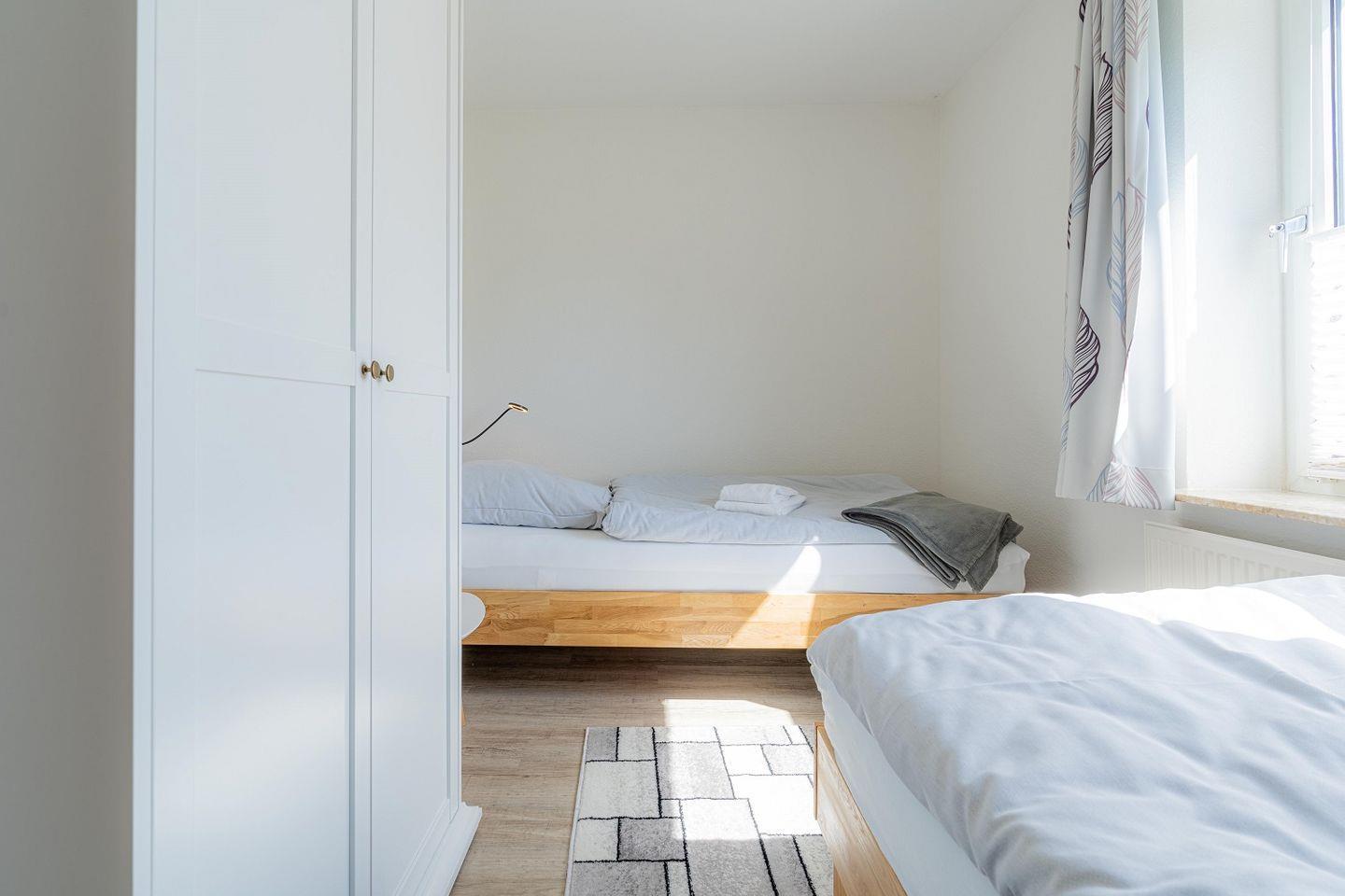Schlafzimmer mit 2 Einzelbetten und Kleiderschrank.