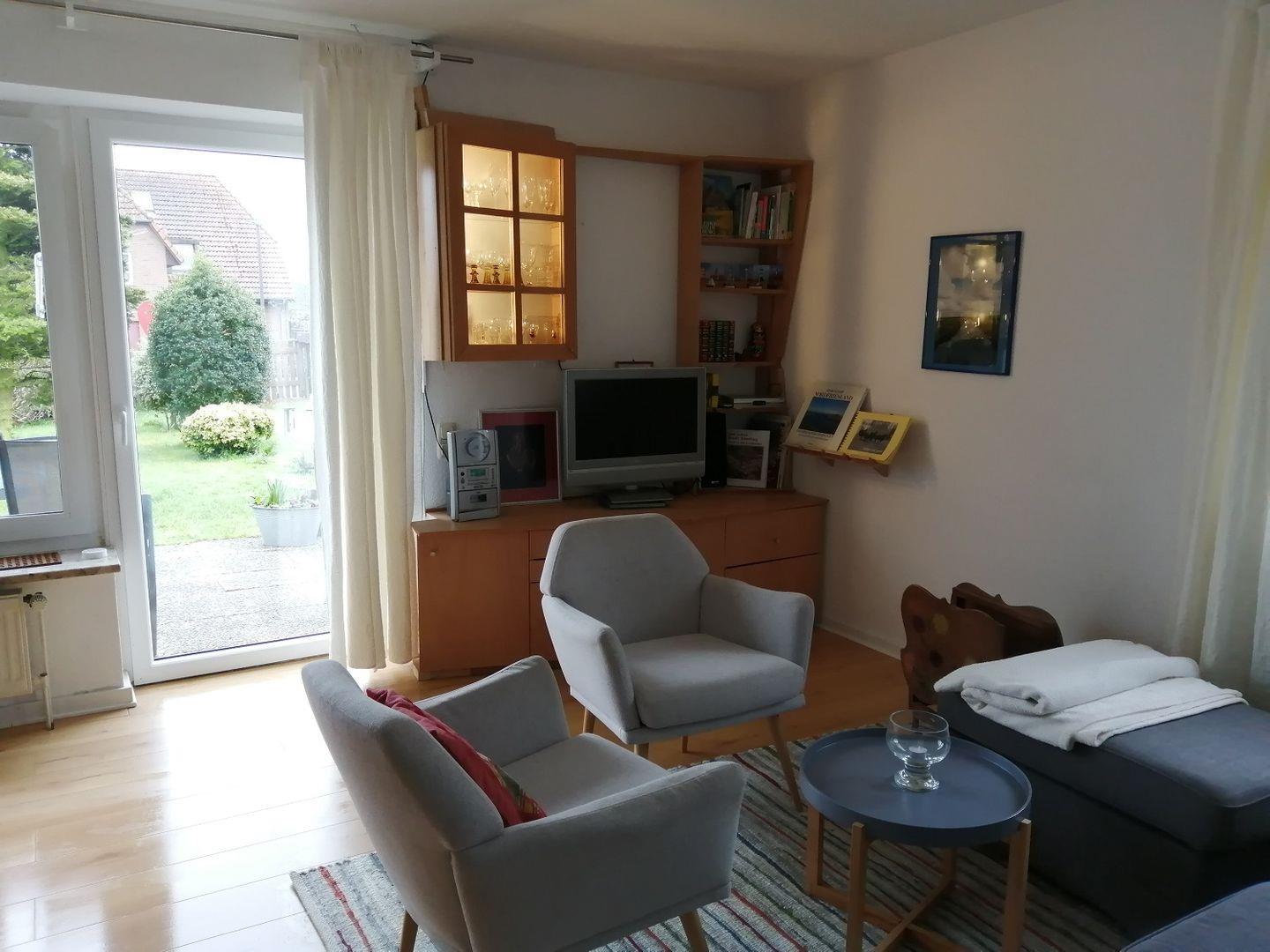 Wohnzimmer mit 3er-Sofa und drei Sesseln, Esstisch für sechs Personen, ein Kinderhochstuhl, Satellit-Fernseher, Stereoanlage mit CD-Player.