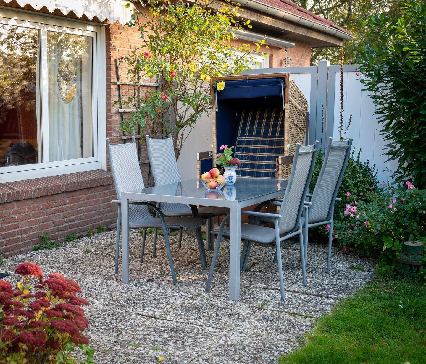 2 Terrassen: mit Glas überdachte Veranda im hinteren Garten mit Blick auf den Spielbereich und eine Sonnenterrasse mit Markise im vorderen Garten mit Zugang aus dem Wohnzimmer, Strandkorb (im Sommer).