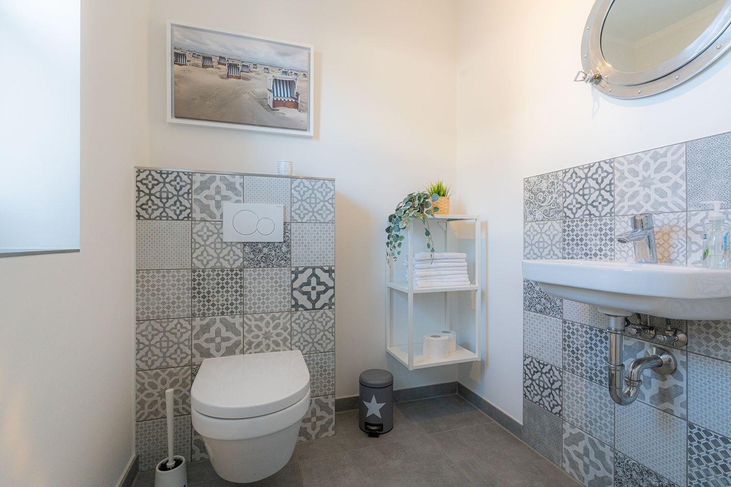 Gäste WC; Hauswirtschaftsraum mit Waschmaschine und Gefrierschrank.
