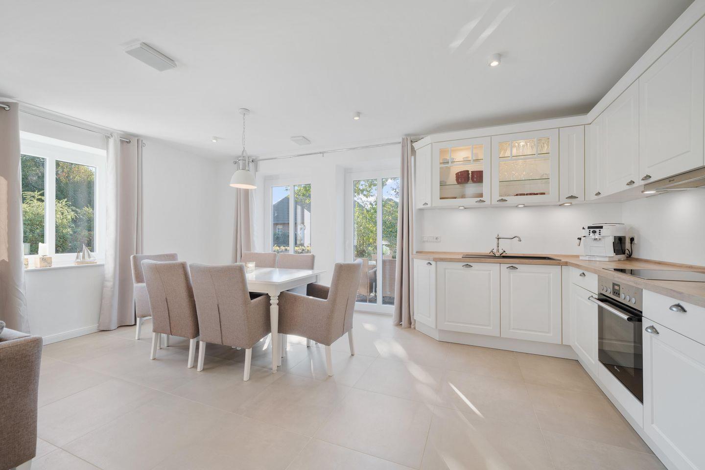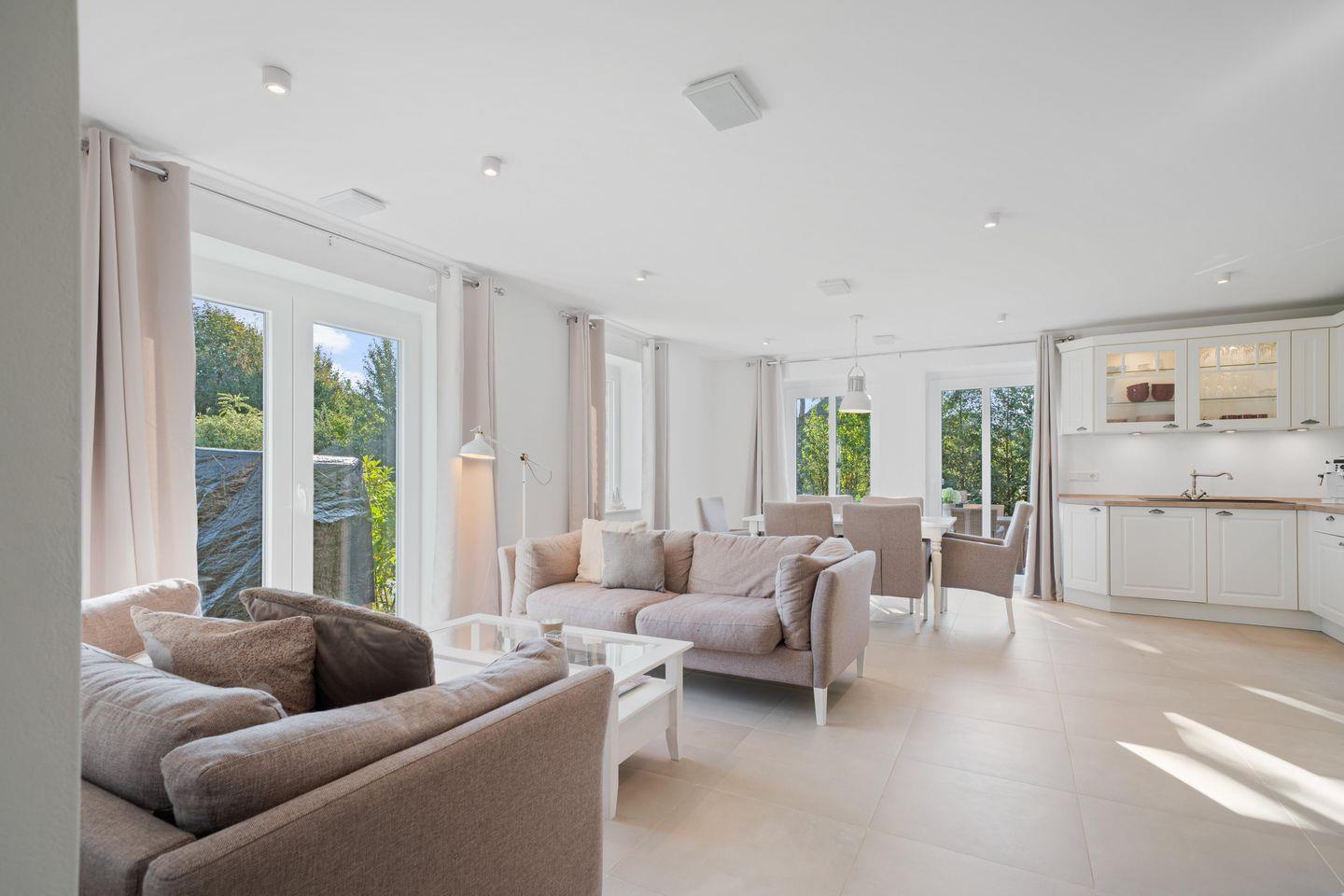 Der offene Wohn- und Essbereich im Erdgeschoss lädt mit einem gemütlichen Kamin, einer Sofaecke und großem Esstisch zu geselligen Abenden ein. Die voll ausgestattete Küche verfügt über Ceranherd, Backofen, Spülmaschine und eine umfassende Küchenausstattung, sodass Selbstversorger bestens ausgestattet sind. Fußbodenheizung in allen Räumen, kostenfreies WLAN, Digital-TV und eine HiFi-Anlage runden den Wohnkomfort ab. Waschmaschine, Trockner, Bügeleisen und Bügelbrett stehen ebenfalls zur Verfügung, was das Ferienhaus ideal auch für längere Aufenthalte macht.