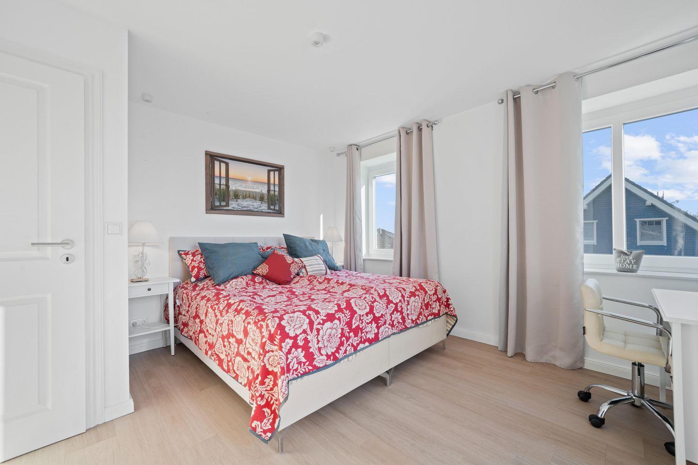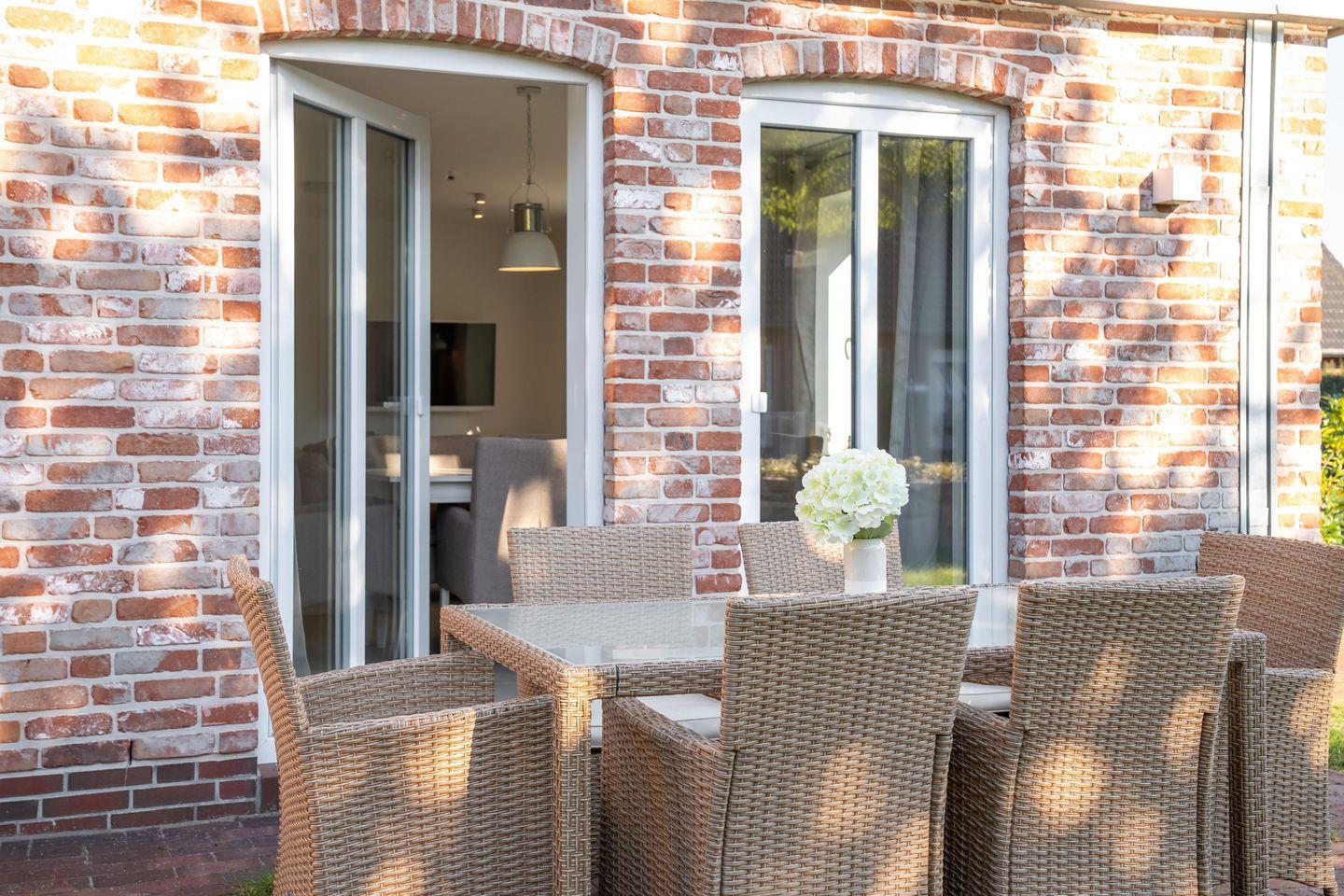 Das Erdgeschoss öffnet sich zur überdachten Terrasse mit Grill. Im weitläufigen Garten mit Liegewiese, Gartenmöbeln und eigenem Strandkorb genießen Sie entspannte Stunden an der frischen Nordseeluft. Auch ein Balkon mit Blick ins Grüne sorgt für erholsame Momente. Für Autos steht ein privater, kostenfreier Parkplatz direkt am Haus bereit.