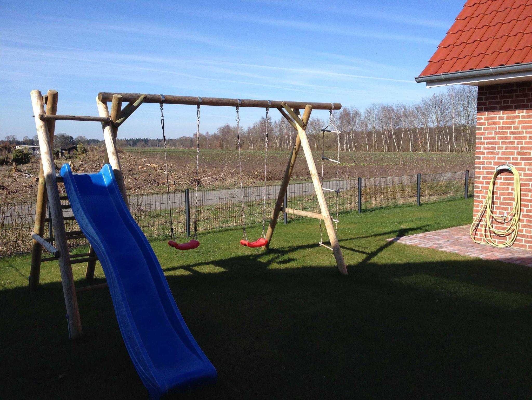Im Garten befindet sich ein Grill sowie Kinderspielgeräte (Rutsche, Schaukeln und Kinderkettcar).