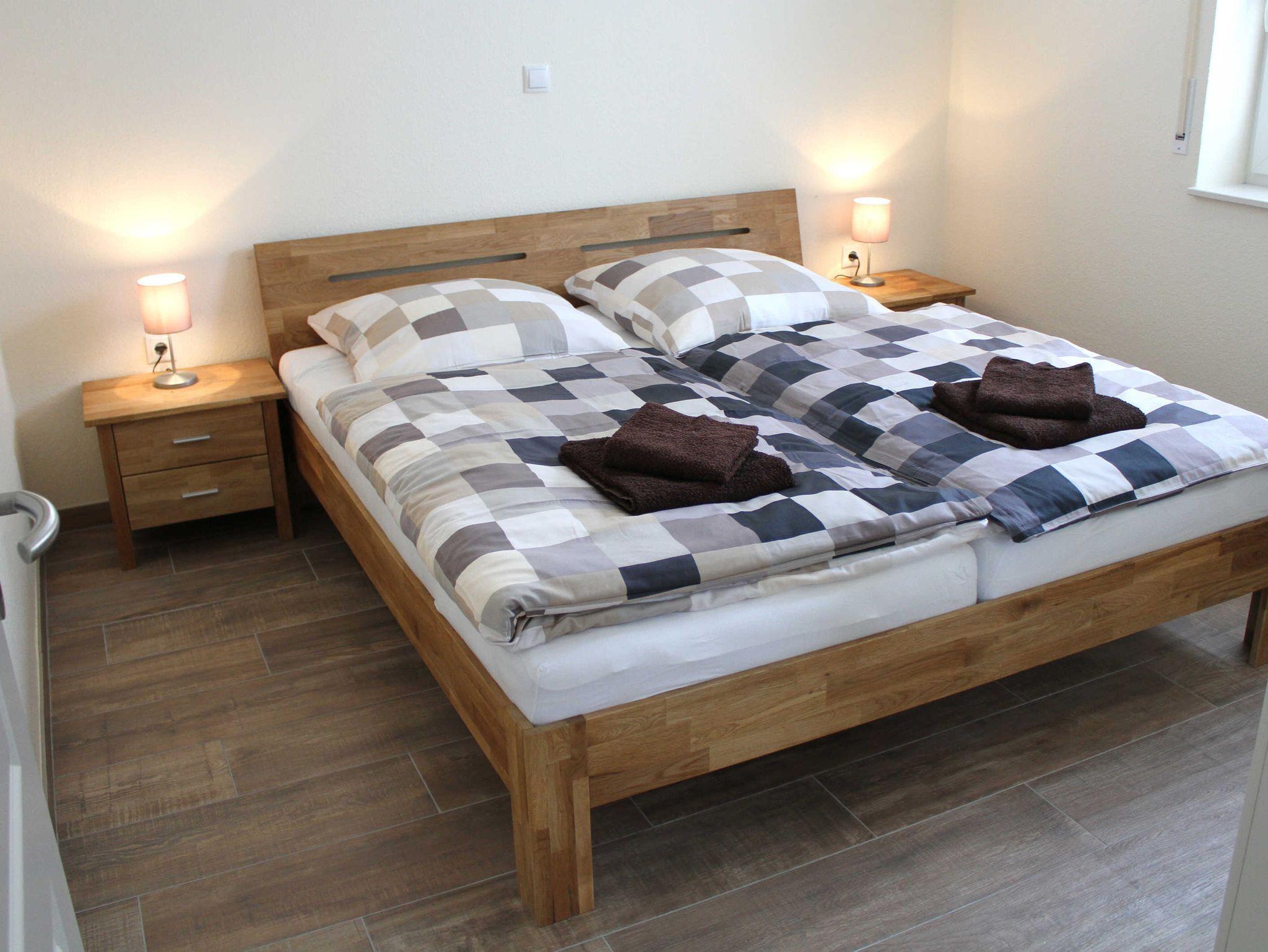 Das Ferienhaus verfügt über sechs Schlafplätze verteilt auf vier Schlafzimmer (zwei Doppelzimmer (je ein Doppelbett mit den Maßen 1,80 m x 2,00 m), zwei Einzelzimmer (je ein Bett mit den Maßen 1,40 m x 2,00 m bzw. 0,90 m x 2,00 m)). Bei Bedarf kann ein Babybett zur Verfügung gestellt werden. Darüber hinaus gibt es zwei Badezimmer, eines im Erdgeschoss und eines im Obergeschoss. Diese sind jeweils mit einer Dusche, Toilette und Waschbecken ausgestattet. Eine Waschmaschine sowie ein Wäscheständer sind ebenfalls vorhanden. Der offene Wohn- und Essbereich ist mit einer modernen Küchenzeile (E-Herd, Spülmaschine, Mikrowelle, Kaffeemaschine, Wasserkocher und Toaster) und einem Esstisch für sechs Personen ausgestattet. Bei Bedarf wird ein Kinderhochstuhl zur Verfügung gestellt. Ebenfalls befindet sich im Wohn- und Essbereich eine Sofaecke, ein Kaminofen sowie ein Flachbildfernseher und eine Wii-Spielekonsole. Ein weiterer Flachbildfernseher befindet sich im Obergeschoss, im Doppelschlafzimmer. Das gesamte Ferienhaus ist mit einer Fußbodenheizung sowie mit WLAN ausgestattet. Ebenso ist das gesamte Haus mit Außenrollläden und z.T. auch Plissees ausgestattet.