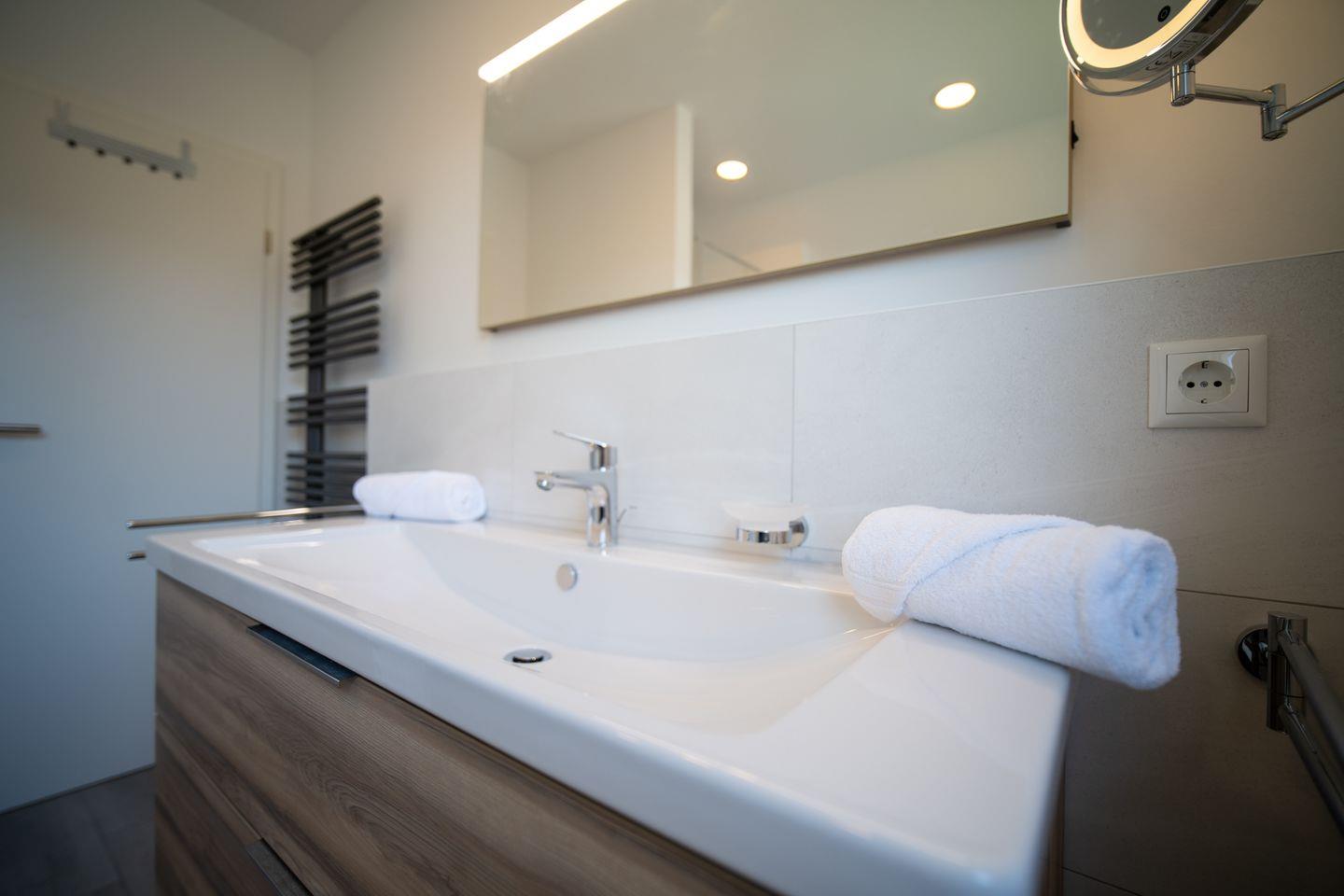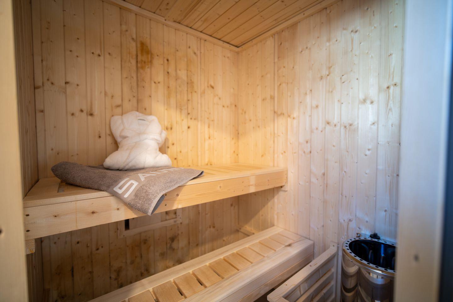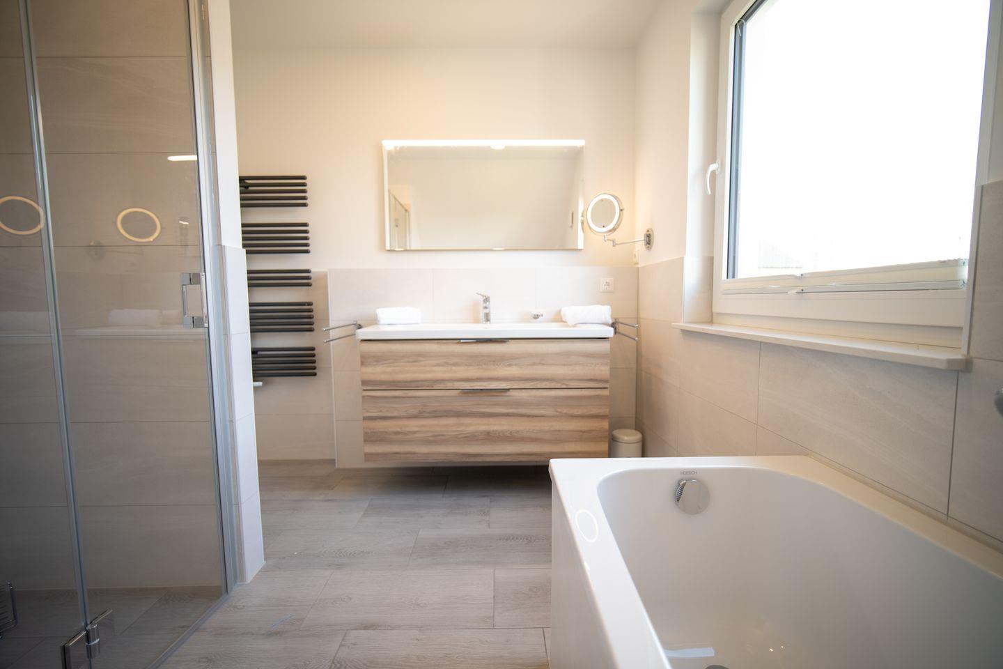 Das moderne Tageslichtbad mit Dusche und Badewanne ergänzt das Raumangebot. Ein weiteres Duschbad befindet sich im Erdgeschoss — und dort wartet auch das besondere Highlight des Hauses: die private Sauna, die Sie jederzeit für sich nutzen können.