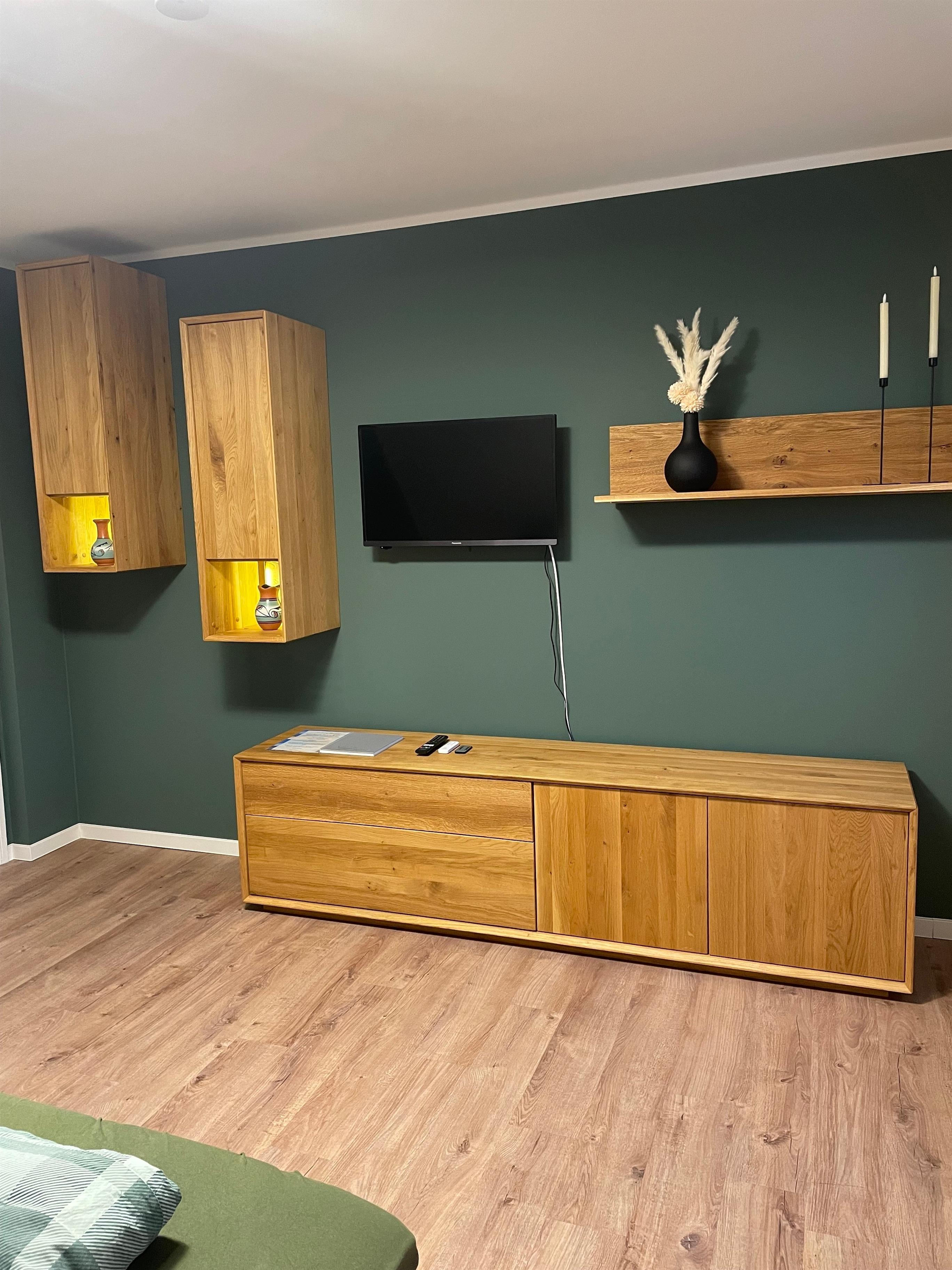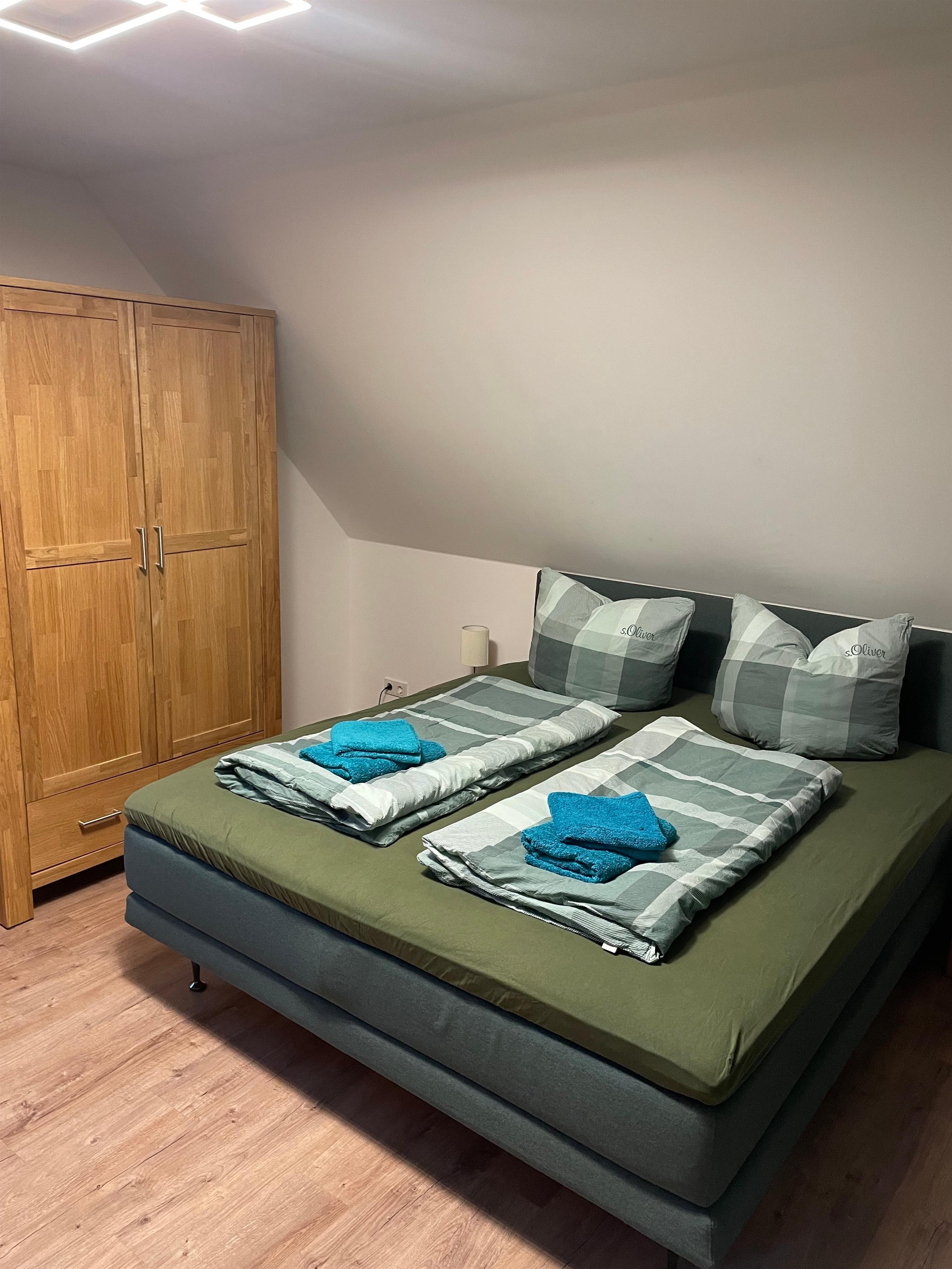 Das Schlafzimmer ist mit einem komfortablen Doppelbett ausgestattet und sorgt für erholsame Nächte. Ein geräumiger Kleiderschrank bietet ausreichend Stauraum für Ihr Gepäck.