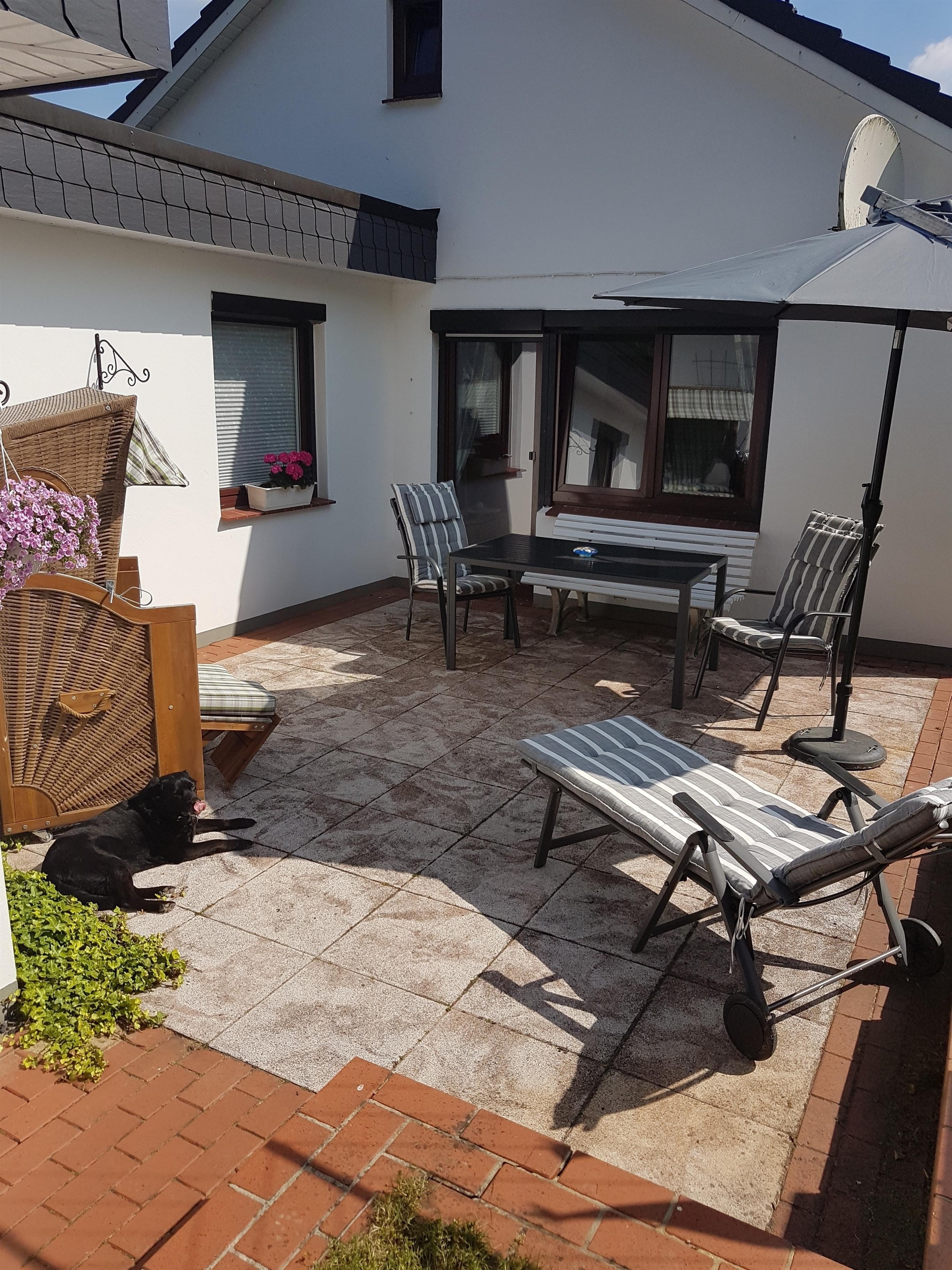 ausgestattet. Vom Wohnzimmer gelangen Sie auf die großzügige Terasse mit Bank, Gartenstühle, Tisch und einen eigenen Strandkorb. Der angrenzende Garten ist mit einem Rasen und blühenden