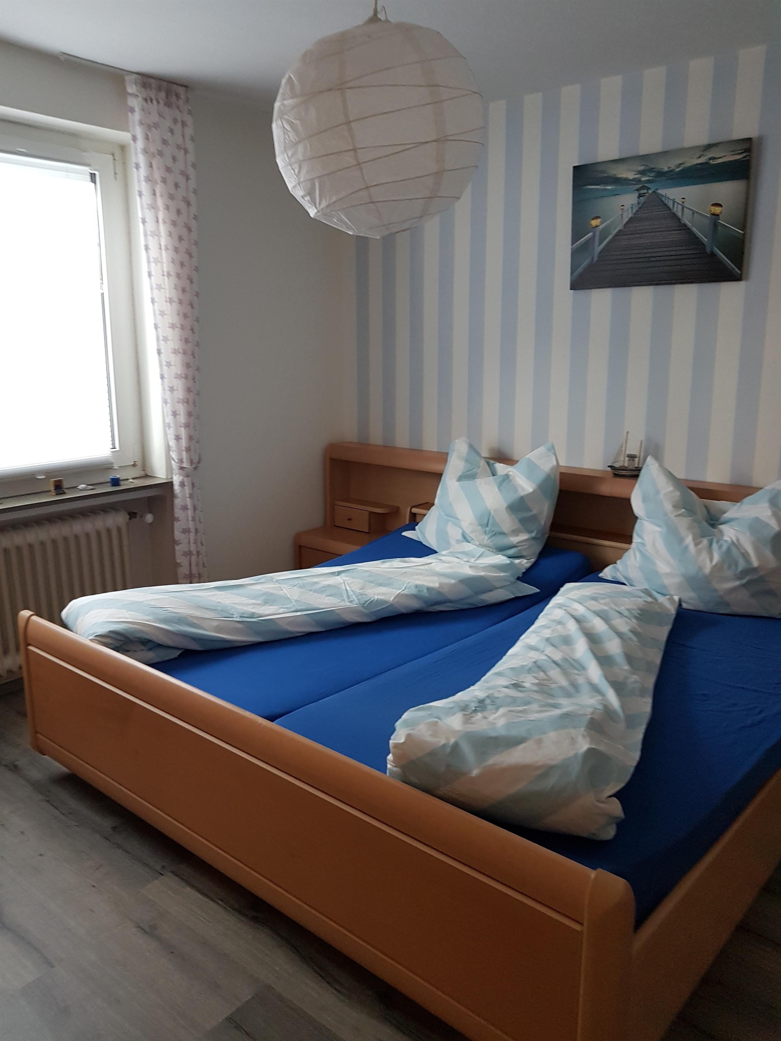Weiter auf dem Flur entlang gelangen Sie in das große Schlafzimmer mit bequemen Doppelbetten, Nachtschränken und einem großzügigen Kleiderschrank.
