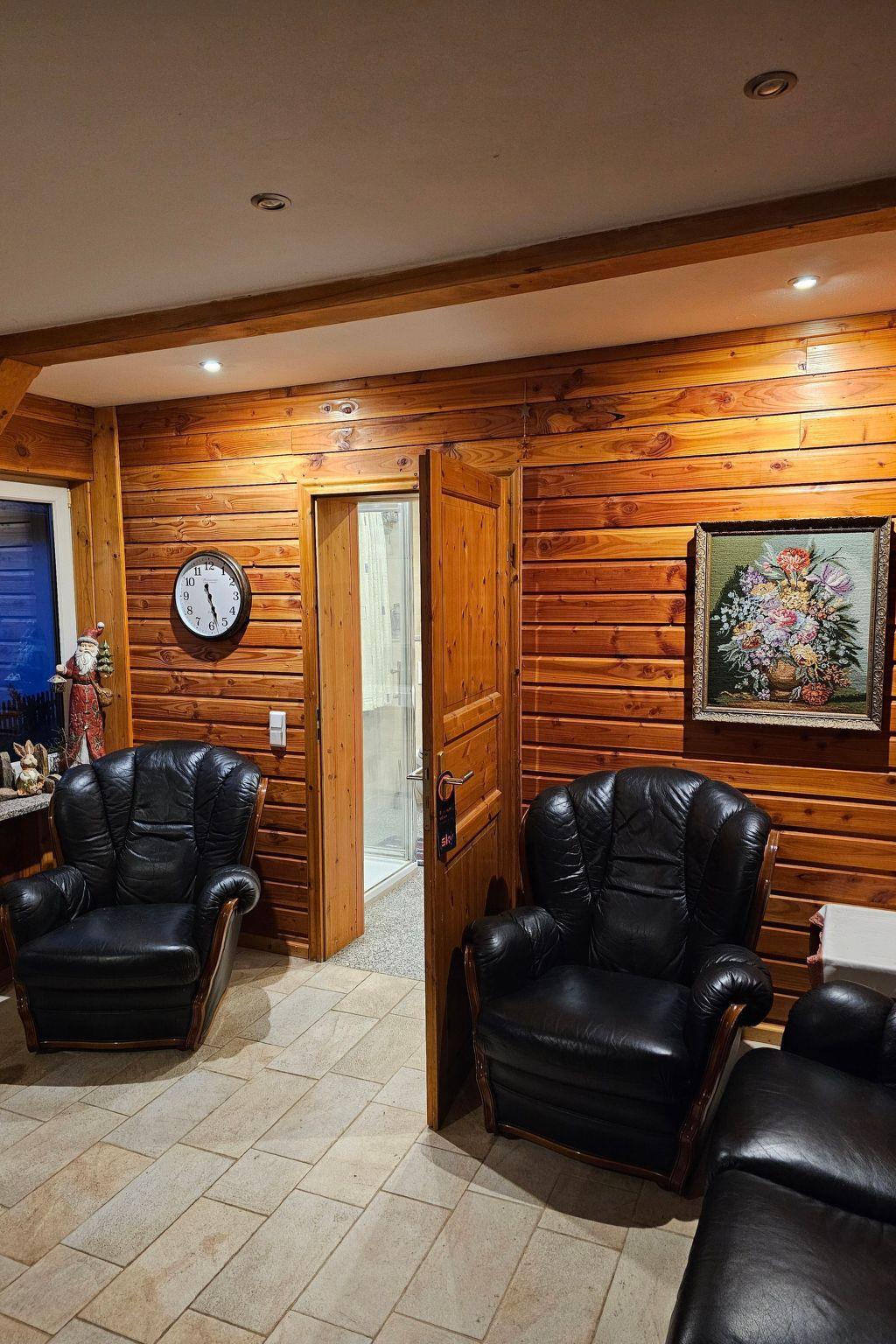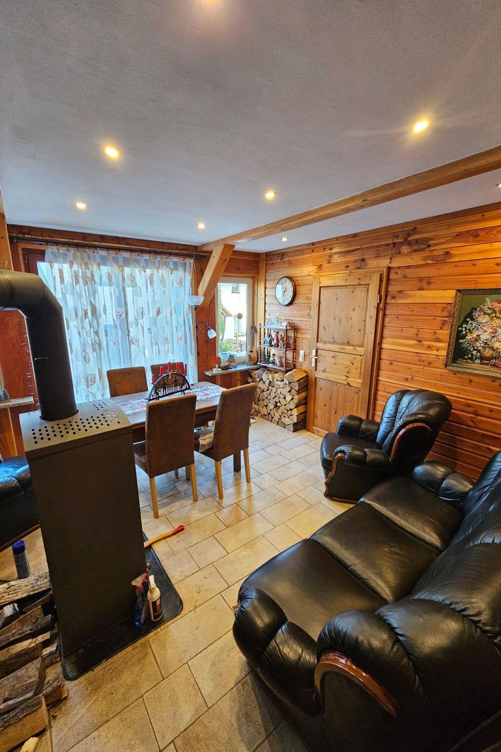 The outdoor area includes a garden seating area and patio furniture. A garden with barbecue area (fenced) is available for shared use. The car park is on the property next to the house. Shop 300 m, restaurant and bus stop 400 m, outdoor swimming pool 700 m, indoor swimming pool 10 km, cross-country ski track 75 km.