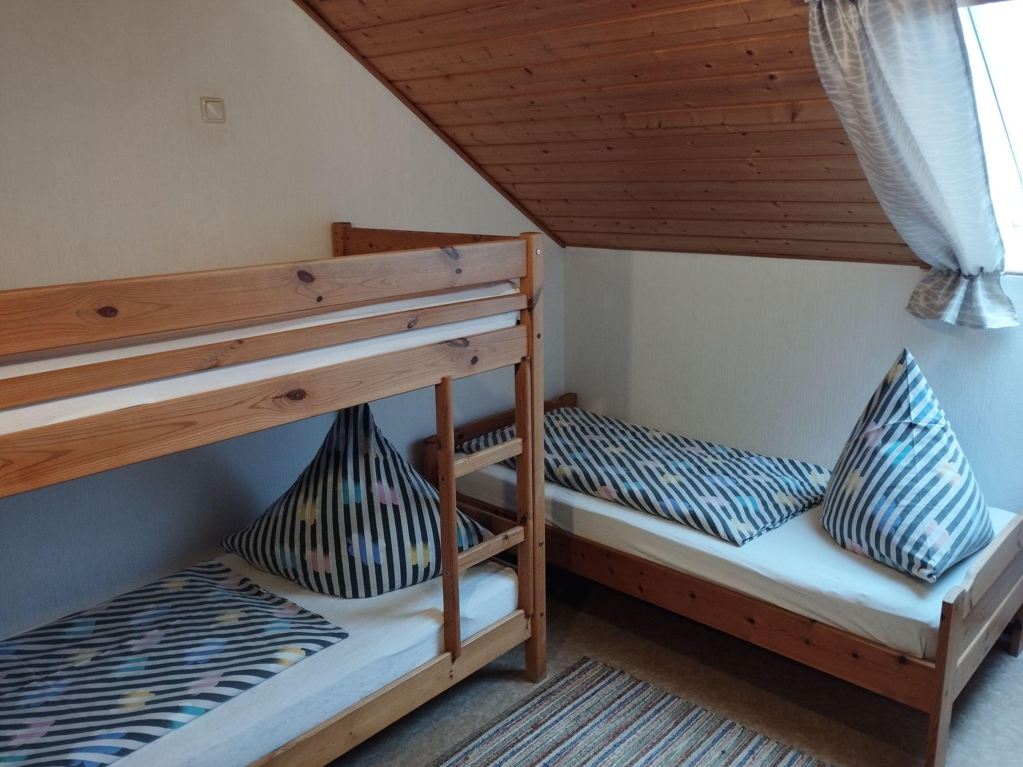 The interior of the flat consists of a multifunctional eat-in kitchen, which is well equipped with an oven, microwave, fridge, four hotplates, dishwasher, toaster, blender, kettle and coffee machine. SAT-TV, a cosy sitting area and a couch invite you to linger. For a good night's sleep, there is a bedroom with a double bed, two bedside tables and a spacious wardrobe, as well as a children's room equipped with a bunk bed and a single bed, a wardrobe, a play area, a shelf and a radio with CD player. A functional bathroom with washbasin, shower, toilet, stool and bathroom furniture, as well as an area near the entrance with shoe rack and wardrobe complete the feel-good ambience.