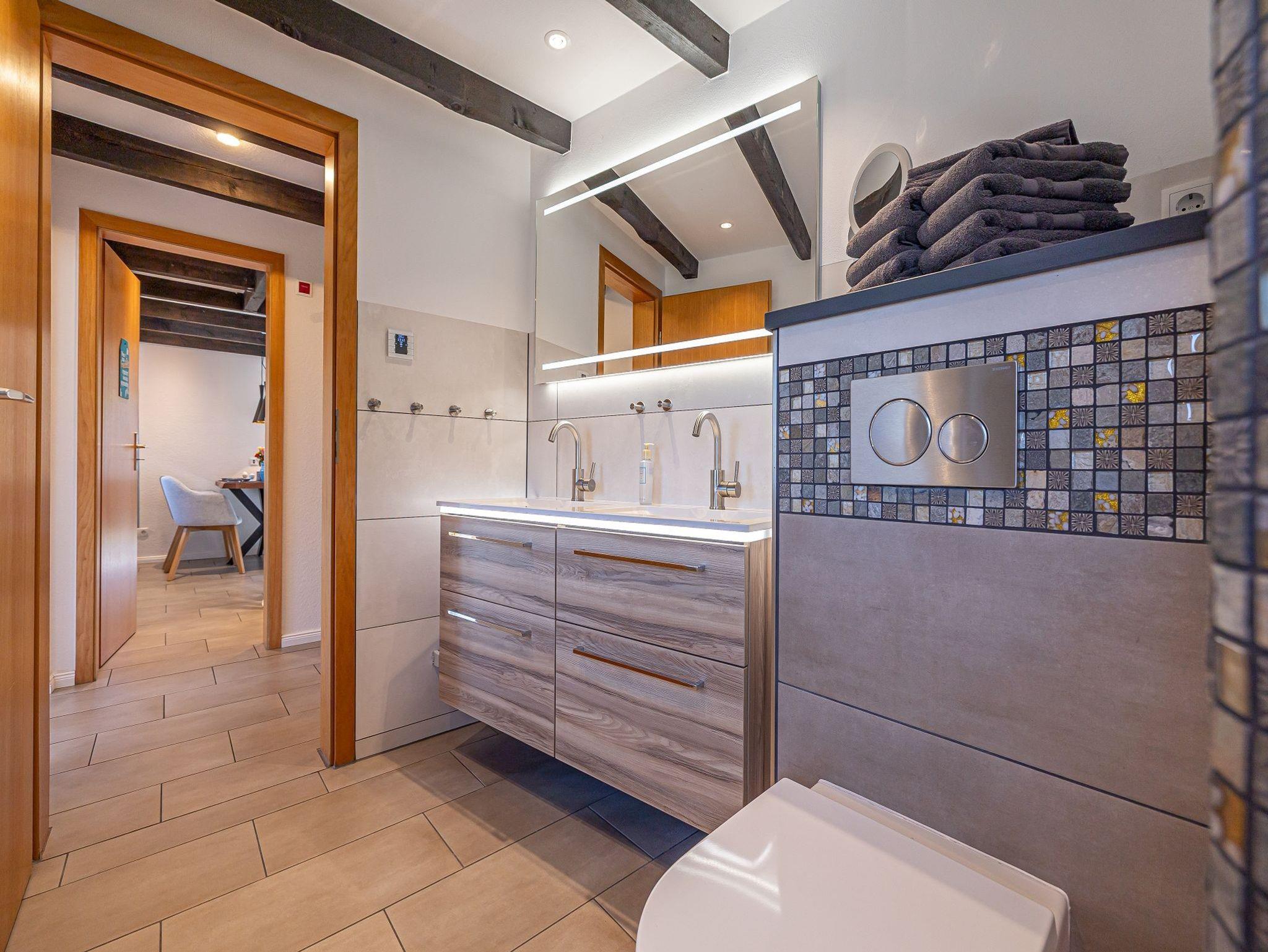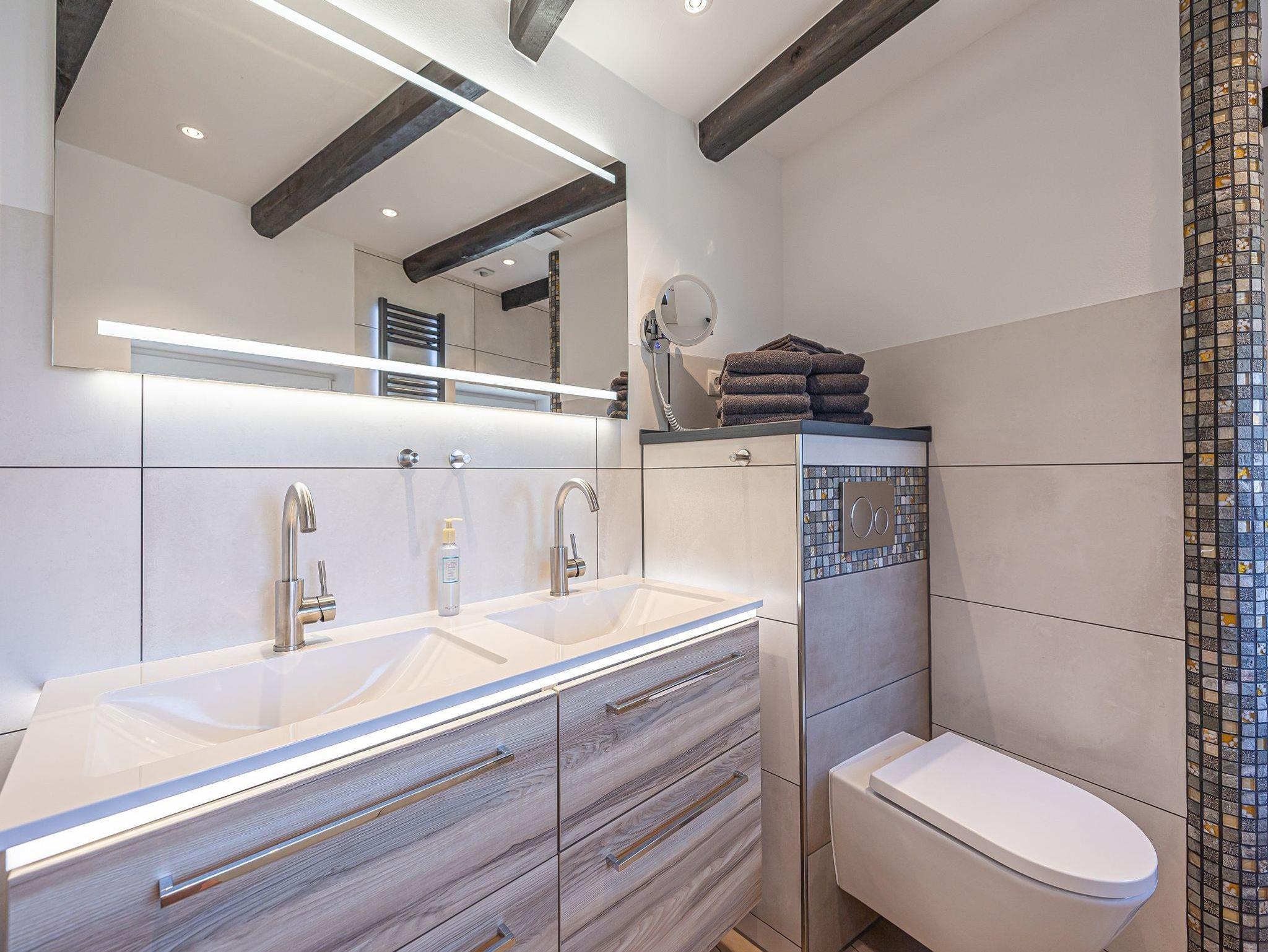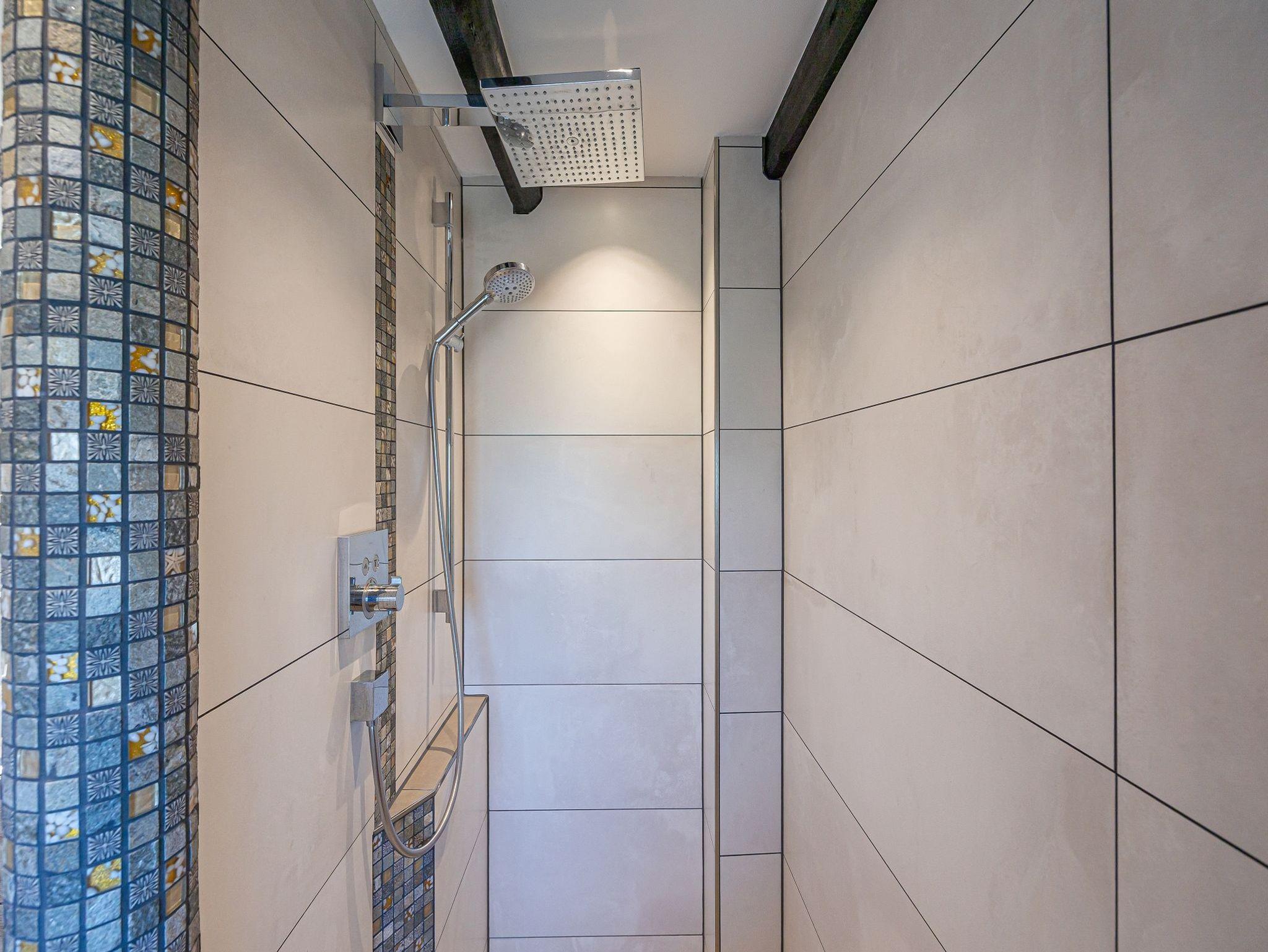 • Badezimmer mit ebenerdiger Walk-In Dusche, Handtuchwärmer, Haartrockner; Handtücher inklusive