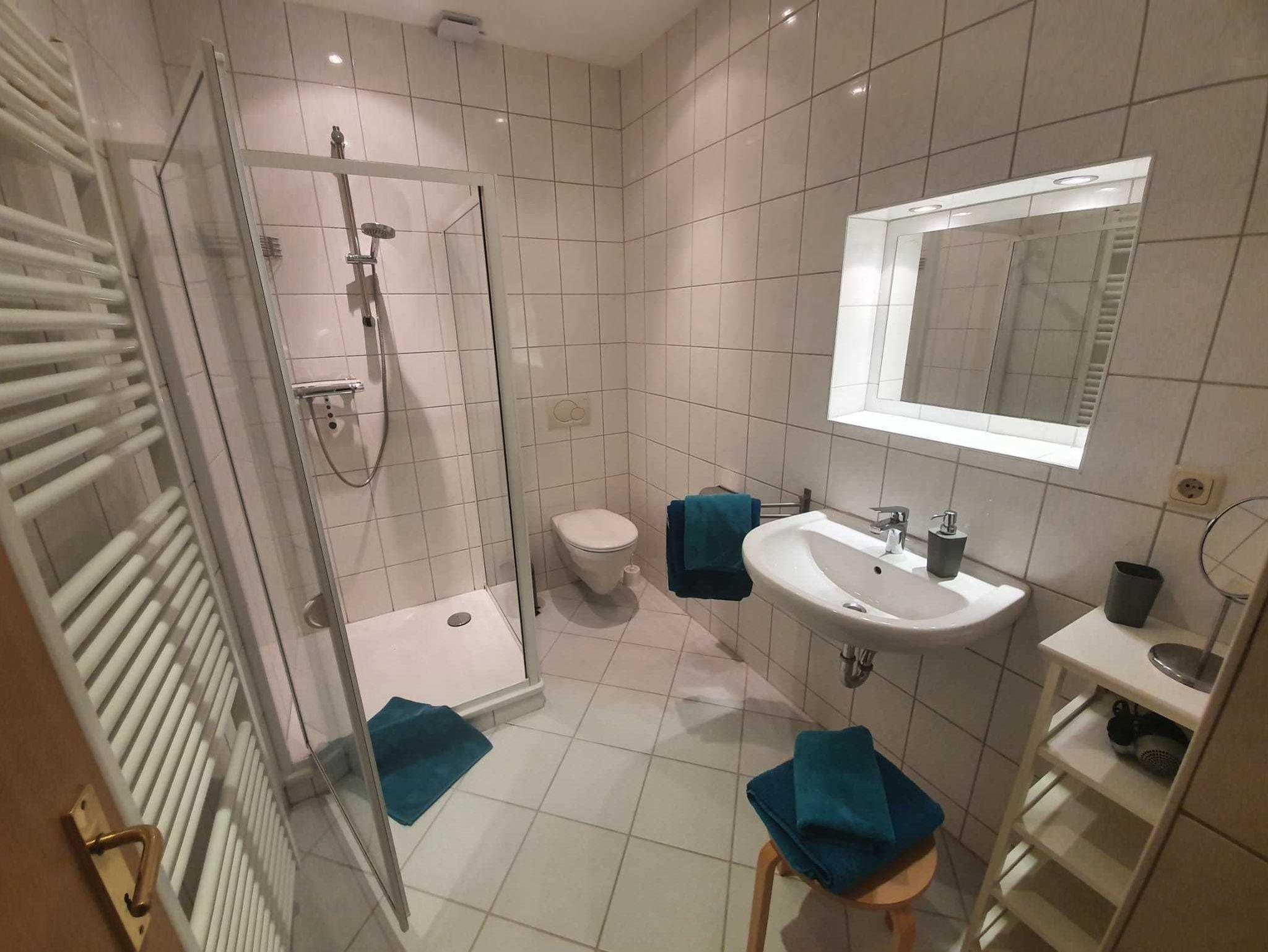 Die Wohnung Hofblick befindet sich im ersten Obergeschoss auf der linken Seite des Hauses. Sie verfügt über insgesamt zwei Schlafzimmer, von dem eins mit einem Doppelbett und das andere mit zwei Einzelbetten ausgestattet ist. Beide Schlafzimmer sind geräumig und bieten komfortablen Platz. Auf Wunsch kann bei Bedarf, ein Kinderbett und ein Hochstuhl dazu gebucht werden. Ein Duschbad ist ebenfalls vorhanden.