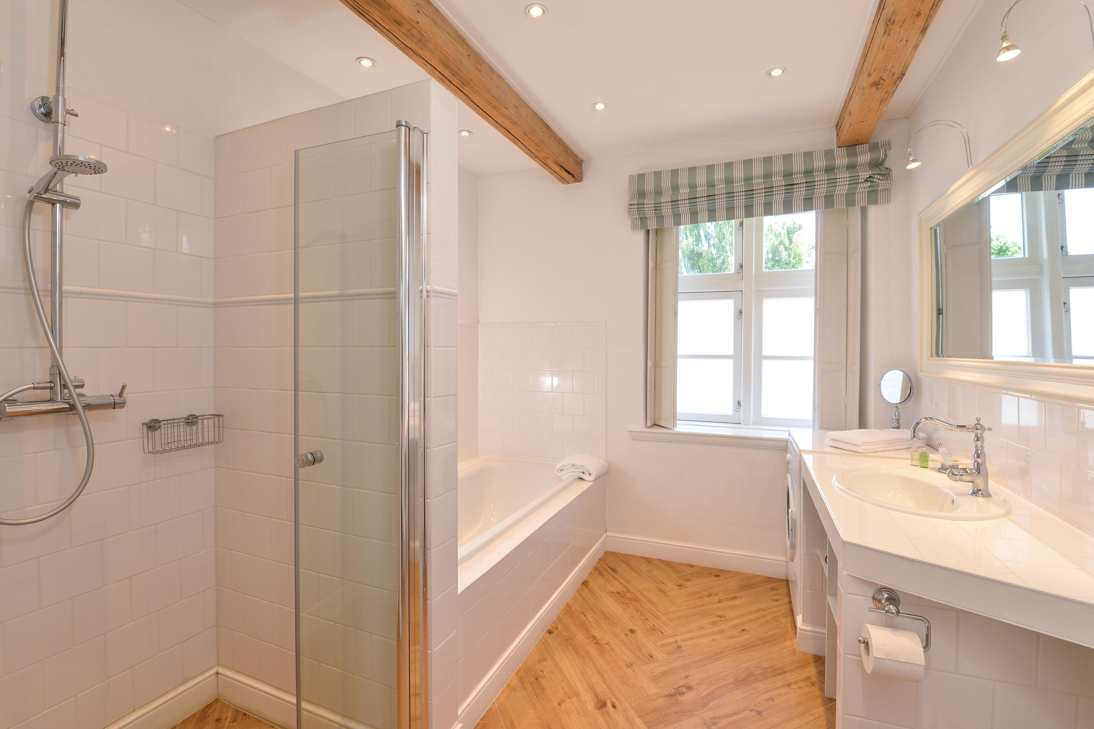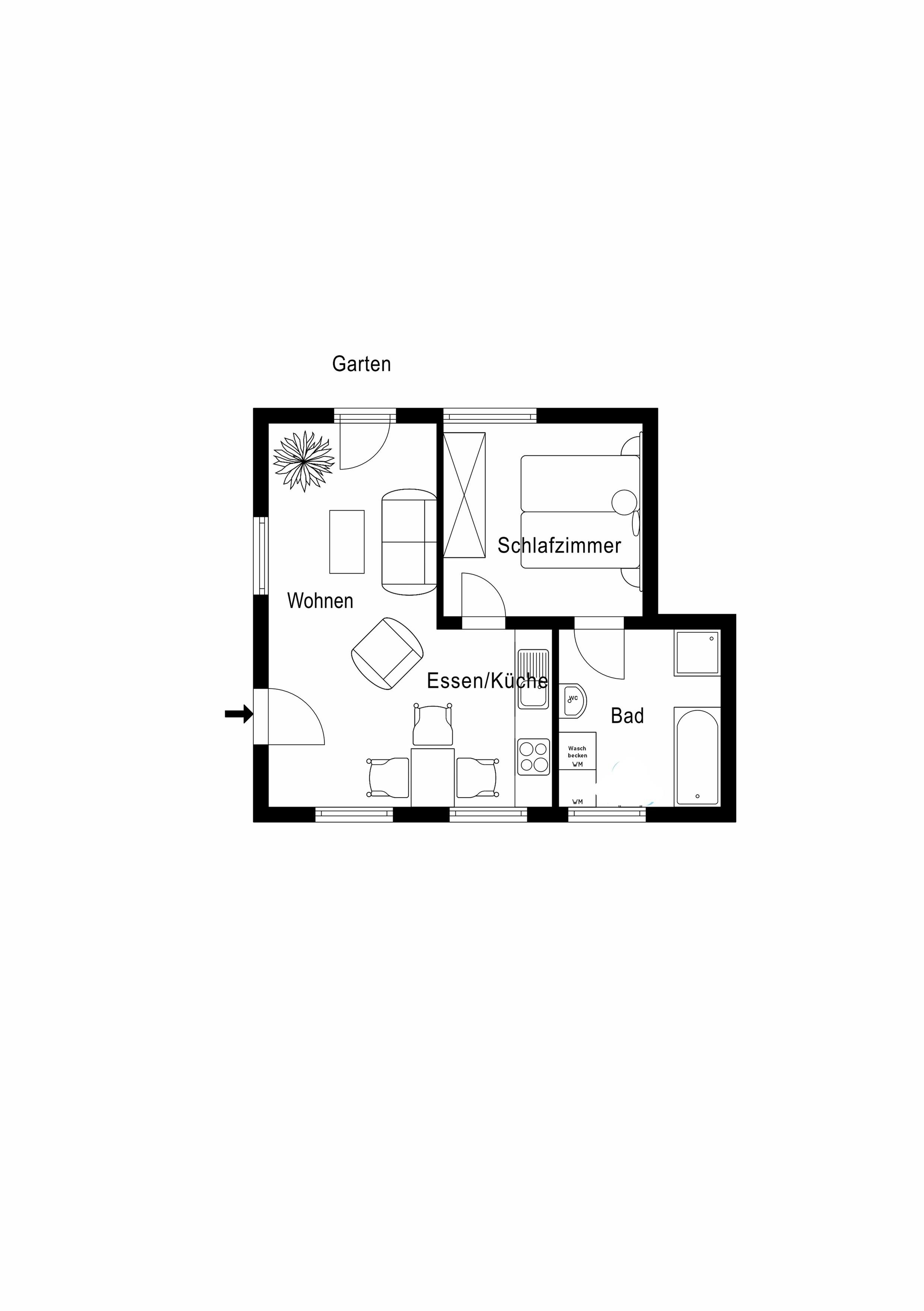 Wohn-/Esszimmer mit integrierter Küchenzeile, Bad mit bodengleicher Dusche und Badewanne, 1 Doppelzimmer