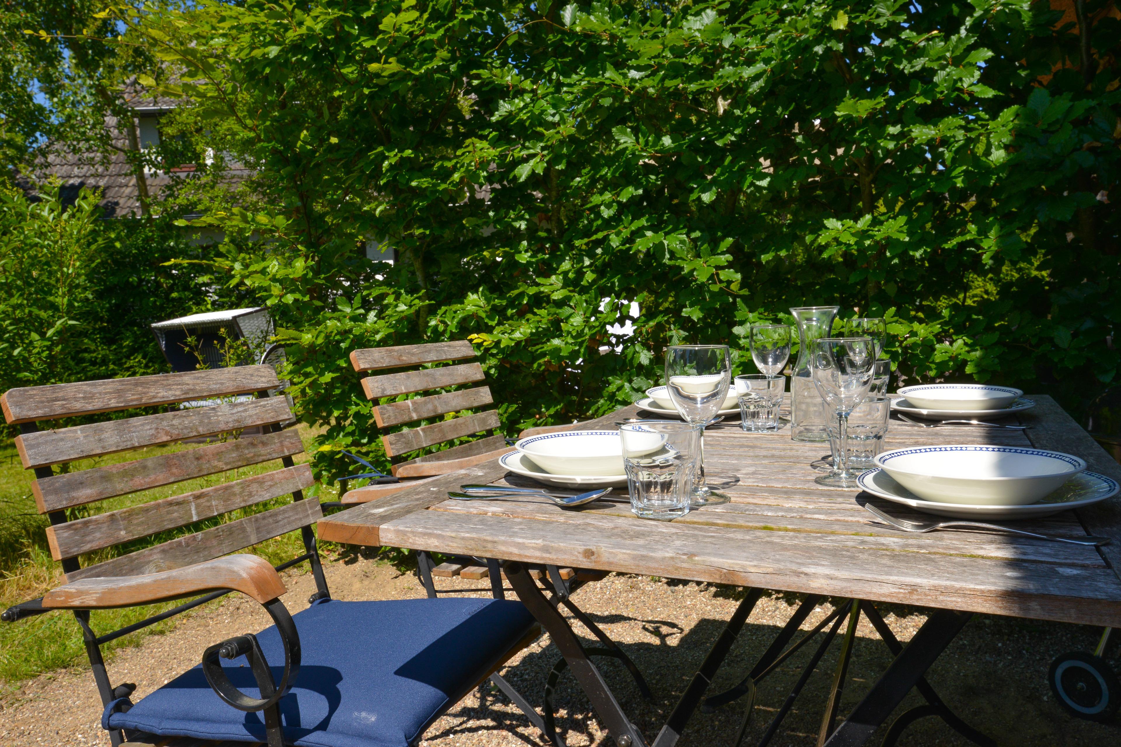 Kiesterrasse und großer Garten mit Strandkorb, Sonnenliegen und Gartenmöbeln.