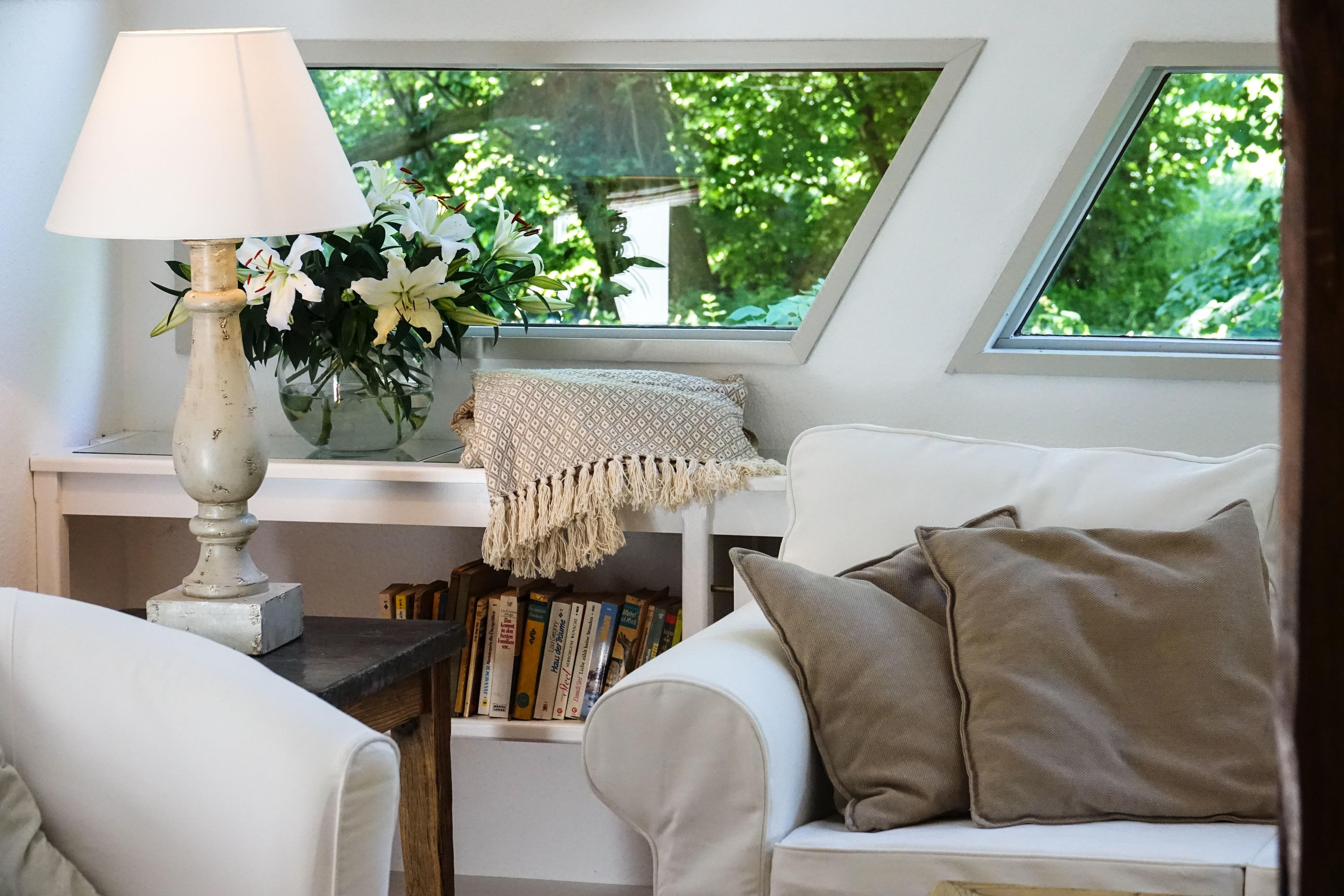 So besticht das Haus durch seine verwinkelte Aufteilung über drei Ebenen. Das große Wohnesszimmer mit historischen Balken ist durch sein architektonisch außergewöhnliches Fenster lichtdurchflutet und öffnet den Blick auf die Baumwipfel.