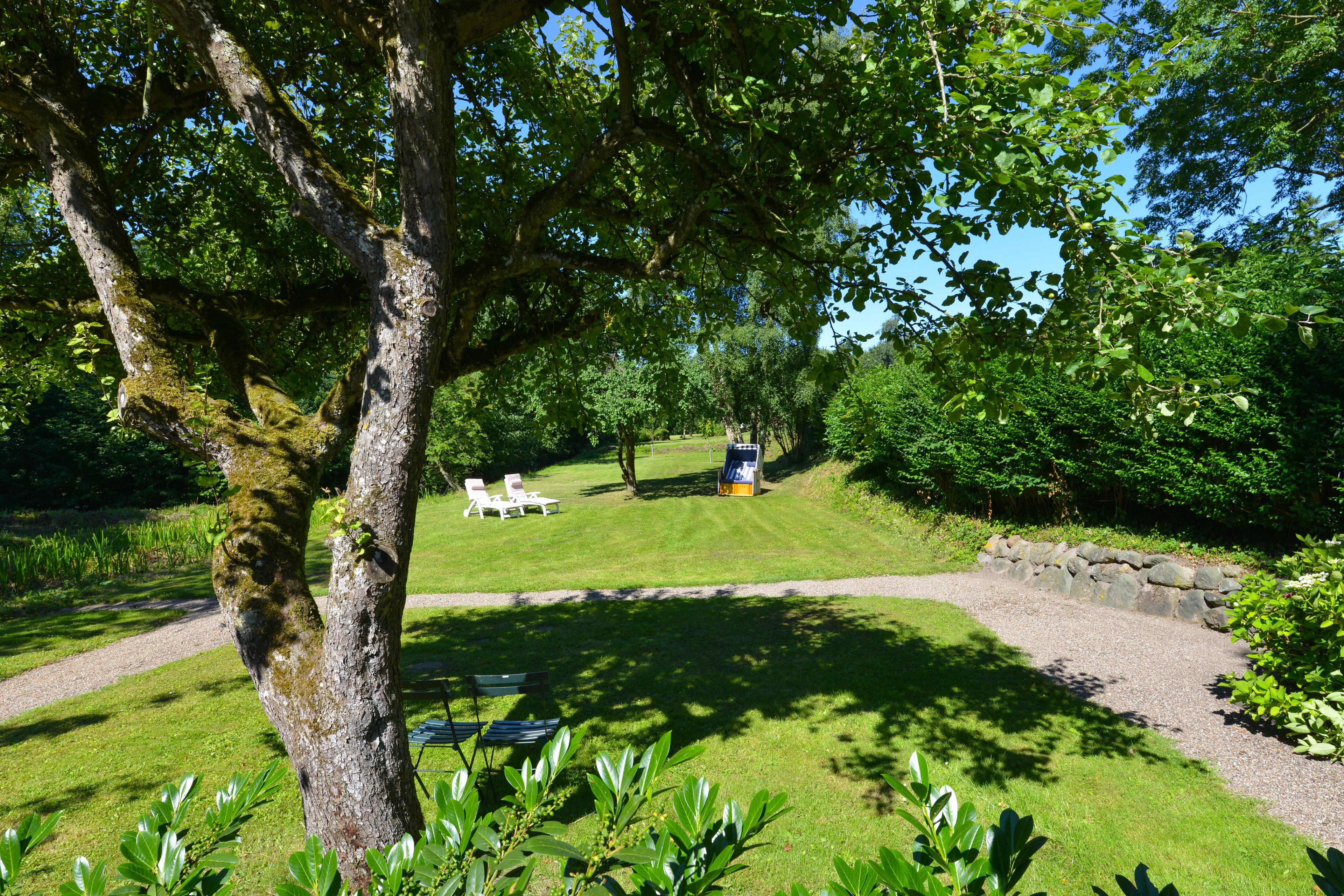 Der große verwunschener Garten der Wassermühle zieht sich, von einer Hecke getrennt, entlang der idyllisch ländlichen Sackgasse am Schlossgraben, in der insgesamt nur vier Häuser liegen. Hier ist man noch fußläufig zum Dorf Gelting mit seinem Spielplatz und Einkaufsmöglichkeiten, aber mit dem Fahrrad und Auto sind auch das Naturschutzgebiet und die nahe gelegenen Strände der Geltinger Bucht in Falshöft, Wackerballig und Pottloch schnell zu erreichen.