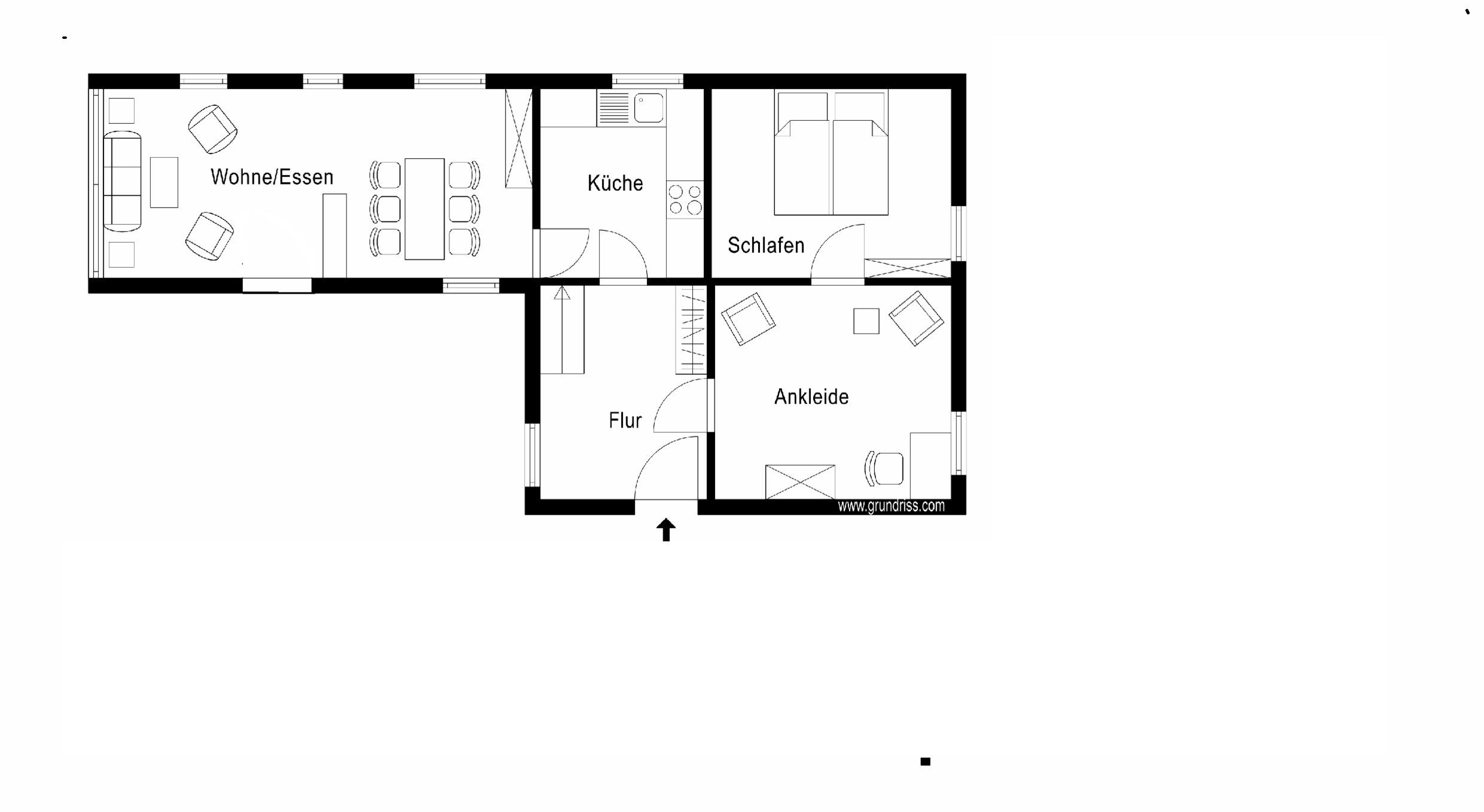 EG: Wohn-/Esszimmer, Küche, Doppelschlafzimmer mit Ankleidezimmer und Aufbettungsmöglichkeit