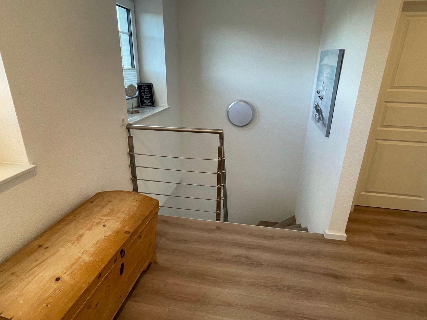 Die 82m² große, zweigeschossige Wohnung "Stuuv twee" befindet sich in einem grundsanierten Angeliter Wohnhaus. Im Erdgeschoss befinden sich neben der Küche auch das Badezimmer und der Wohn- und Essbereich mit Schlafcouch. Im ersten Obergeschoss bieten zwei Schlafzimmer mit Doppelbetten (180x200cm) Erholung. Ein Gäste-WC ist ebenfalls vorhanden. Die offene, helle Küche bietet eine qualitativ hochwertige Ausstattung und geht in das stilvoll eingerichtete Ess- und Wohnzimmer über. Im Wohnzimmer können Sie es sich vor dem Flachbild-TV gemütlich machen. Vom Wohnbereich haben Sie direkten Zugang zur großen Terrasse mit eigenem, teilweise eingezäunten Gartenstück. Das helle Badezimmer bietet unter anderem eine Dusche und einen Föhn. An kalten Tagen können Sie sich in der finnischen Sauna aufwärmen. Zusätzlicher Komfort ist durch einen PKW-Stellplatz mit E-Ladesäule direkt am Haus gewährleistet. Im abschließbaren Fahrradschuppen können Sie Ihre Fahrräder unterstellen.