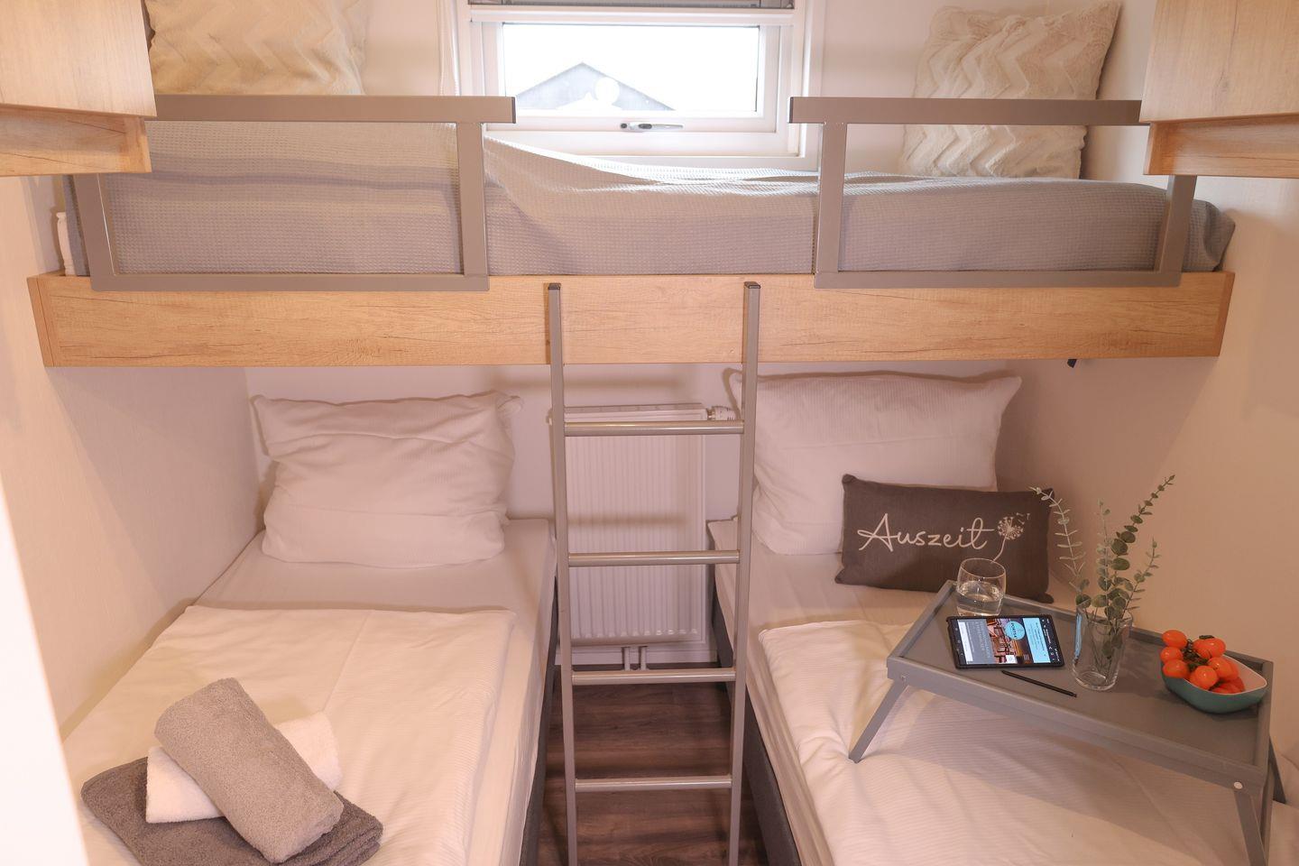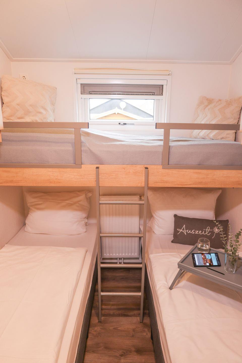Das Ferienhaus "Ostseechalet Strandmuschel" bietet die ideale Unterkunft für bis zu fünf Personen. Das Schlafzimmer ist mit einem komfortablen Doppelbett (140x200cm) ausgestattet. Im zweiten Schlafzimmer finden bis zu drei Personen in einem Hochbett (80x200cm) und zwei Einzelbetten gemütlich Platz. Das Tageslichtbad verfügt über eine Dusche, ein WC und ein Waschbecken. Der Wohn- und Essbereich ist offen gehalten und verfügt über eine vollausgestattete Küchenzeile mit einem Gasherd. Hier können Sie Ihre Mahlzeiten zubereiten und diese anschließend am Esstisch genießen. Der Blick aus dem Wohnbereich auf die Geltinger Bucht und die umliegende Landschaft ist beeindruckend. Ein besonderes Highlight des Ferienhauses ist die angrenzende, überdachte Terrasse. Von hier aus haben Sie einen freien Blick auf die Geltinger Bucht und können entspannte Sommerabende oder einzigartige Sonnenaufgänge genießen. Damit Sie ungestört Ihren Aufenthalt genießen können, sind alle Zimmer mit einem Sichtschutz und Insektenschutzgittern ausgestattet. Sie haben auch die Möglichkeit, Ihr Fahrzeug auf dem eigenen Parkplatz am Haus abzustellen. Zudem gibt es einen abschließbaren Fahrradschuppen, in dem mitgebrachte Fahrräder sicher aufbewahrt werden können.