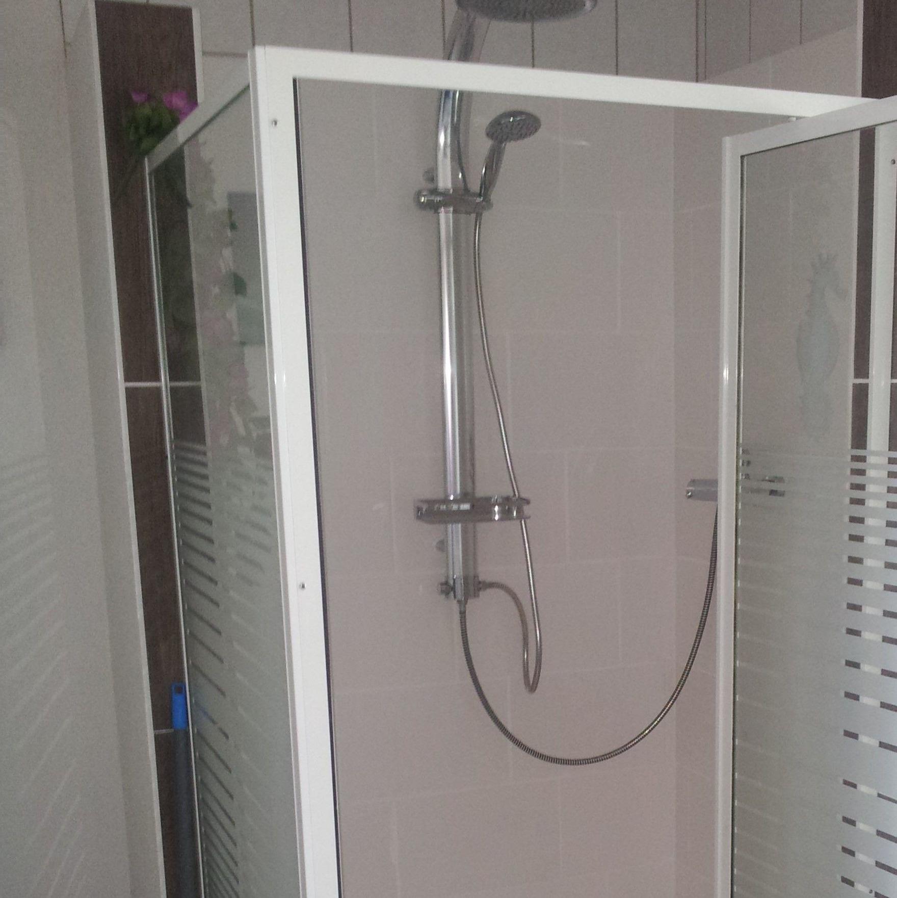Das Badezimmer ist mit einer große Dusche , ein Waschbecken und WC ausgestattet.