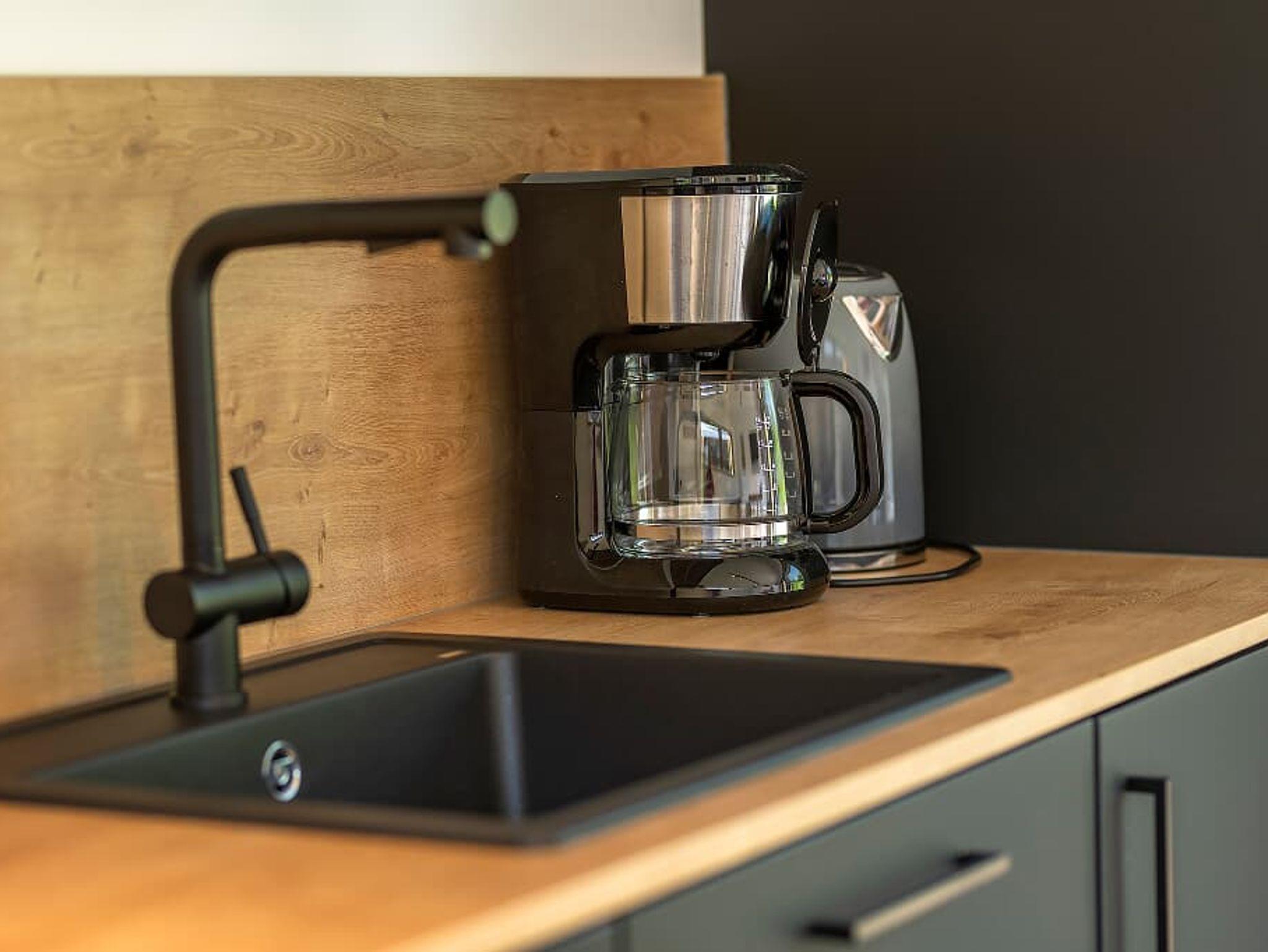 Großzügige Wohn-Ess-Küche mit großem Esstisch für 4 Personen, Zugang zur Terrasse mit Blick auf unser Hirschgehege. Kühlschrank, Spülmaschine, Ceranfeld mit 2 Kochstellen, Filterkaffeemaschine, Wasserkocher, Toaster und reichhaltiges Geschirr. Geschirrtücher werden gestellt.