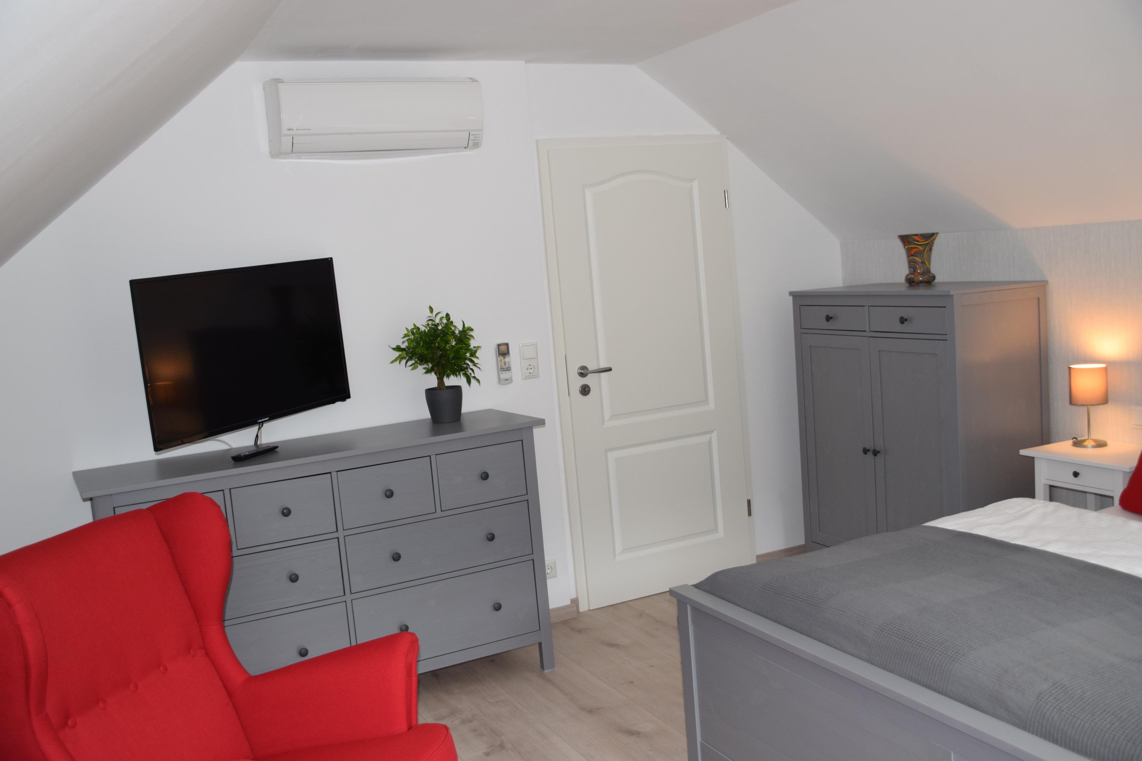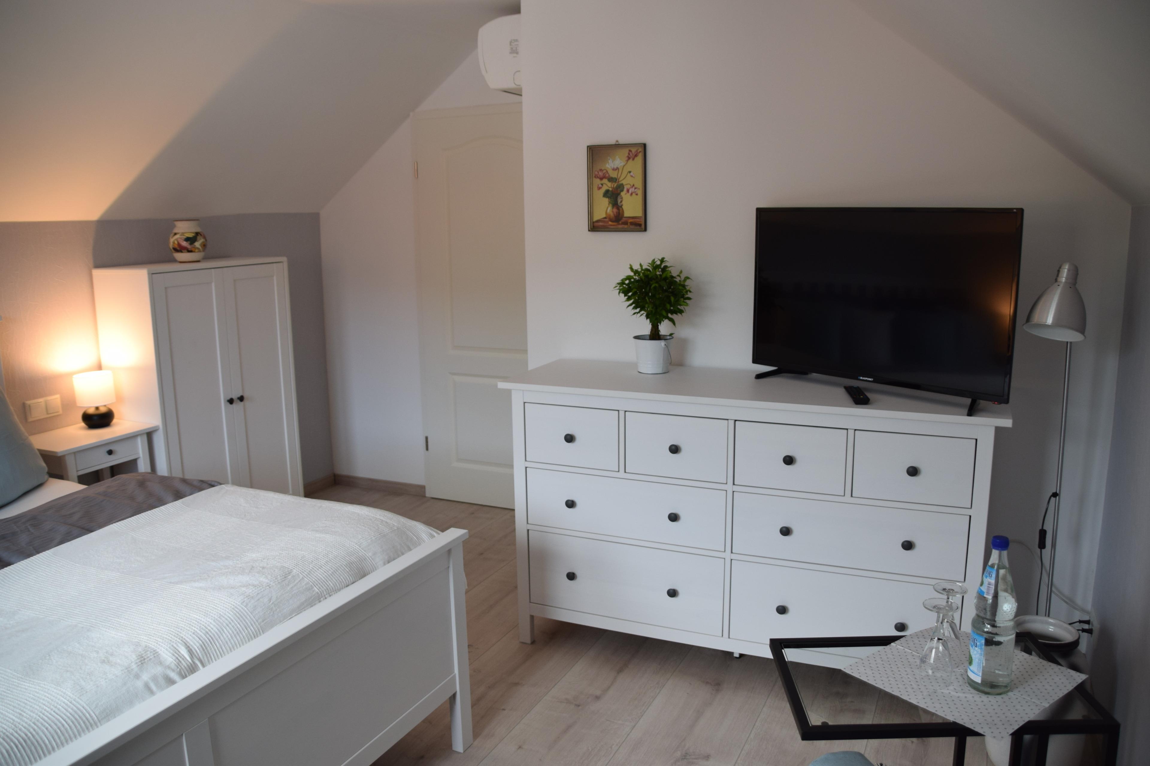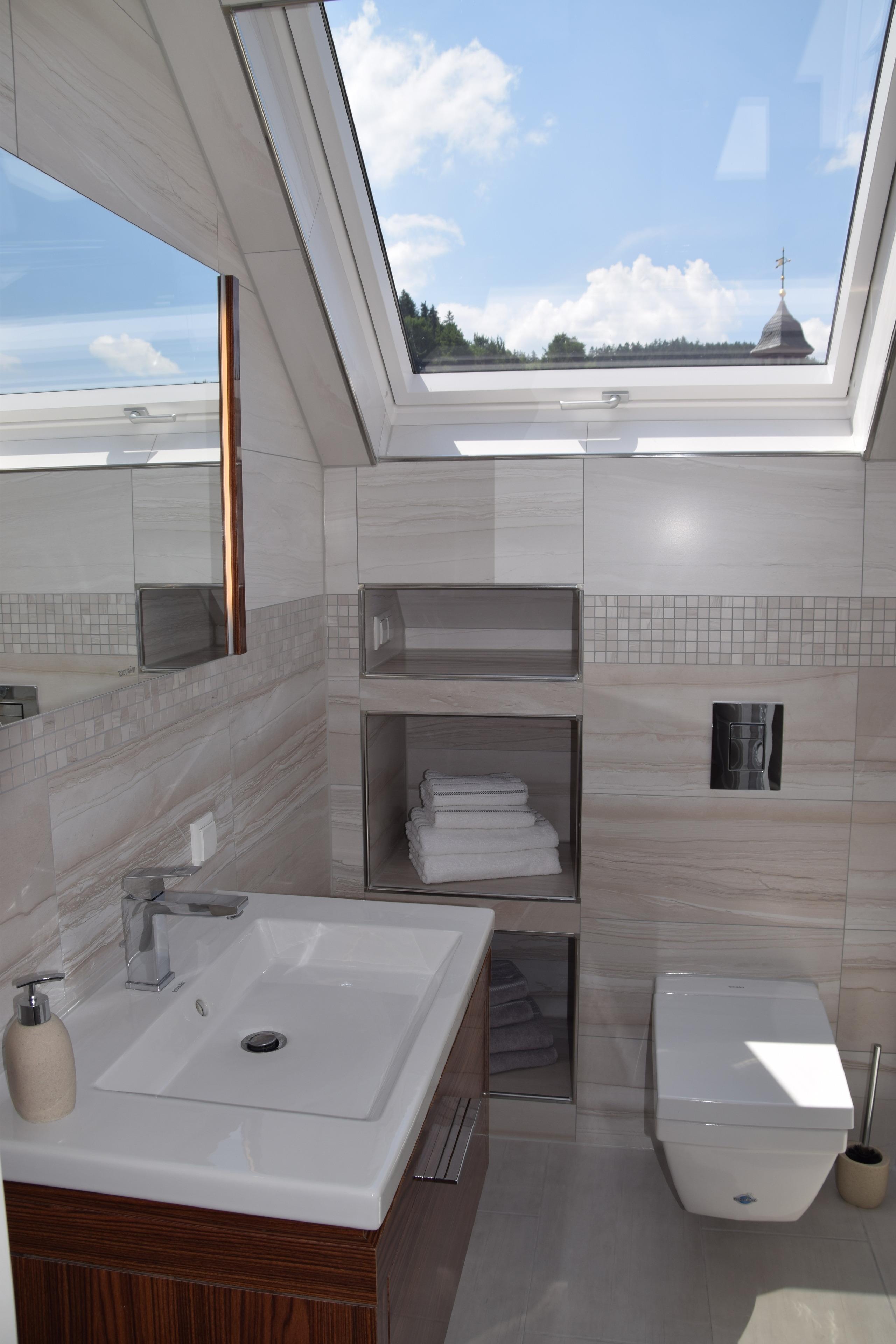 Das Dachgeschoss erreichen Sie ebenfalls über eine Treppe. Hier haben wir für Sie zwei Superior- Gäste-/Schlafzimmer und ein kleines Bad mit WC und Dusche hergerichtet.