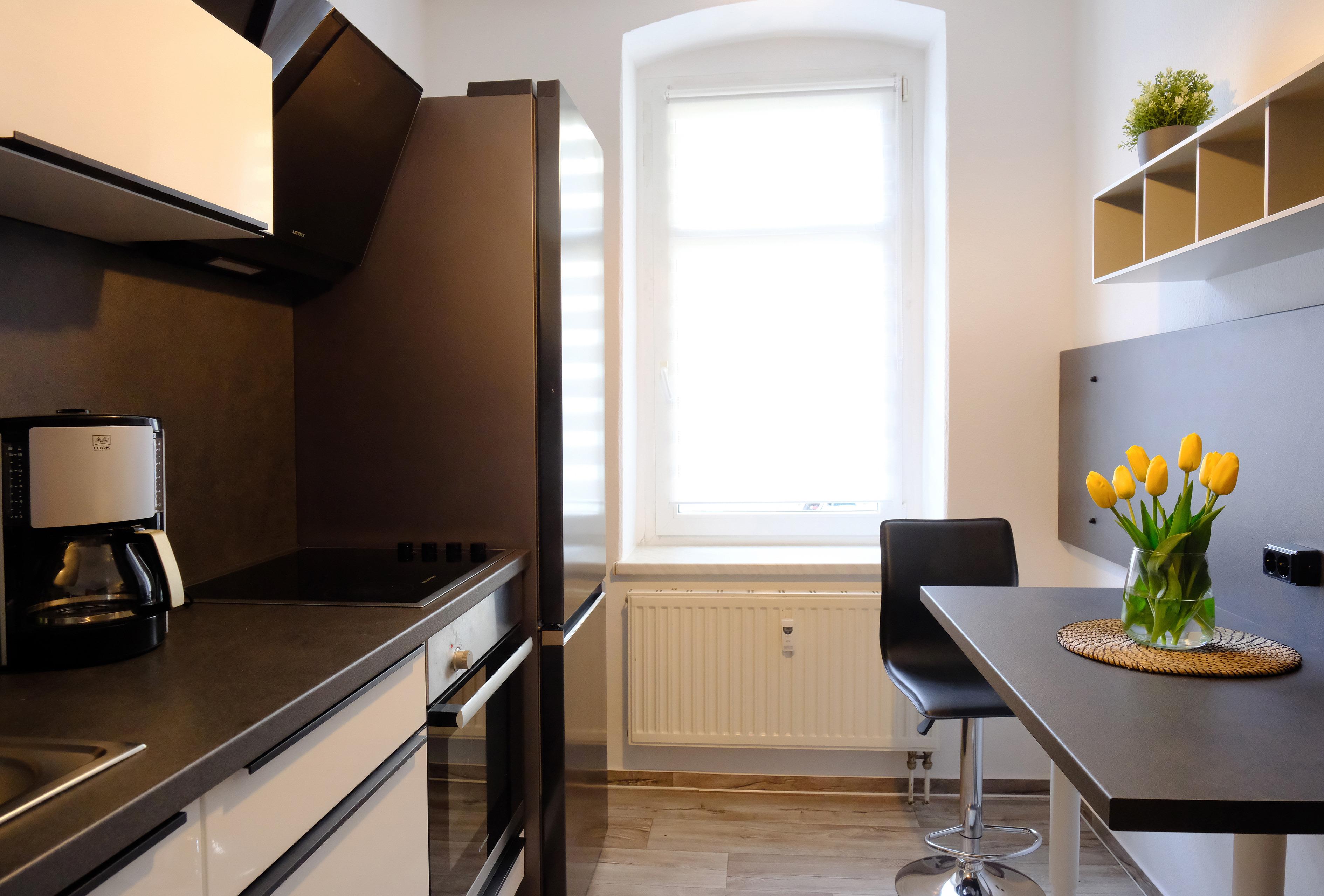 Die Küche verfügt über alle notwendigen Kochutensilien z.B. Kühlschrank, Wasserkocher, Herdplatten, Töpfe, Teller, Tassen, Besteck usw. Diese sind in einer Einbauküche untergebracht. Es ist eine Grundausstattung an Öl, Salz, Zucker und diversen Gewürzen vorhanden. Außerdem können bis zu 3 Personen an den vorhandenen Tisch bequem das Essen vorbereiten.