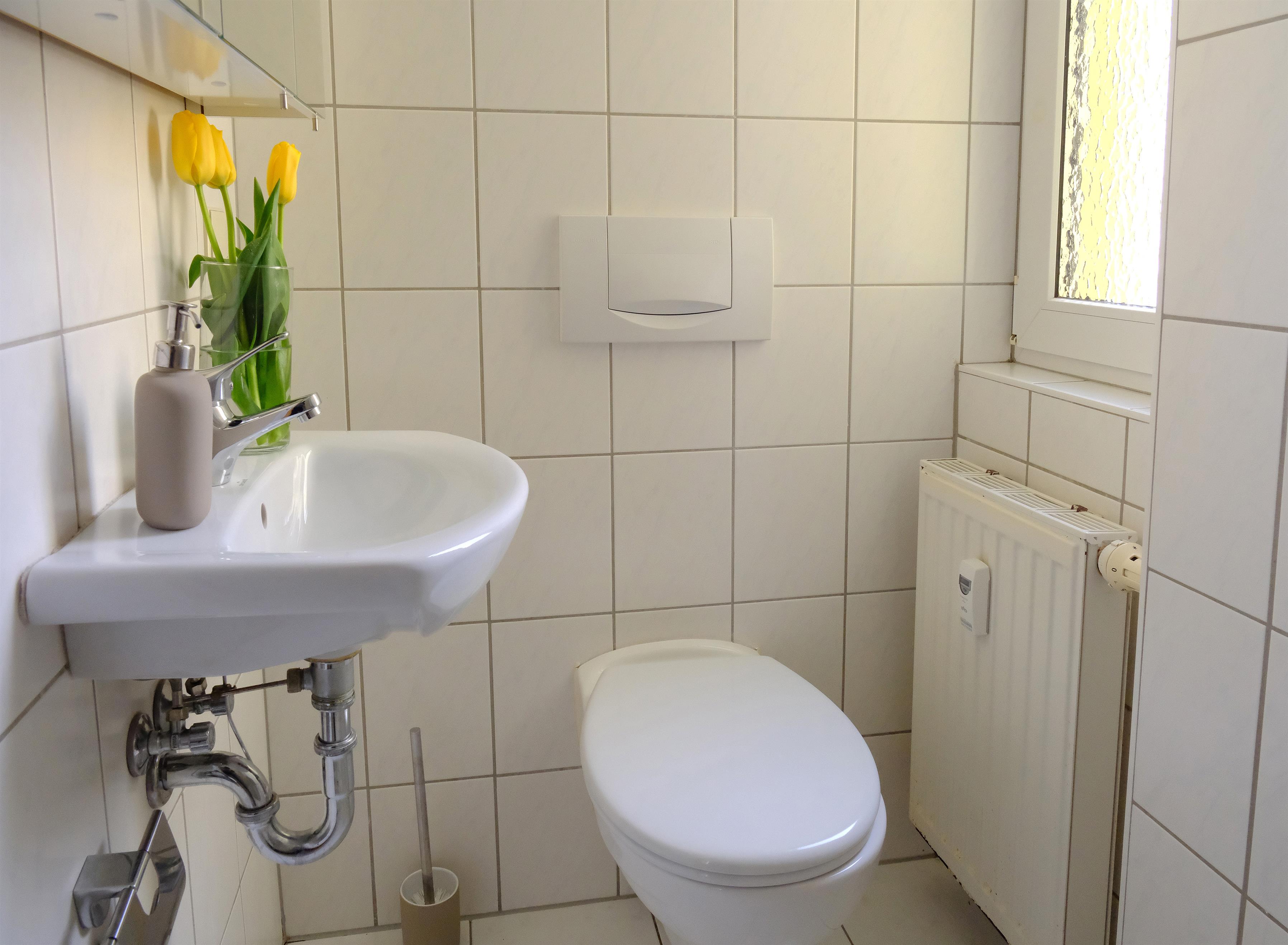 Im kleinen gemütlichen Badezimmer befindet sich ein Waschbecken mit Spiegelschrank, eine Toilette und eine Dusche.