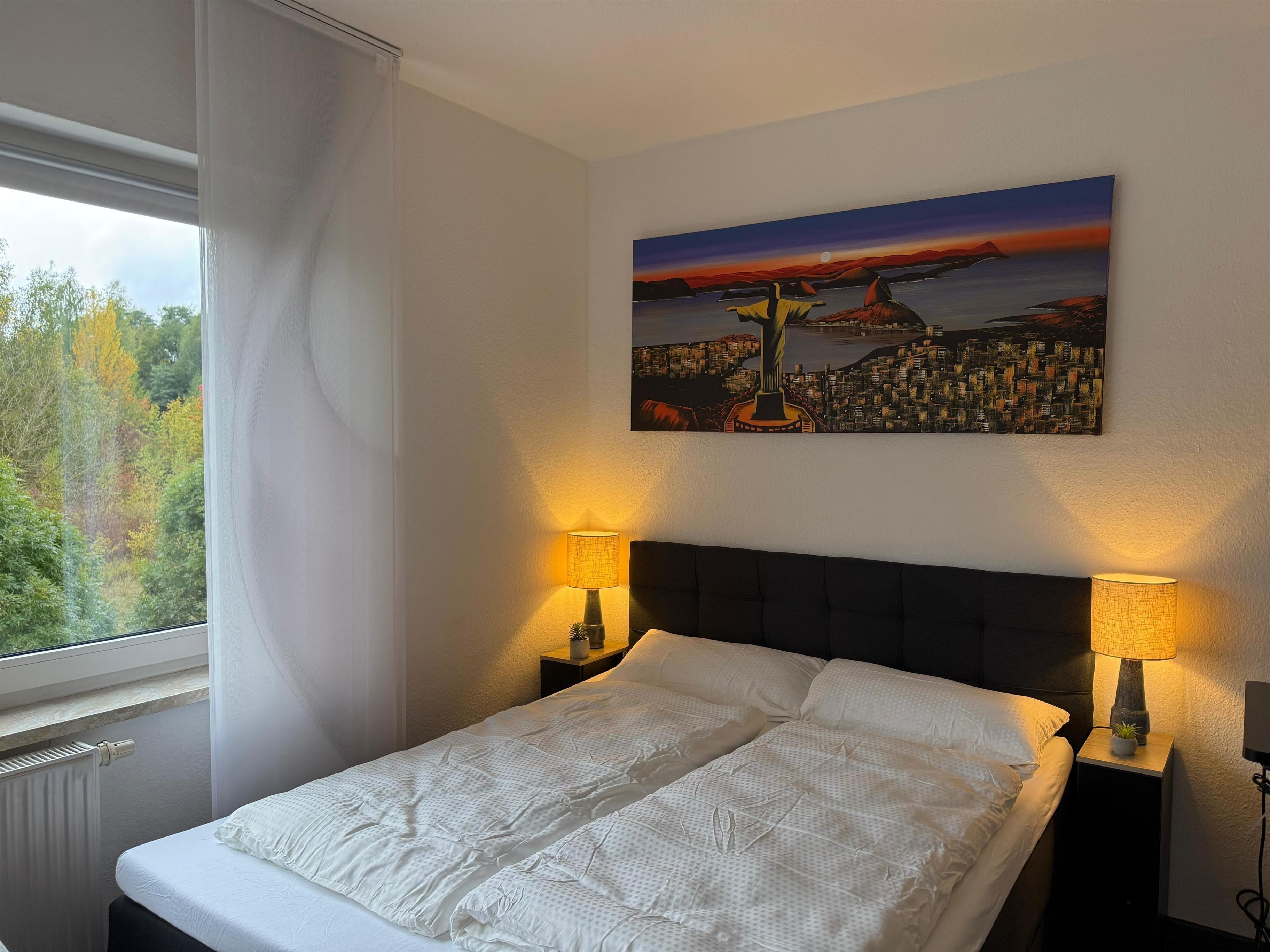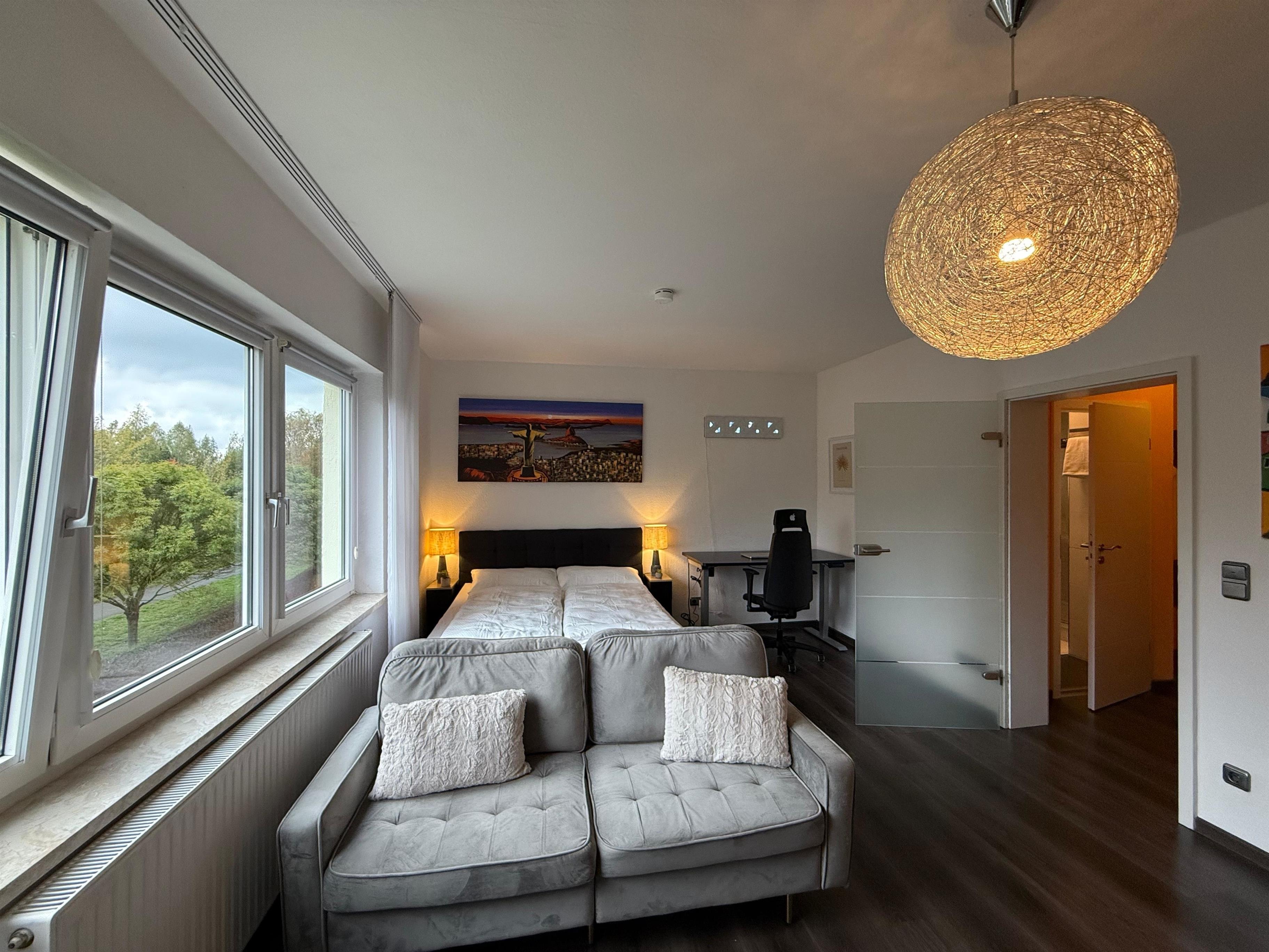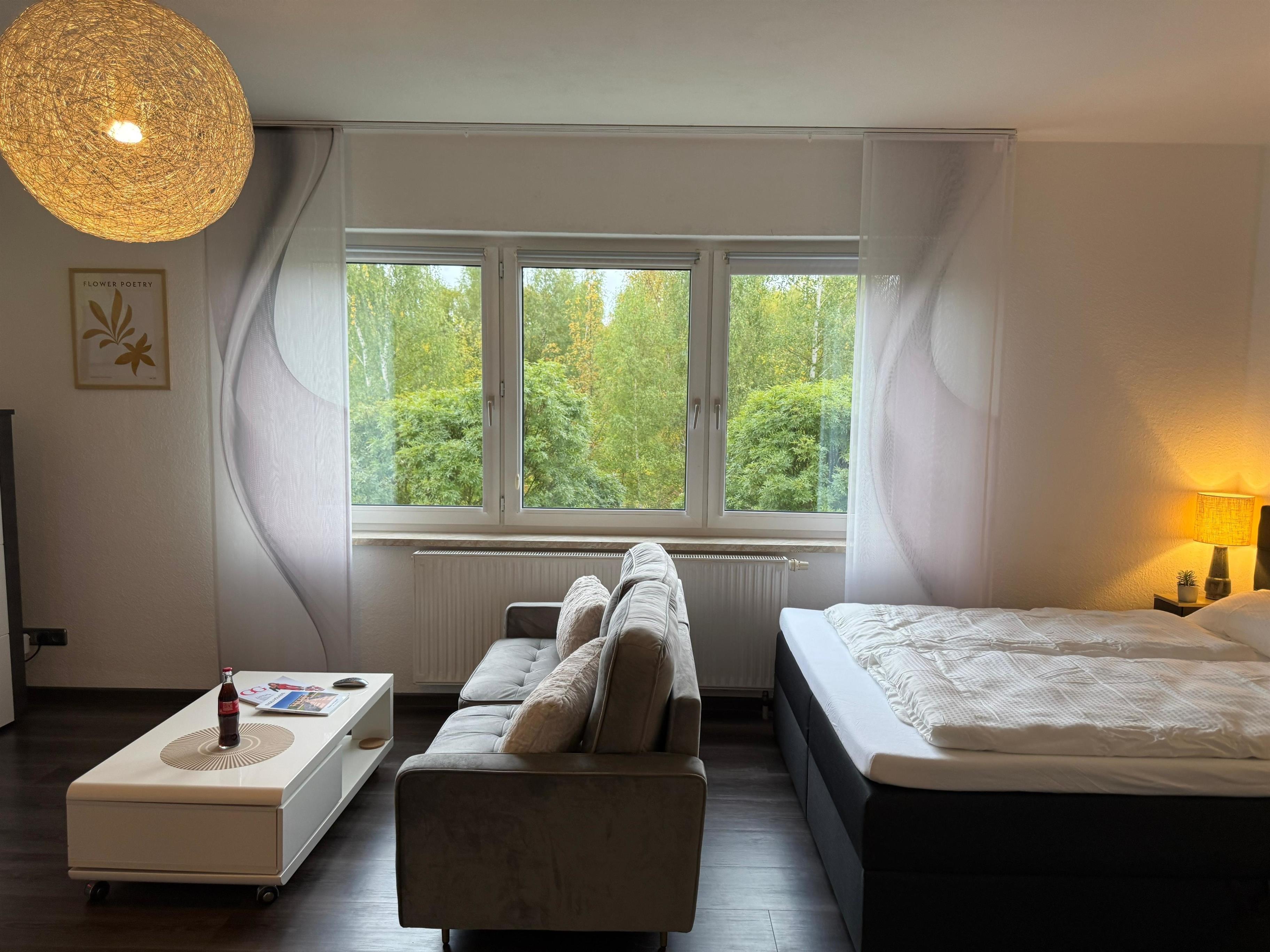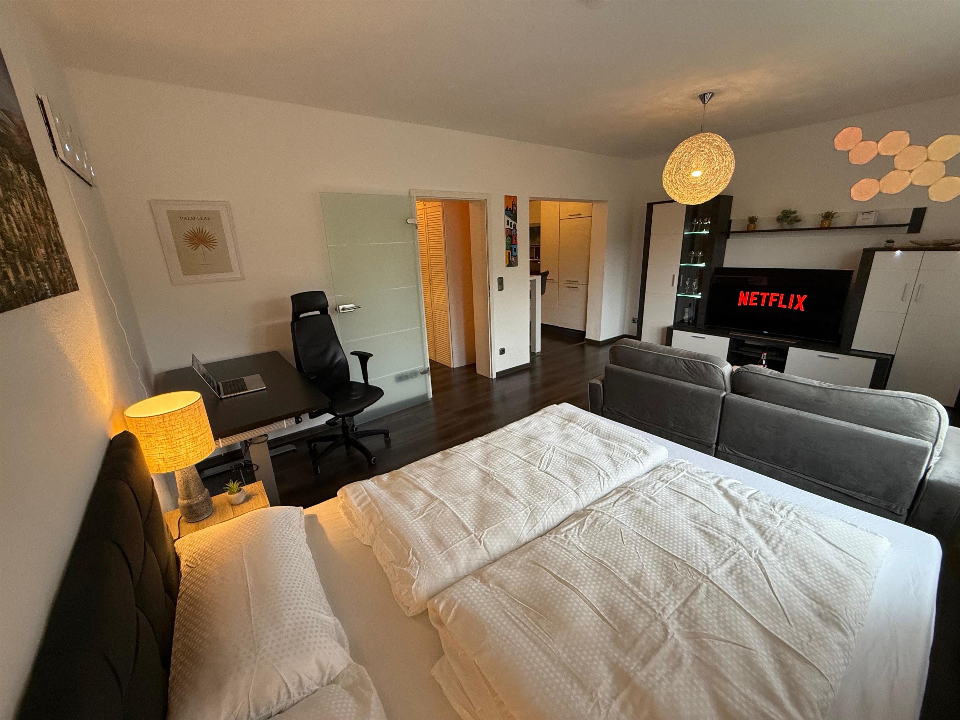 Die 40 m² große Unterkunft verfügt über eine voll ausgestattete Küche mit Kaffeemaschine, Mikrowelle, Backofen, Geschirrspüler und Waschmaschine mit Trocknerfunktion. Ein gemütlicher Wohnbereich mit Sofa, Esstisch und Flachbild-TV mit Streamingdiensten lädt zum Entspannen ein. Das Schlafzimmer ist mit einem komfortablen Doppelbett ausgestattet, und ein zusätzliches Einzelbett bietet Platz für eine dritte Person. Das moderne Bad verfügt über eine Dusche, Haartrockner und Handtücher.