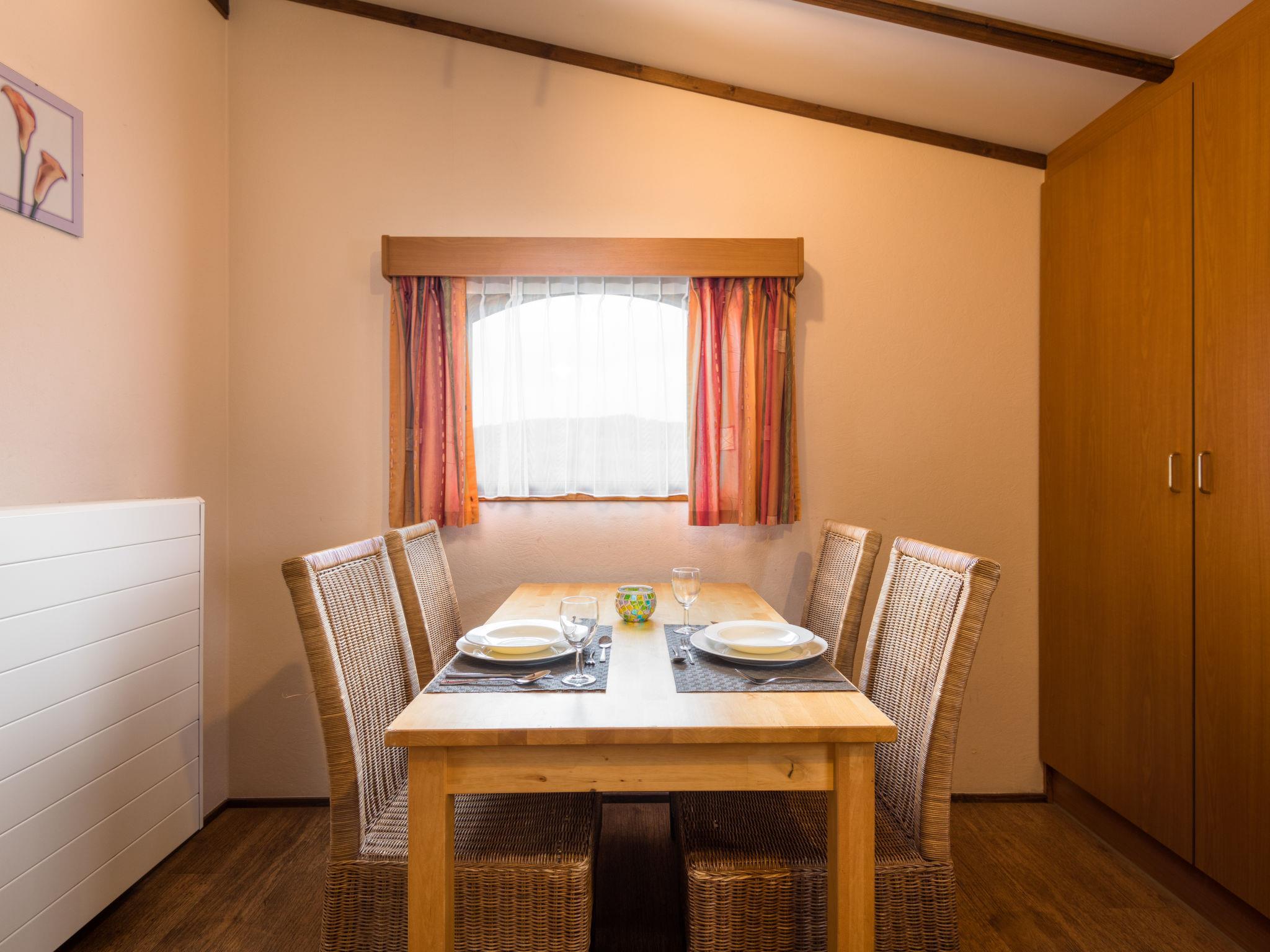 "Holzchalet A-D", 3-room bungalow 55 m2. Rustic and cosy furnishings: living/dining room 32 m2 with satellite TV (flat screen). Exit to the terrace. 1 room 6 m2 with 1 double bed (160 cm, length 190 cm). 1 room 6 m2 with 2 beds (80 cm, length 190 cm). Kitchenette (4 hot plates, dishwasher, kettle, microwave, electric coffee machine). Shower, sep. WC. Gas heating. Terrace 15 m2 partly roofed. Terrace furniture. Marvellous panoramic view of the mountains and the countryside. Facilities: baby cot (extra). Please note: non-smoking house. Maximum 2 pets/ dogs allowed. Smoke alarm, fire extinguisher. Four bungalows in wood construction. The pictures are only sample photos.