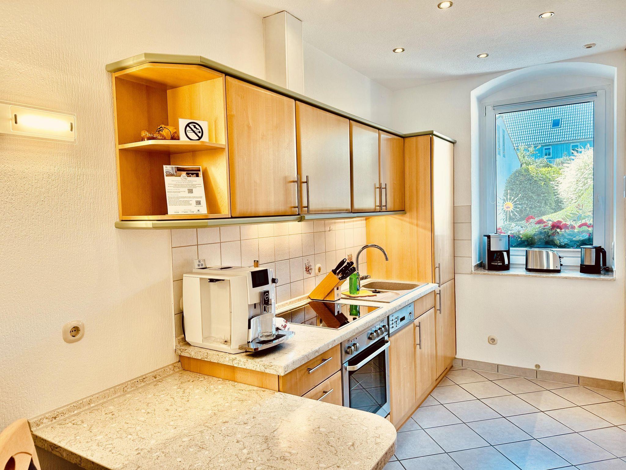 Die Küche mit Essbereich ist voll ausgestattet mit Geschirrspüler, Ceran-Kochfeld, Back- und Umluftröhre sowie einem Kühlschrank mit Gefrierteil. Kaffeevollautomat, klassische Kaffeemaschine, Wasserkocher, Toaster und Geschirr sind vorhanden.